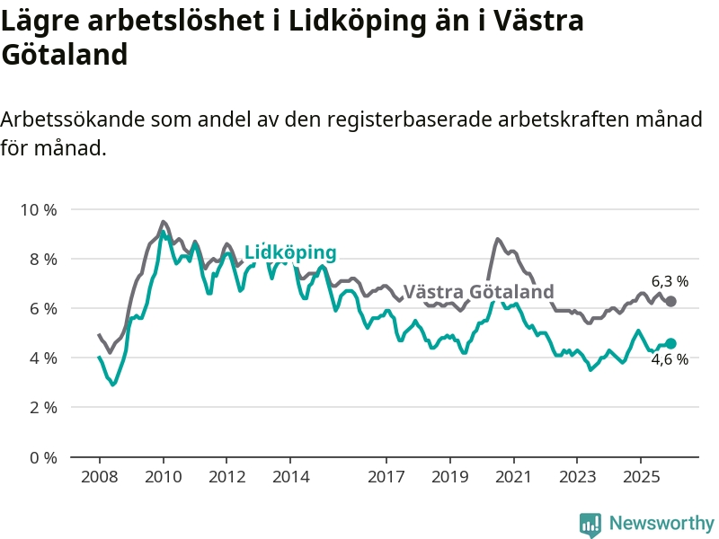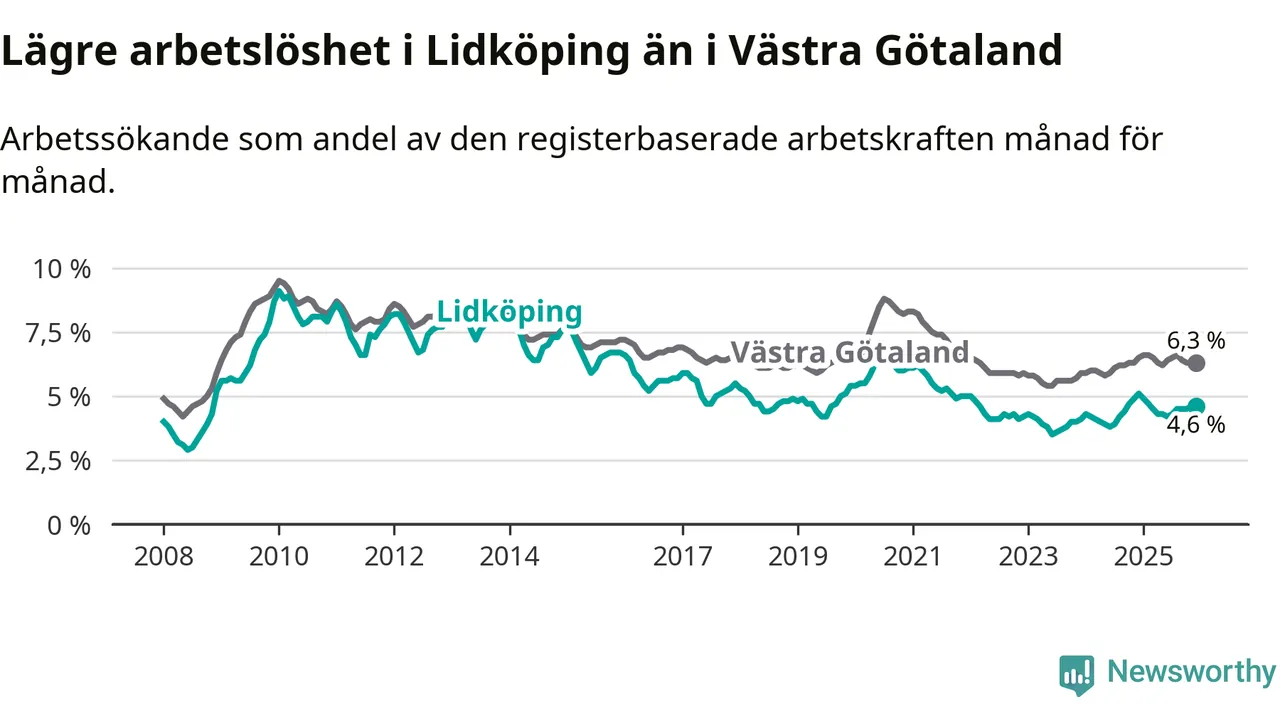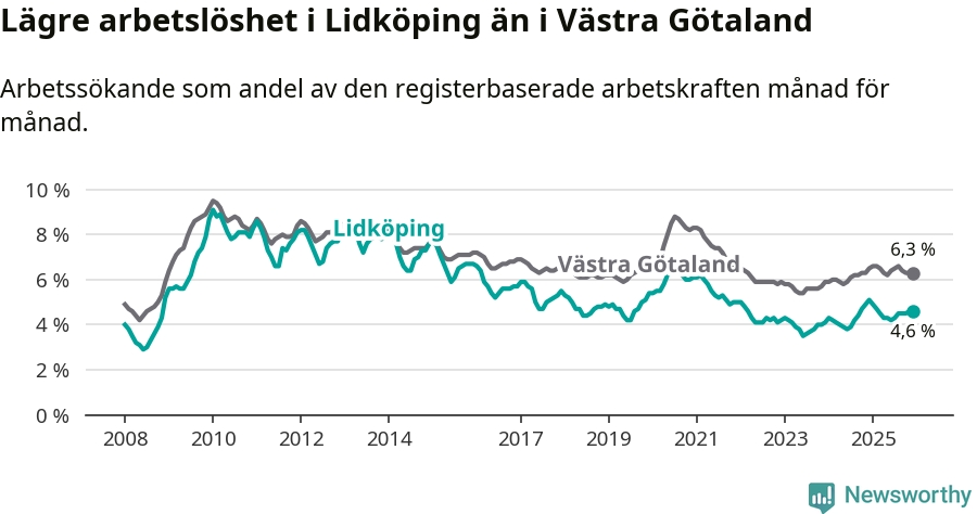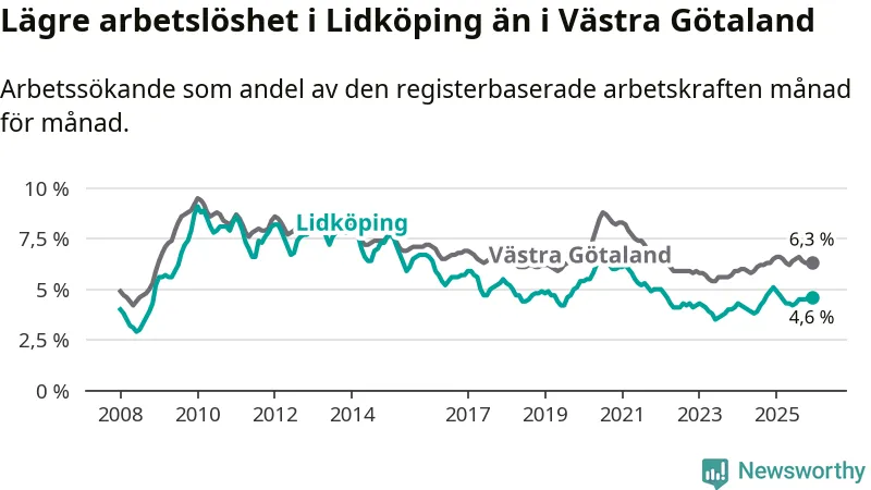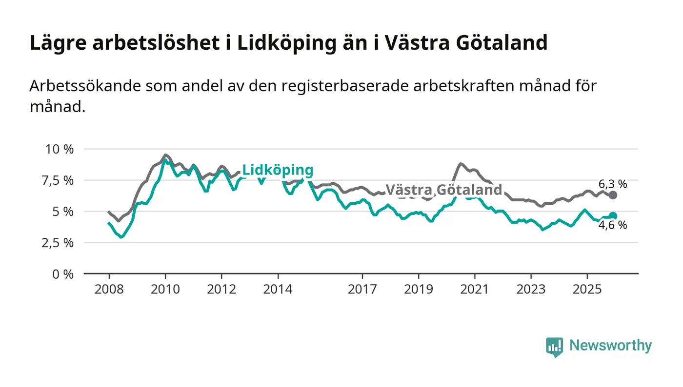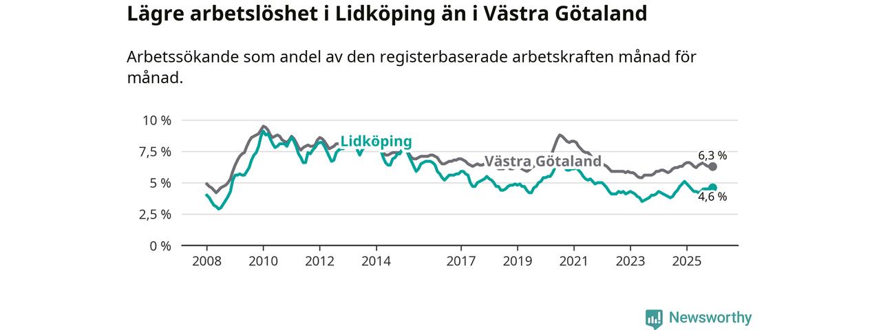 Under december månad rapporterade Lidköpings kommun en total arbetslöshet på 4,6 procent. Det är en minskning jämfört med samma tidpunkt i fjol (−0,5 procentenheter). Även i Västra Götalands län sjunker arbetslösheten .