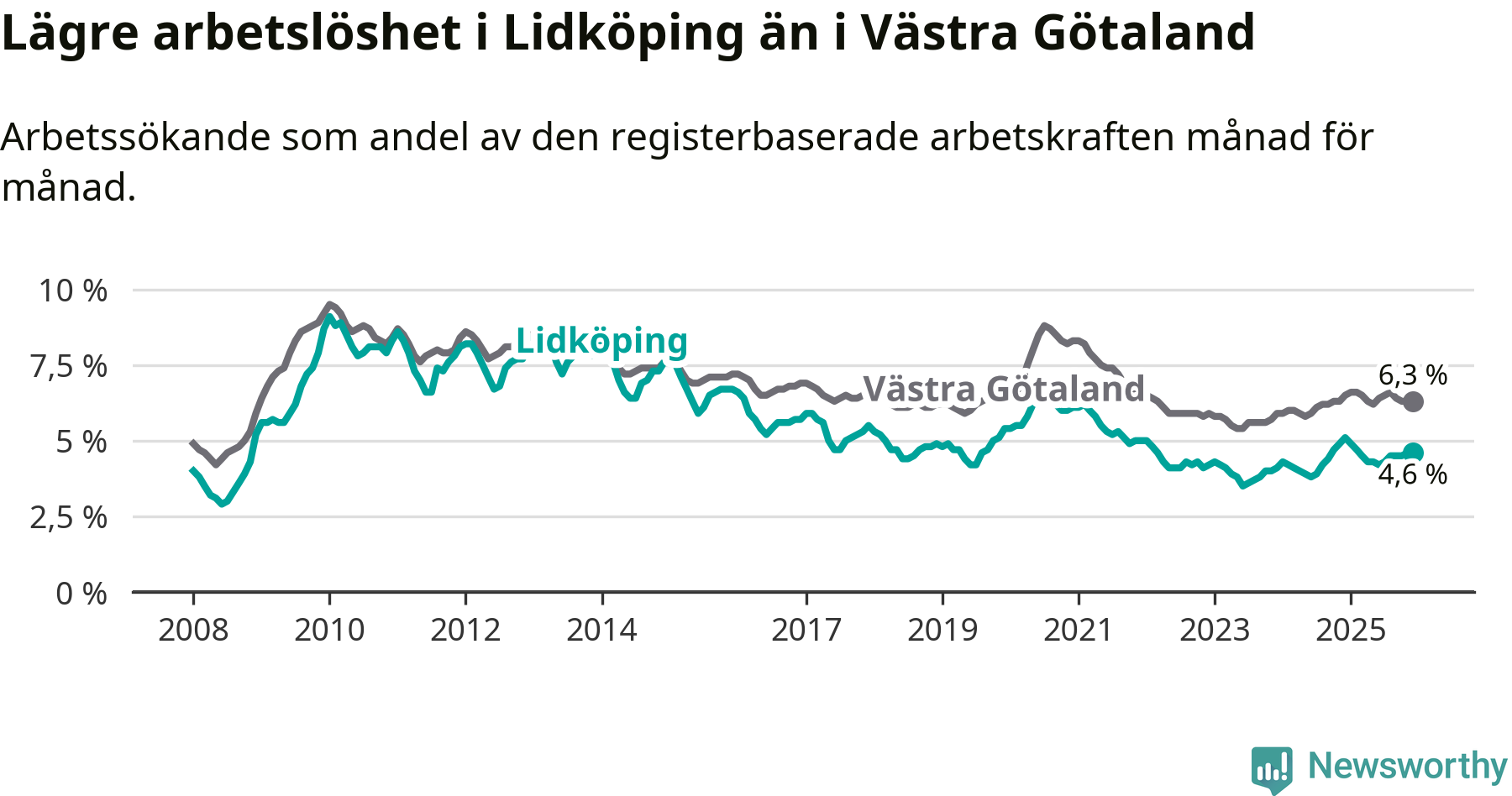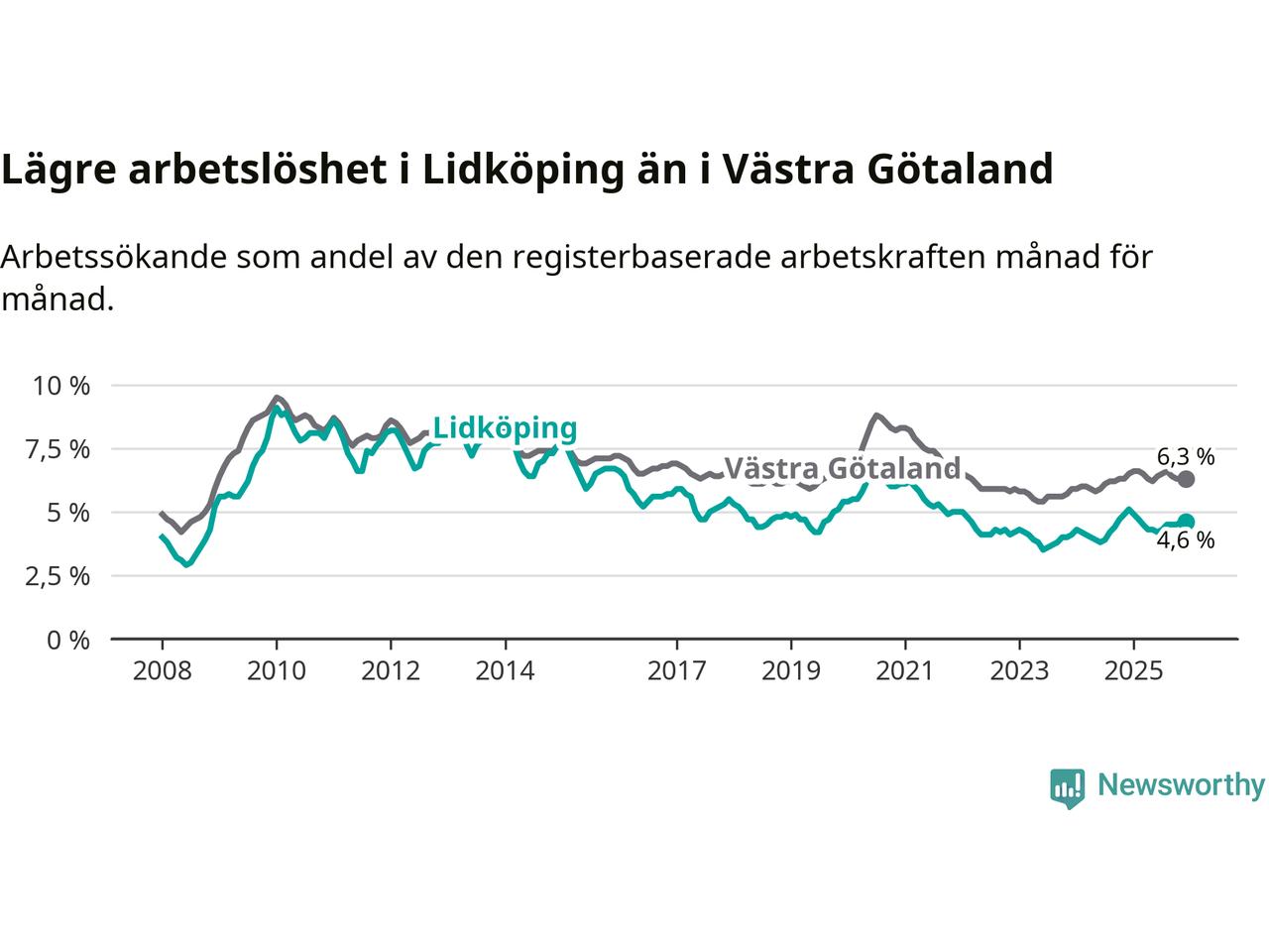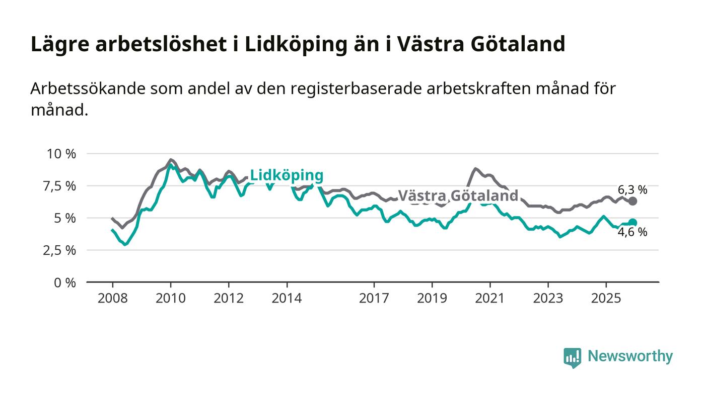 Lidköping hade redan tidigare lägre arbetslöshet än snittet i hela Västra Götalands län och nu växer klyftan (4,6 procent i kommunen, jämfört med 6,3 procent i hela länet). Öckerö har den lägsta arbetslösheten i länet (3,0 procent), medan Gullspång har den högsta (8,8 procent). För att Lidköping skulle komma ner i samma arbetslöshetsnivå som Öckerö skulle 320 personer behöva sysselsättas.