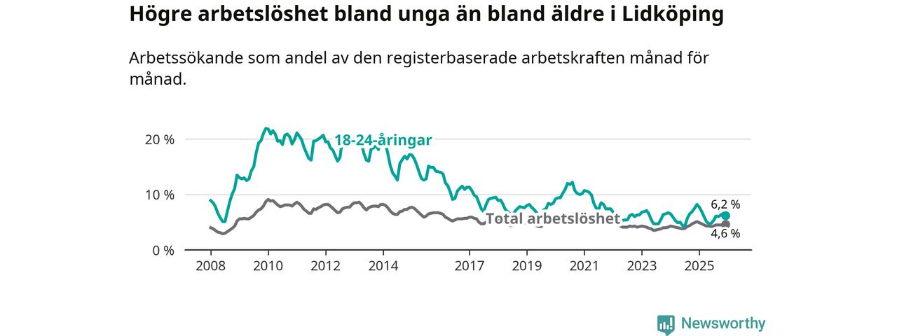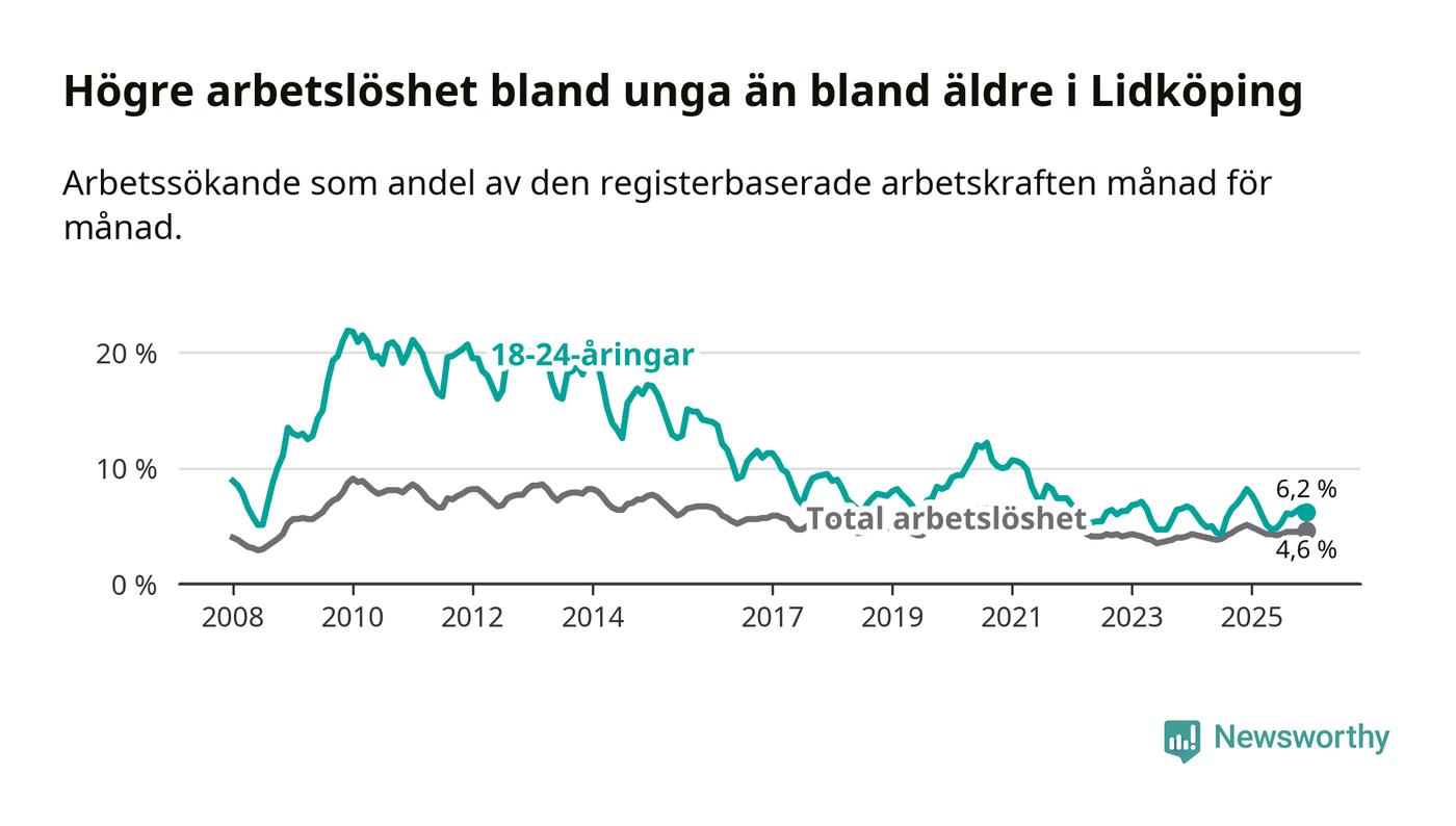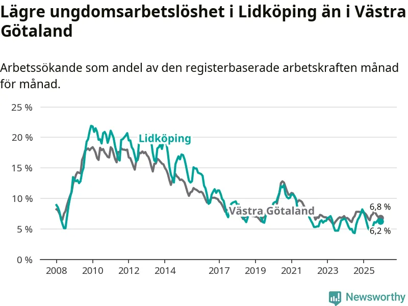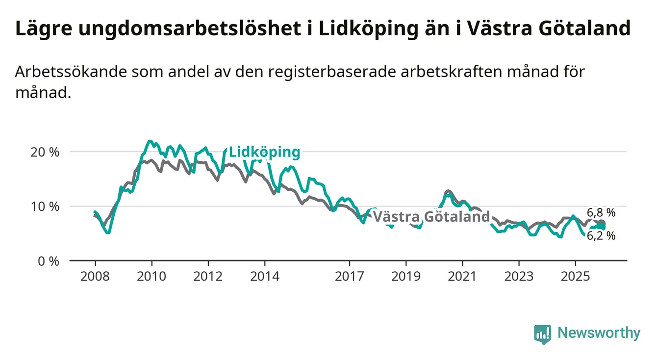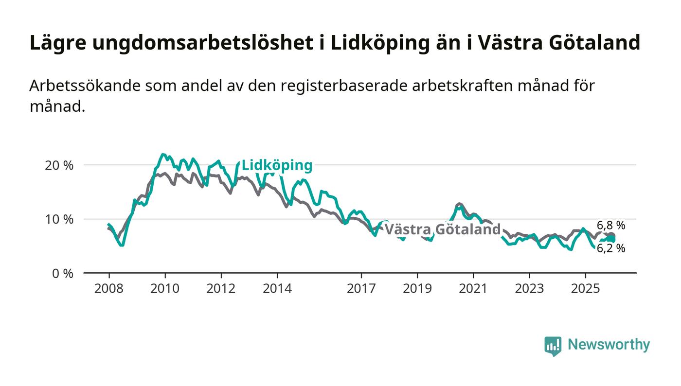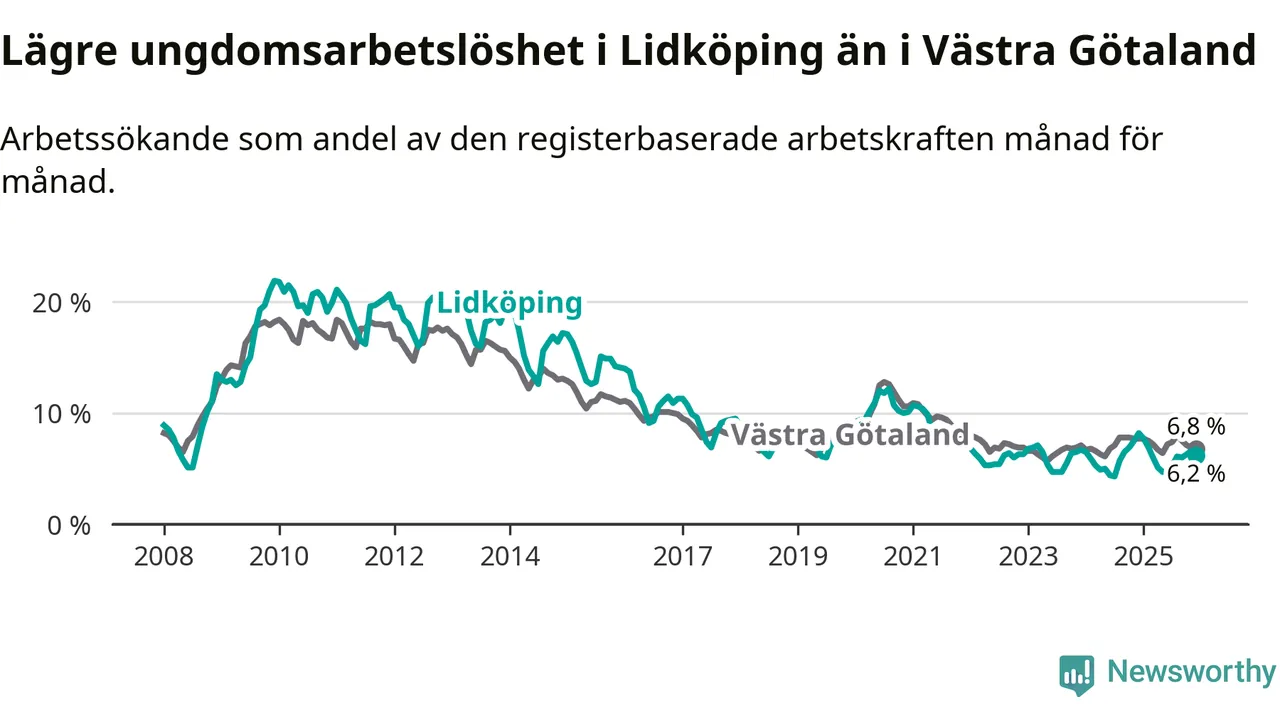 Precis som den totala arbetslösheten ligger ungdomsarbetslösheten i Lidköping lägre än i Västra Götaland som helhet. Skillnaden mellan kommunen och länet är 0,6 procentenheter.