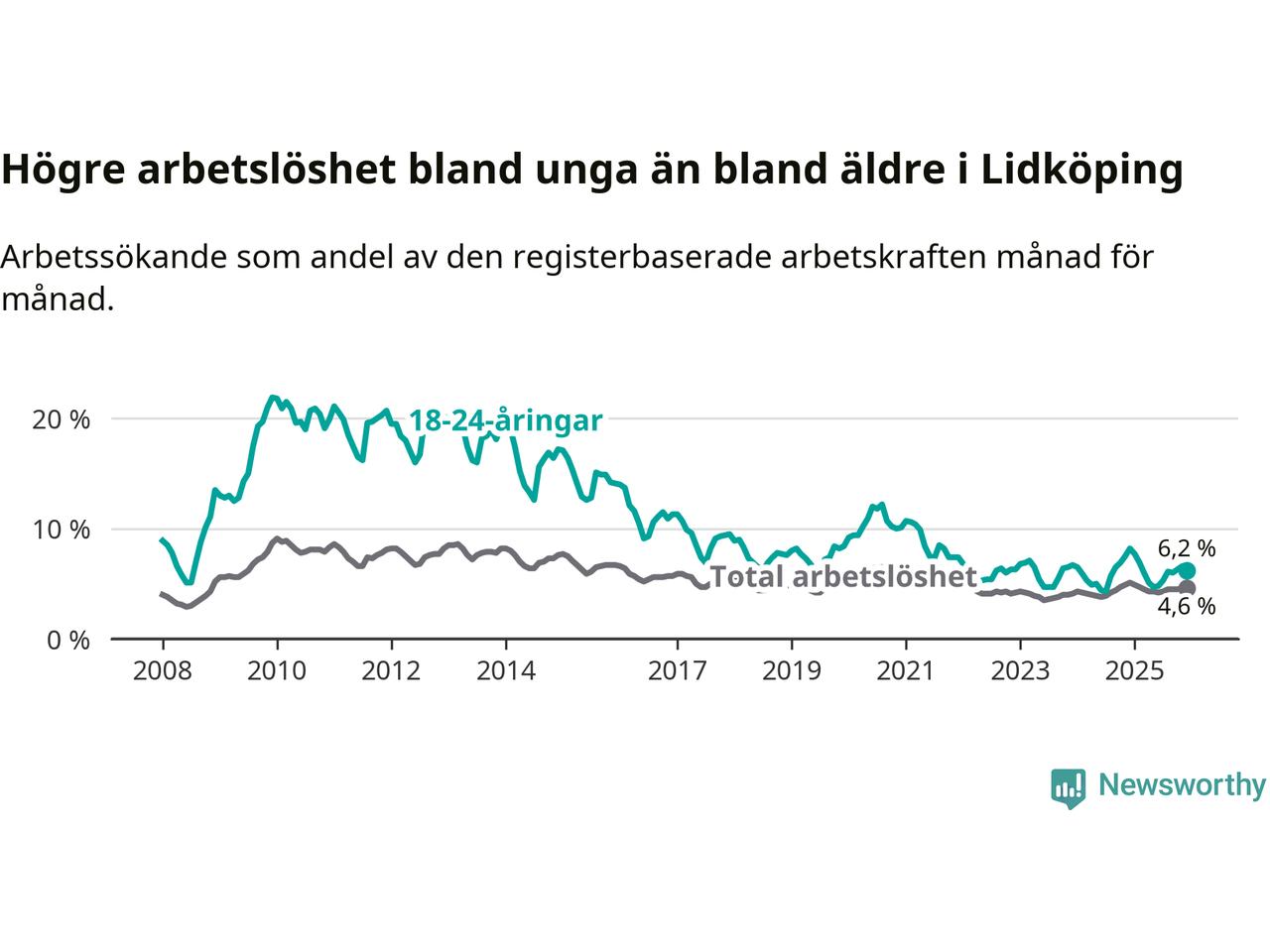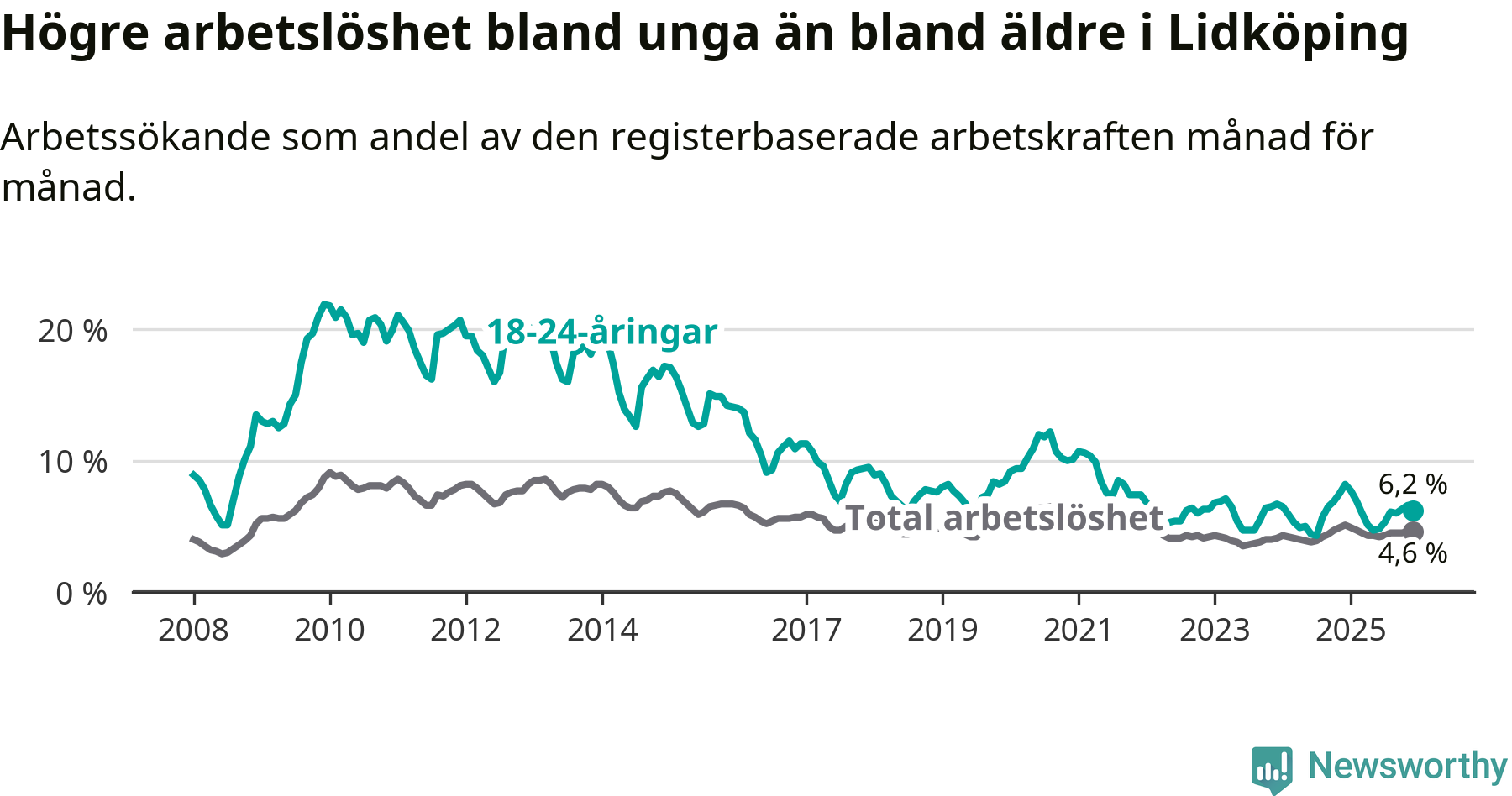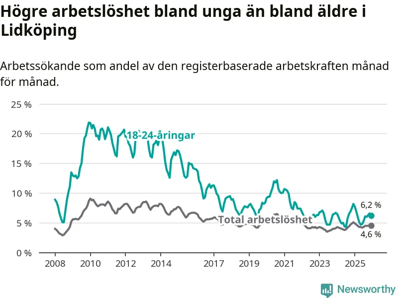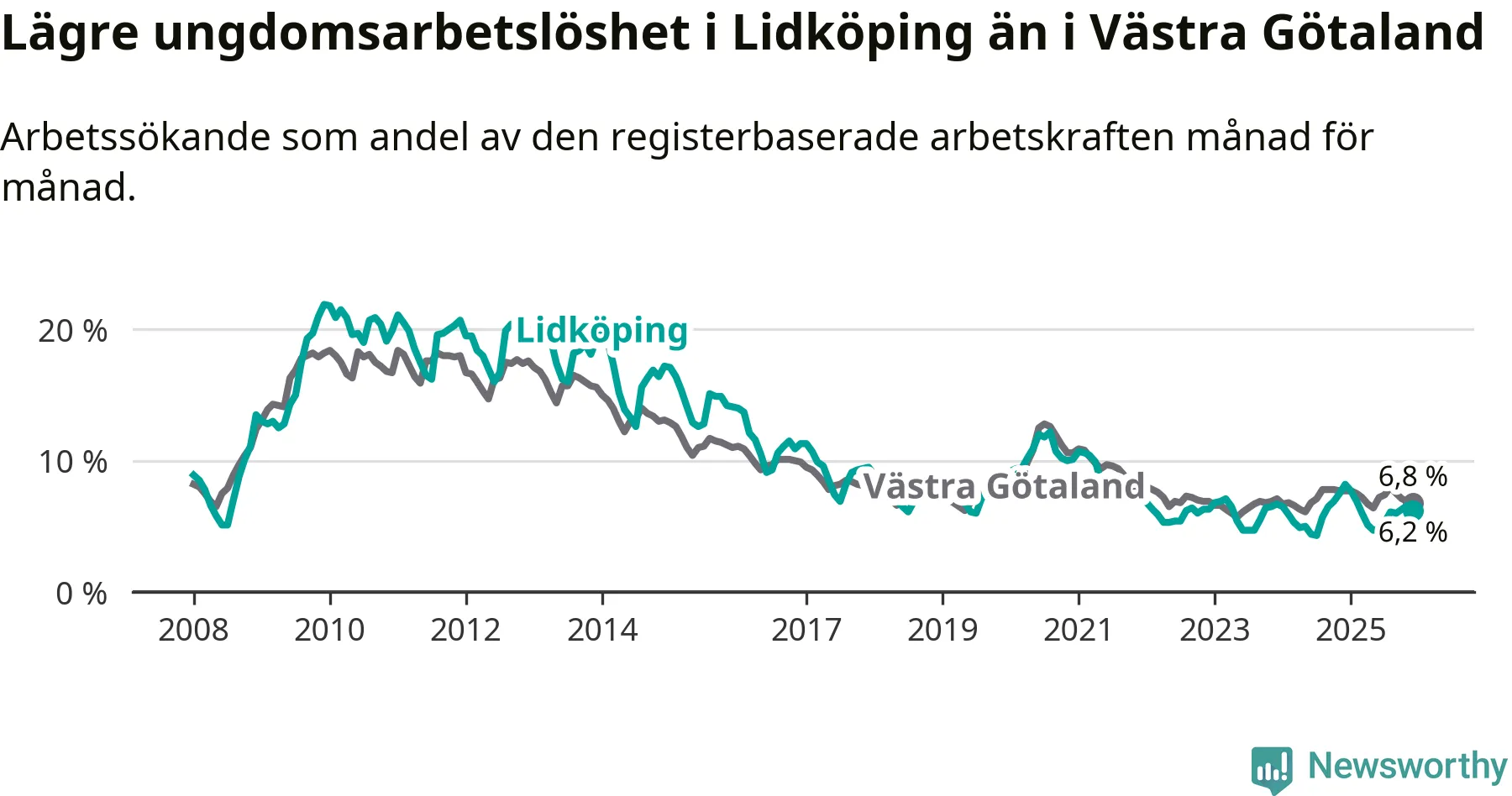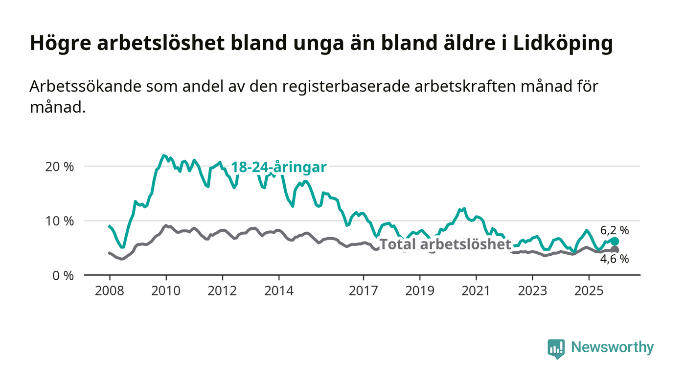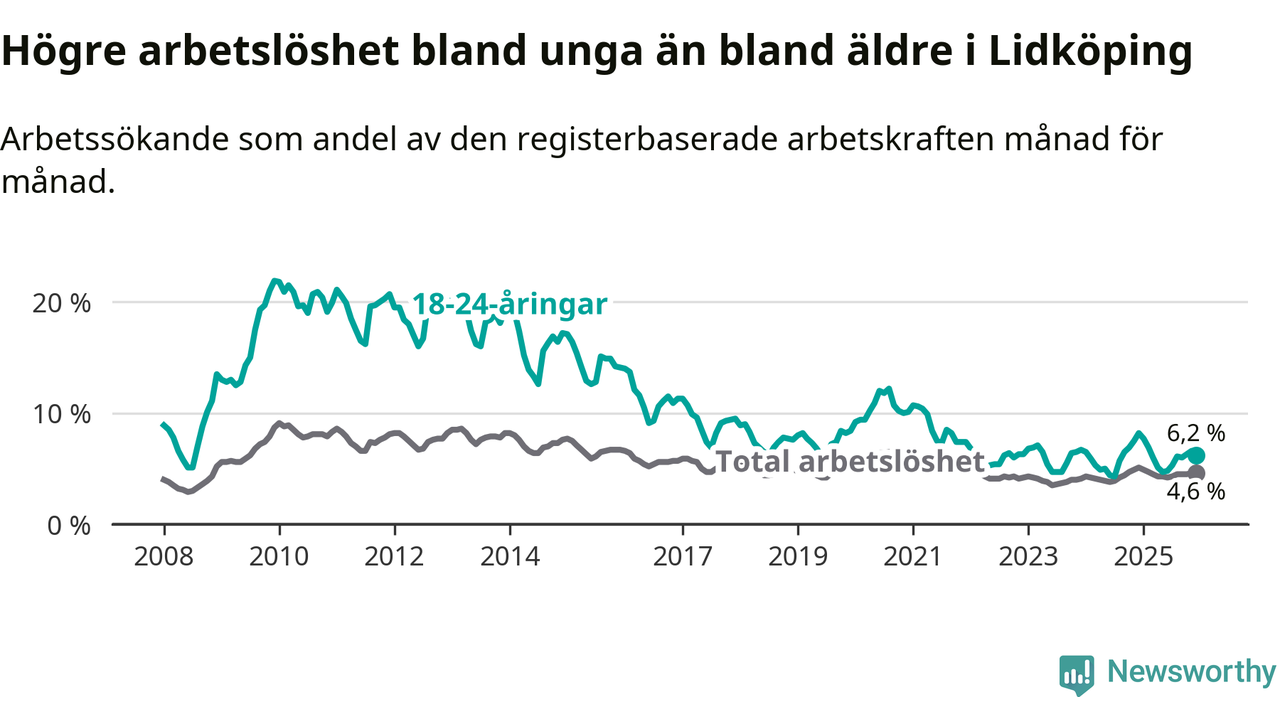 Precis som den totala arbetslösheten ligger ungdomsarbetslösheten i Lidköping lägre än i Västra Götaland som helhet. Skillnaden mellan kommunen och länet är 0,6 procentenheter.