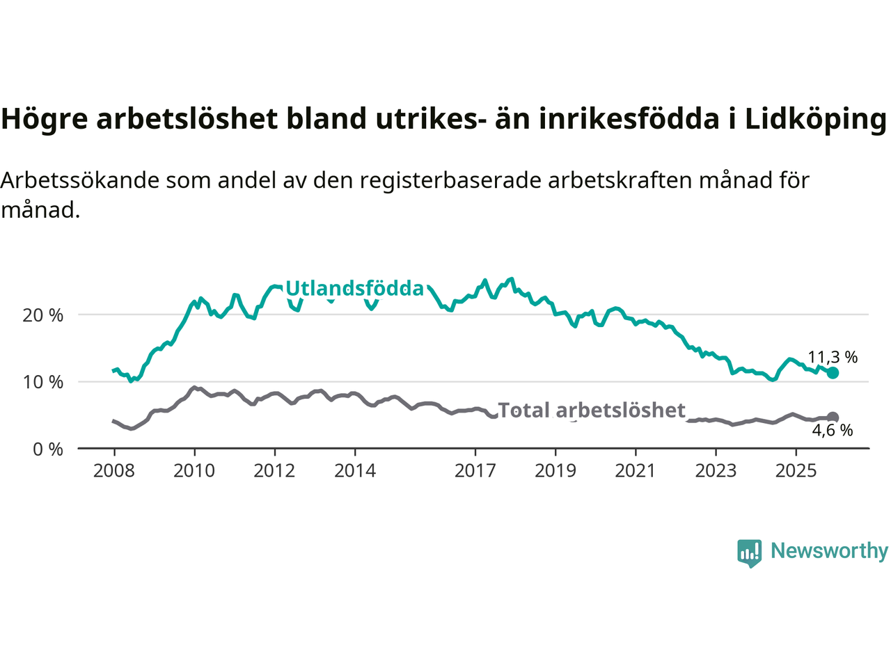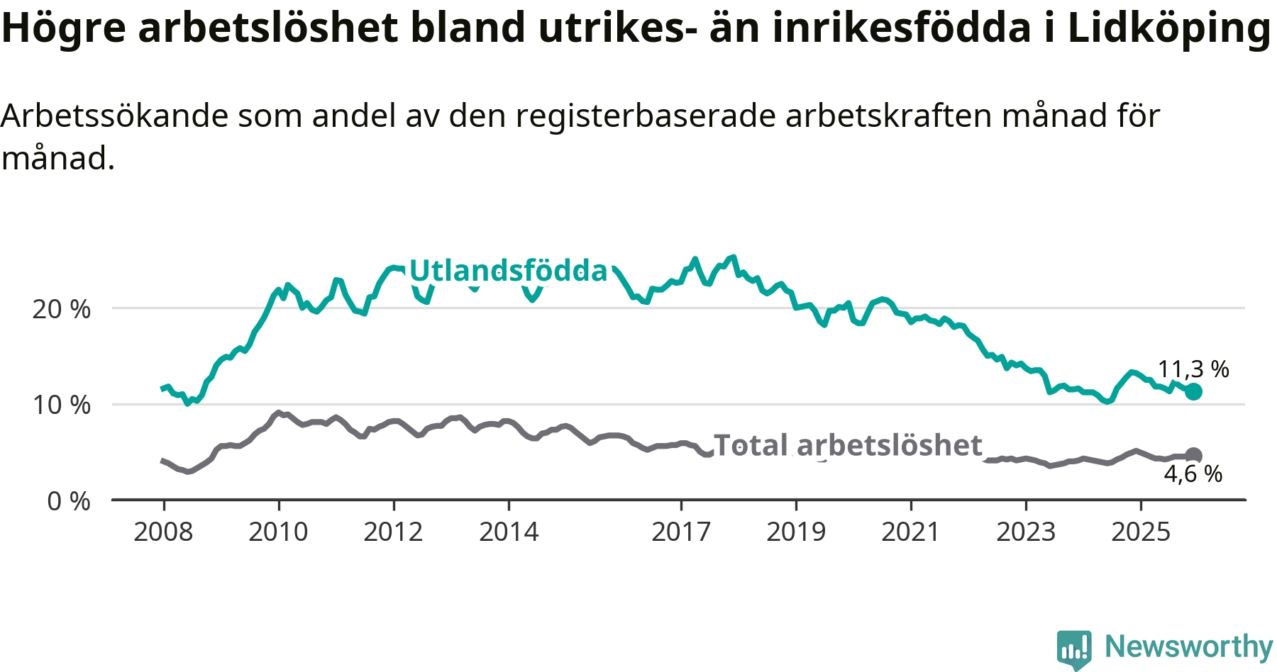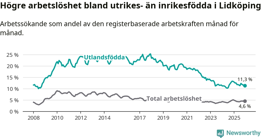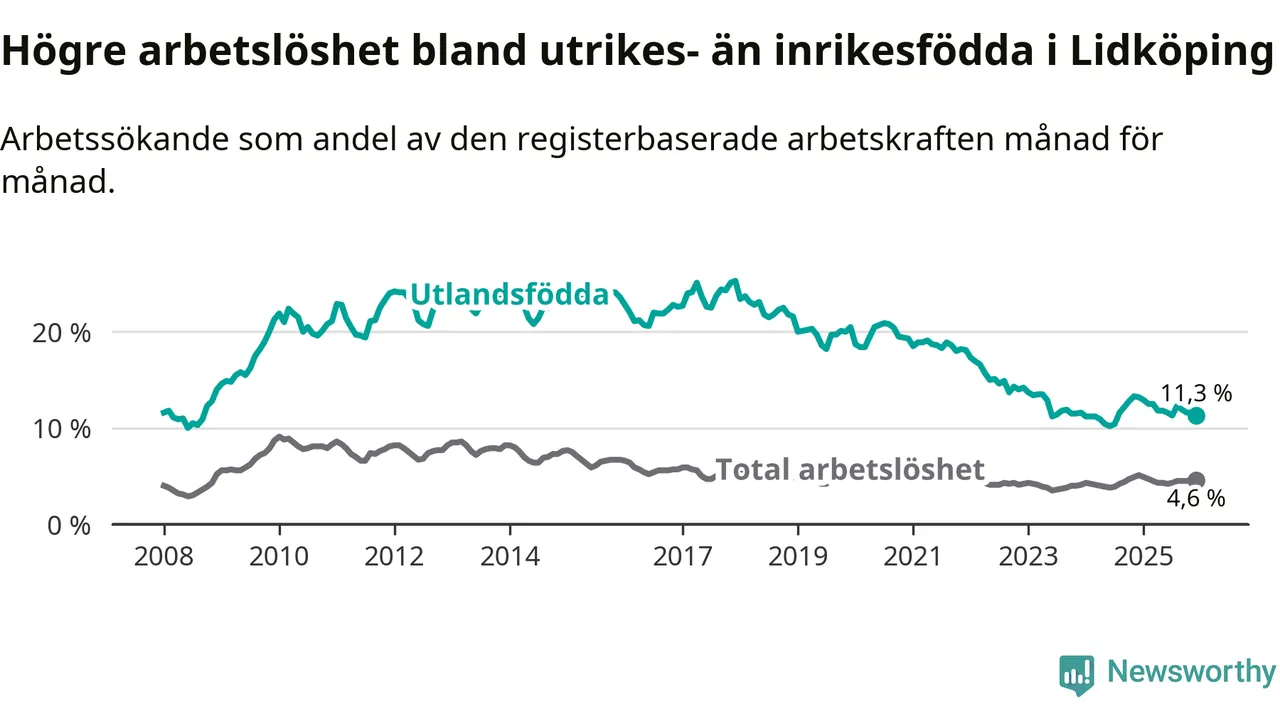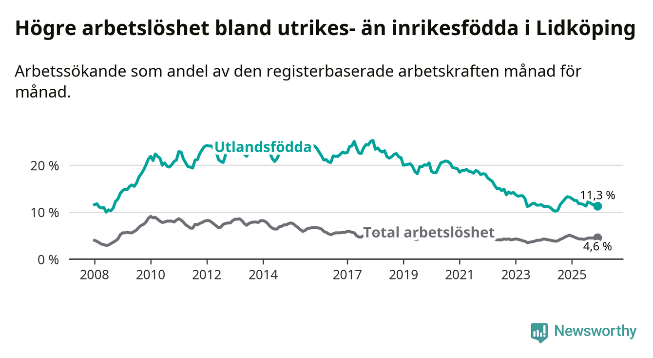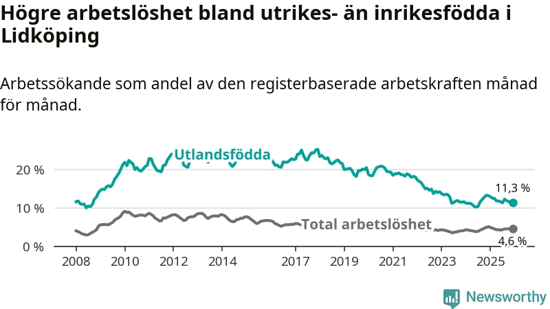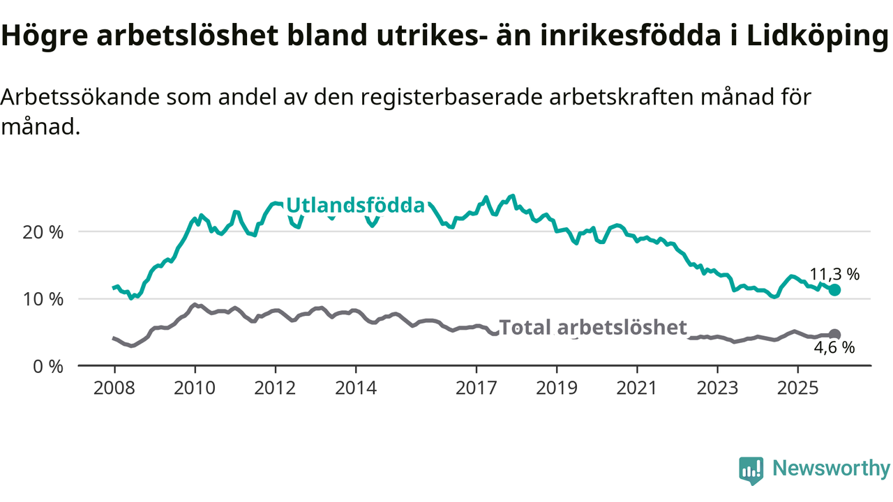 | Bland utlandsfödda | 11,3 % | −1,9 % ▼ | 13,4 % | −1,0 % ▼ | 14,3 % | −1,4 % ▼ |