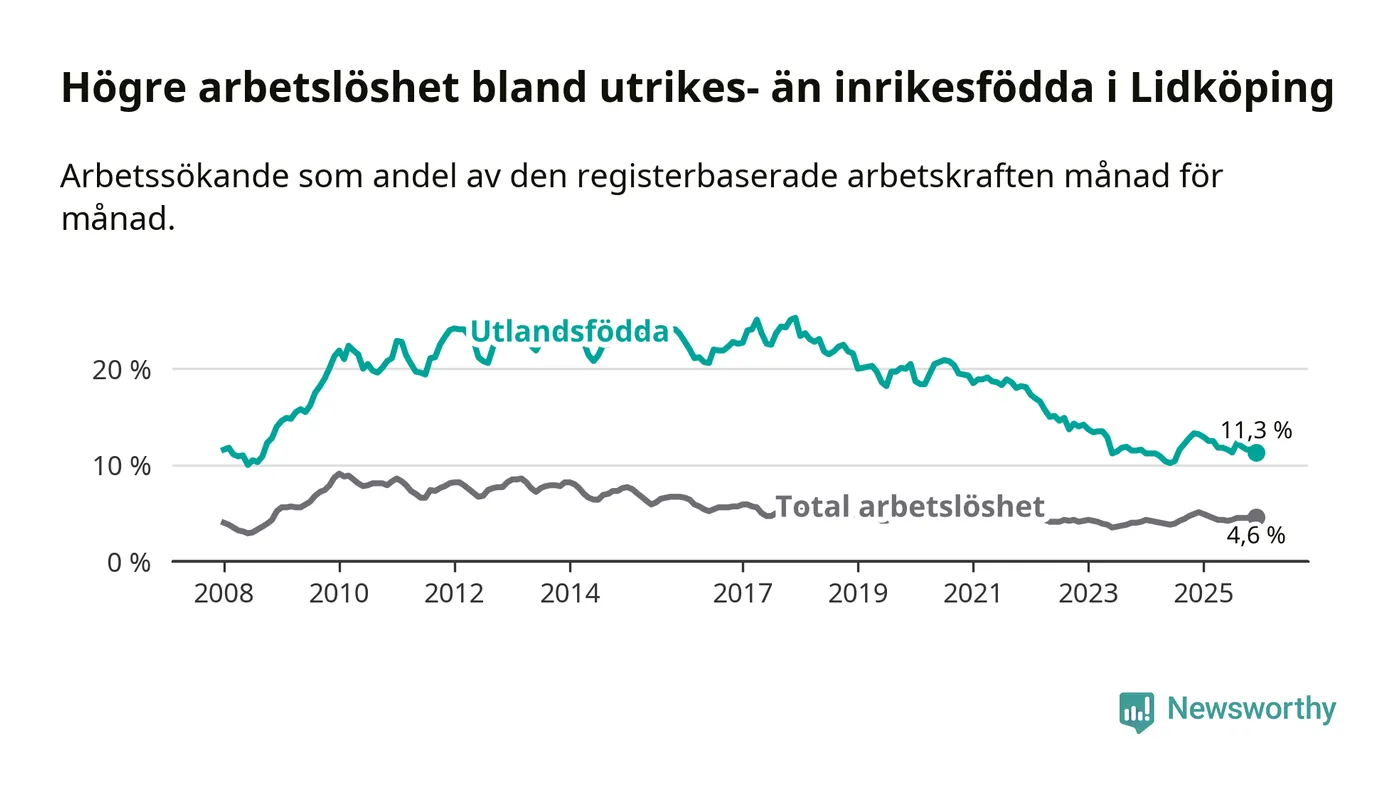 Skillnaden i arbetslöshet mellan utrikesfödda och hela befolkningen är 6,7 procentenheter i Lidköping. Det är en mindre skillnad än för ett år sedan (−1,4 procentenheter).