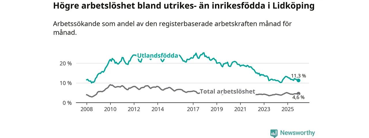 Arbetslösheten bland utlandsfödda var 11,3 procent i Lidköping under december månad, motsvarande 320 av 2 832 personer. Det är 1,9 procentenheter färre än vid samma tidpunkt i fjol (−46 om man räknar personer).