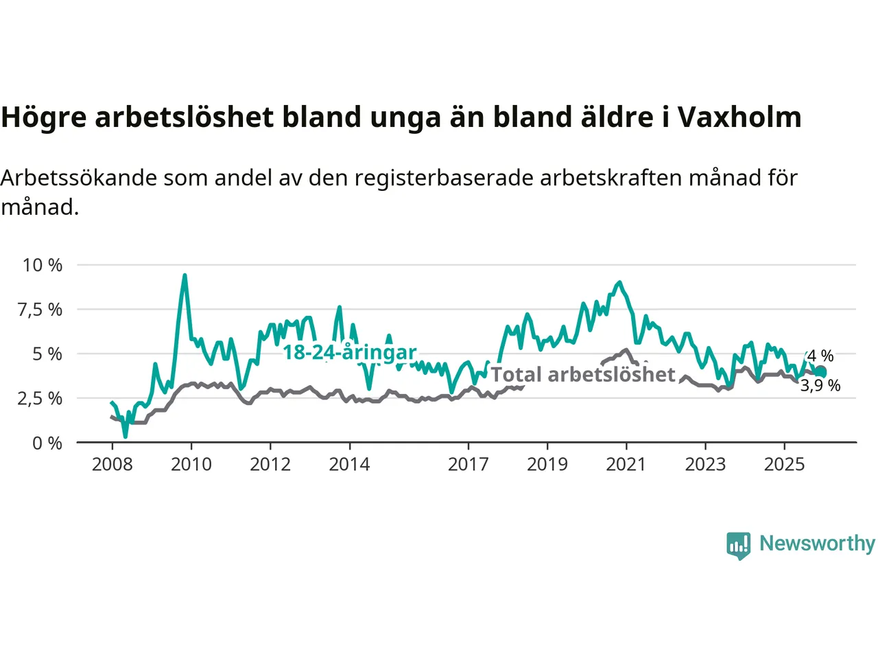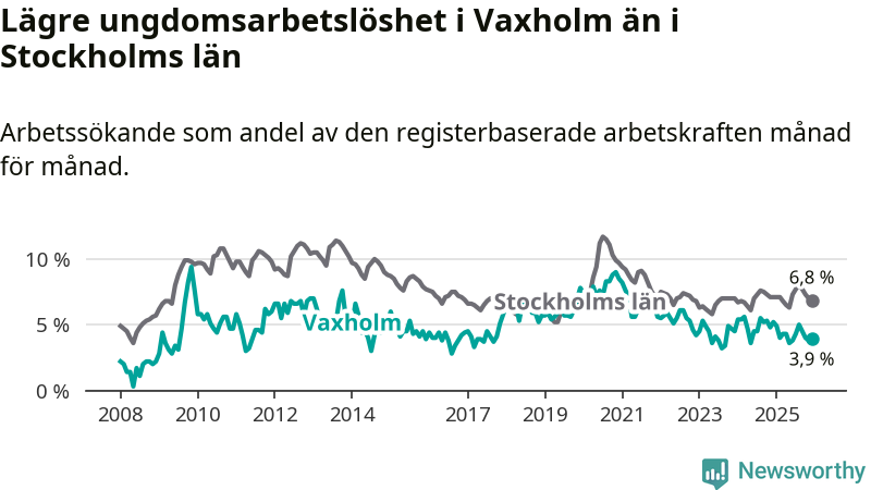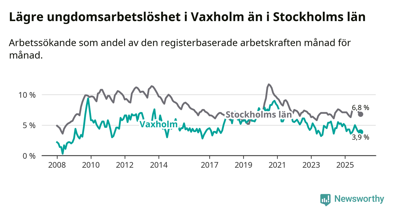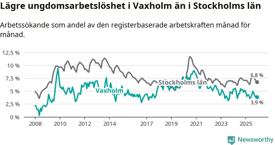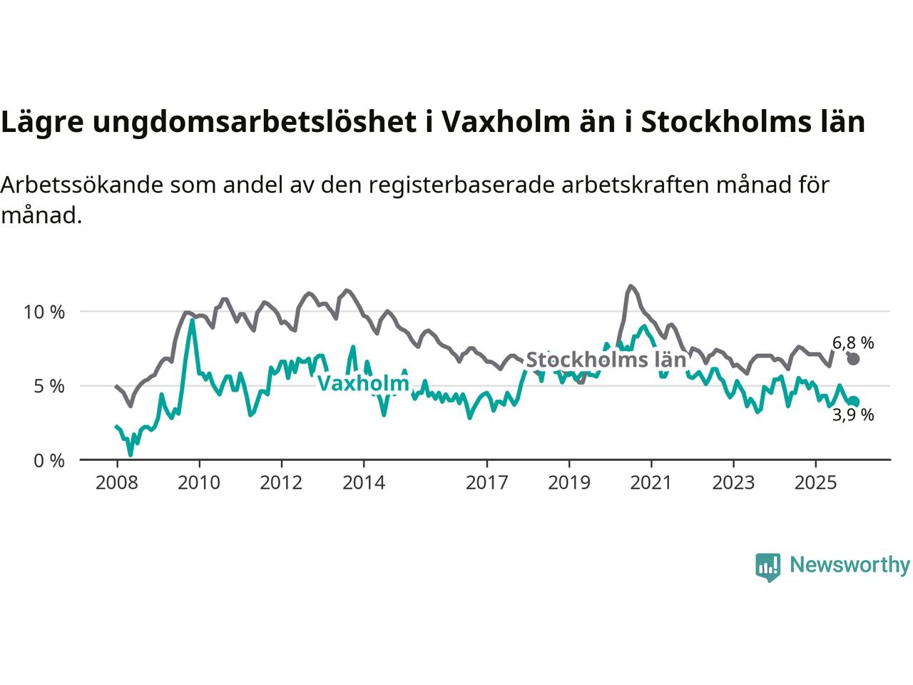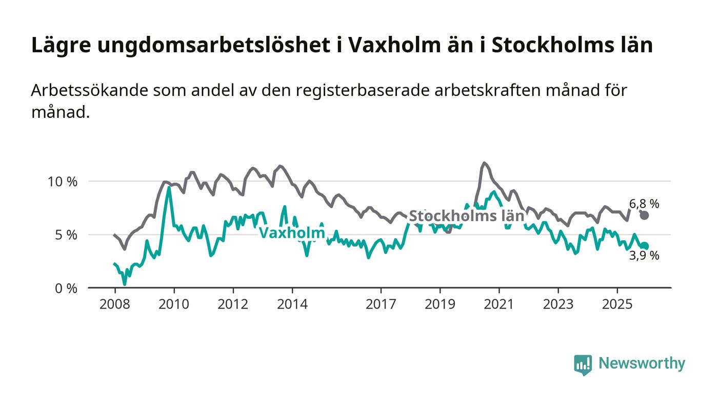 I och med den senaste månadens nedgång har de ungas arbetslöshet i Vaxholm sjunkit sju månader i följd (ner från 3,6 procent i maj 2025 till 3,9 procent nu).