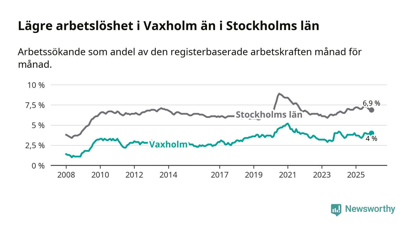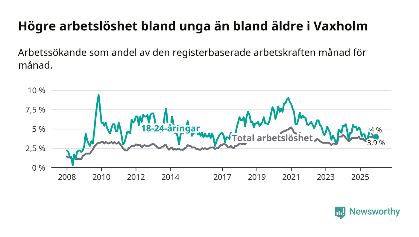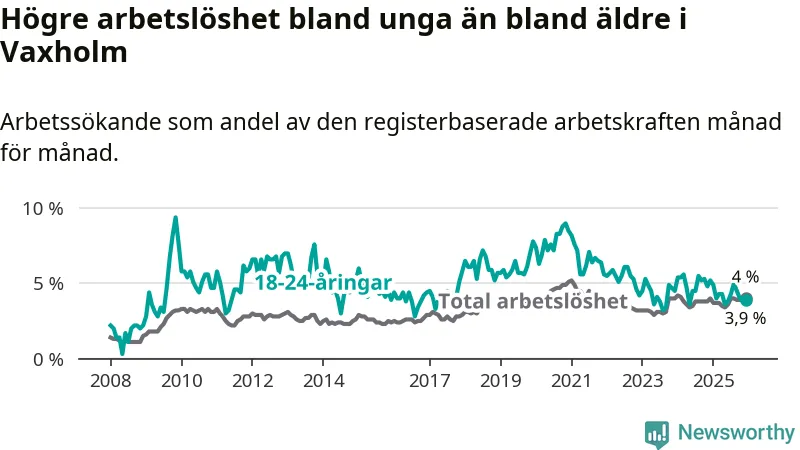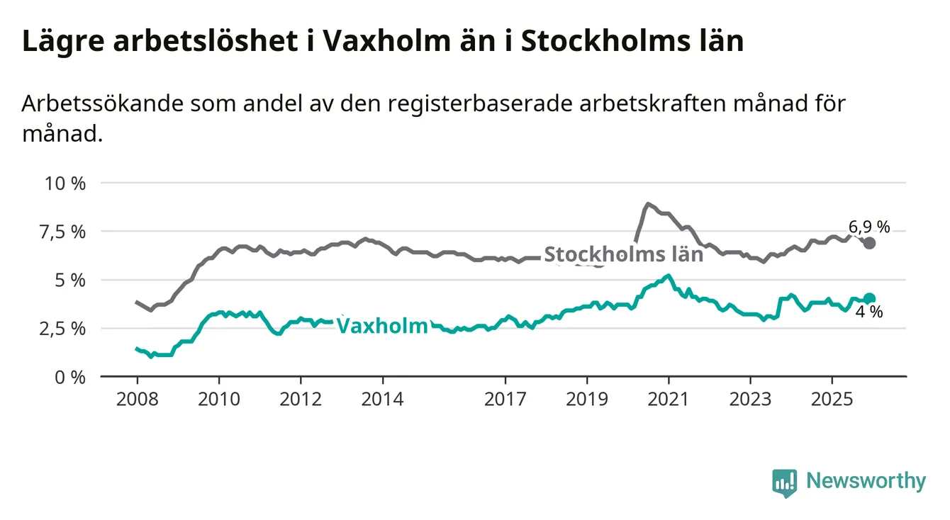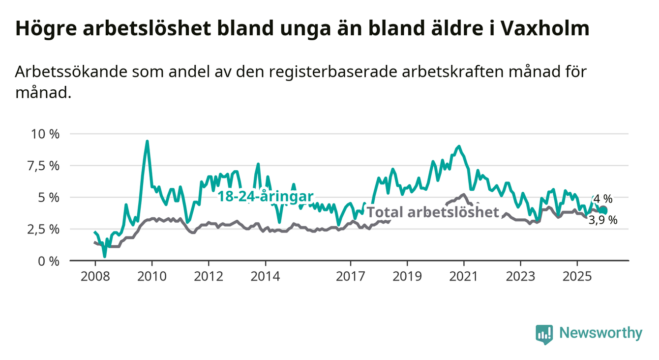 I och med den senaste månadens nedgång har de ungas arbetslöshet i Vaxholm sjunkit sju månader i följd (ner från 3,6 procent i maj 2025 till 3,9 procent nu).