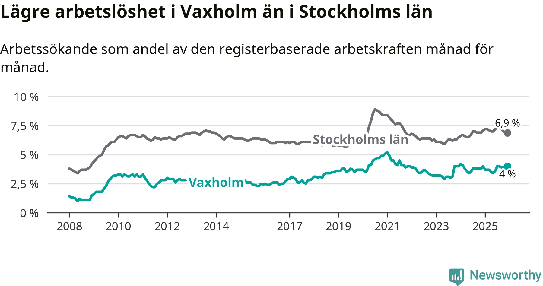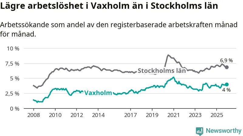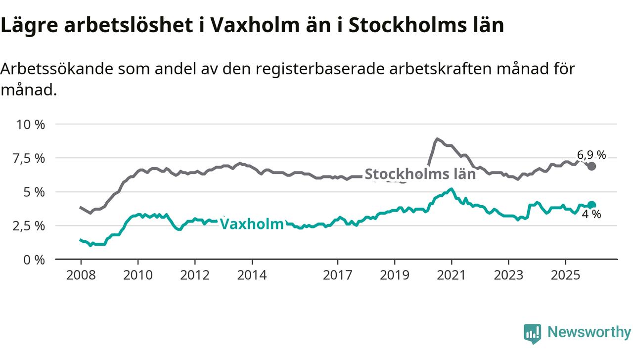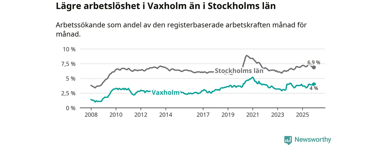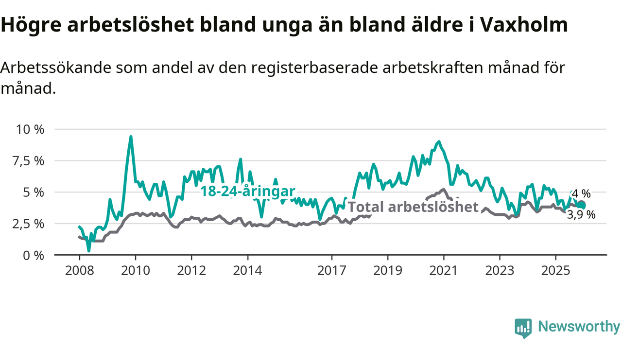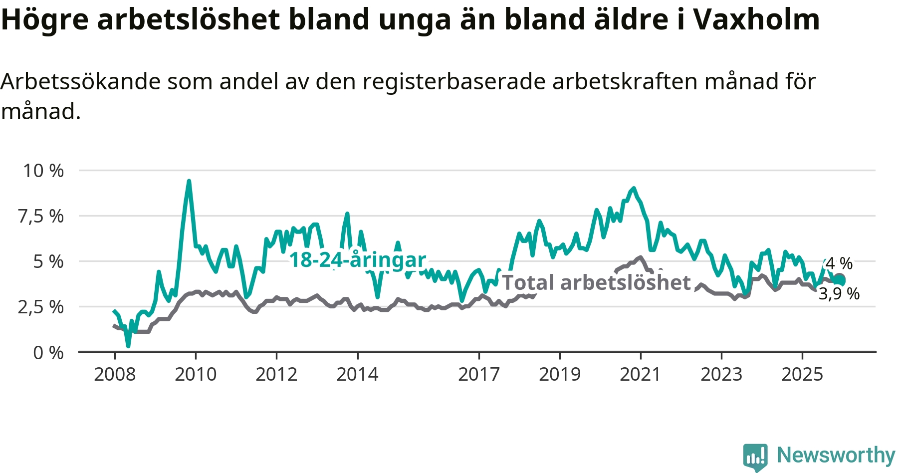 I och med den senaste månadens nedgång har de ungas arbetslöshet i Vaxholm sjunkit sju månader i följd (ner från 3,6 procent i maj 2025 till 3,9 procent nu).