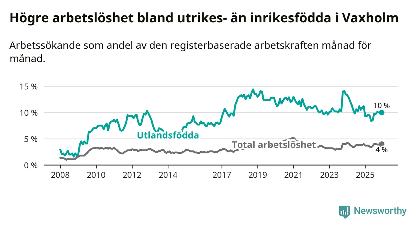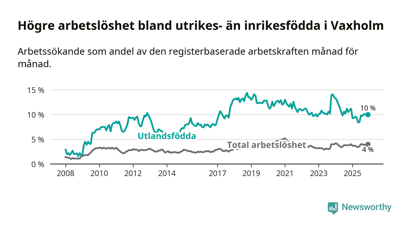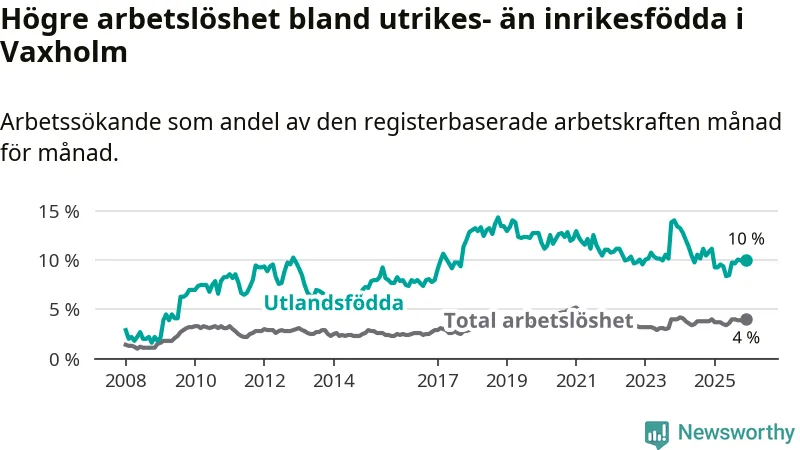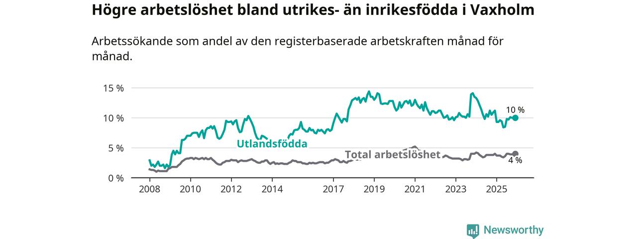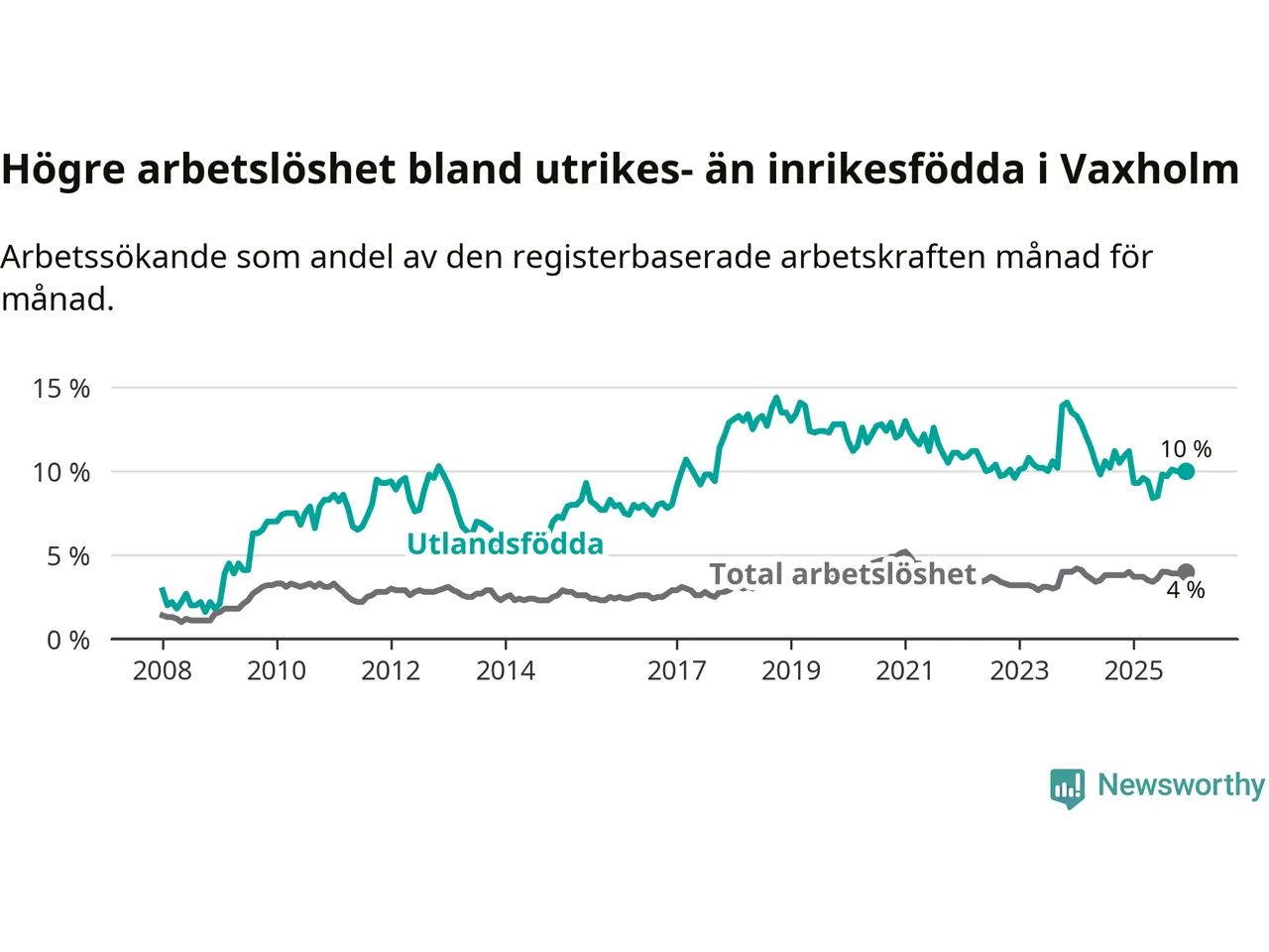Arbetslösheten bland utlandsfödda var 10,0 procent i Vaxholm under december månad, motsvarande 69 av 690 personer. Det är 1,2 procentenheter färre än vid samma tidpunkt i fjol (−9 om man räknar personer). Därmed är de utlandsföddas arbetslöshet lägre än vid samma tidpunkt i fjol för 15:e månaden i följd. Sedan september 2024 har arbetslösheten bland utlandsfödda minskat från 11,2 till 10,0 procent.