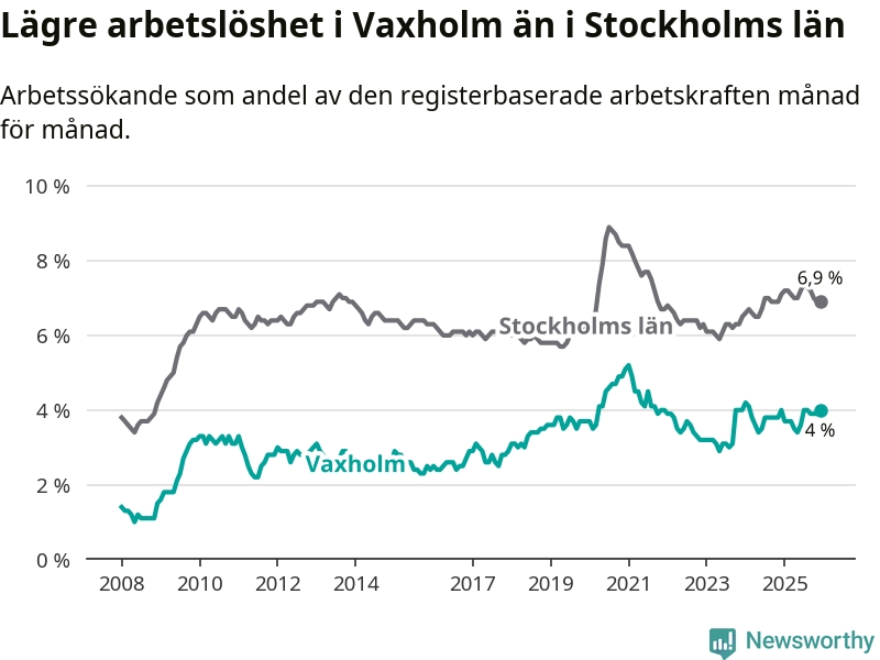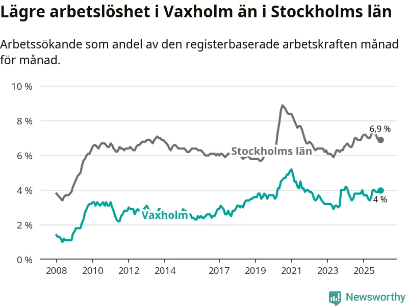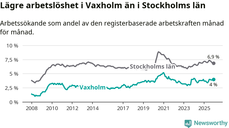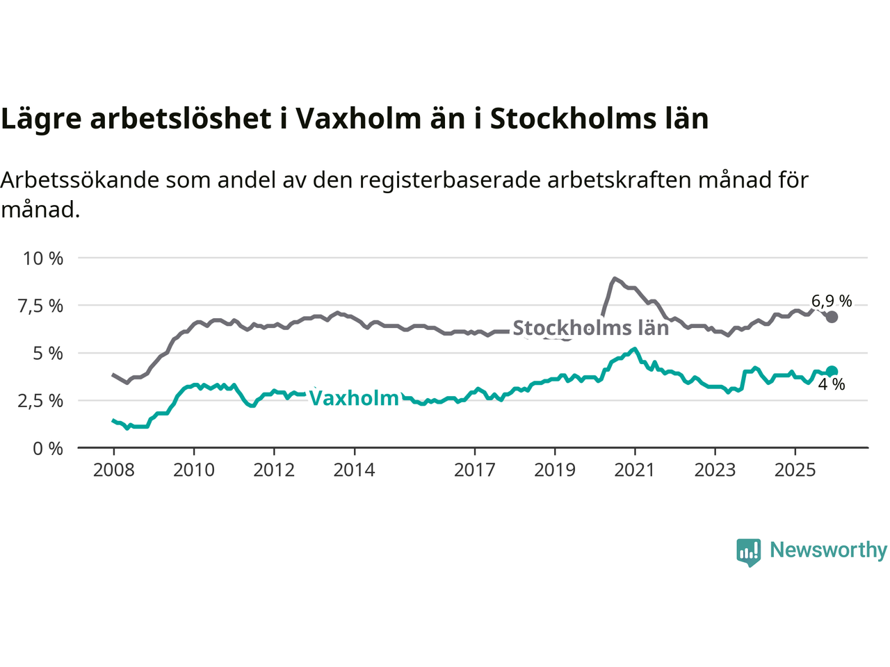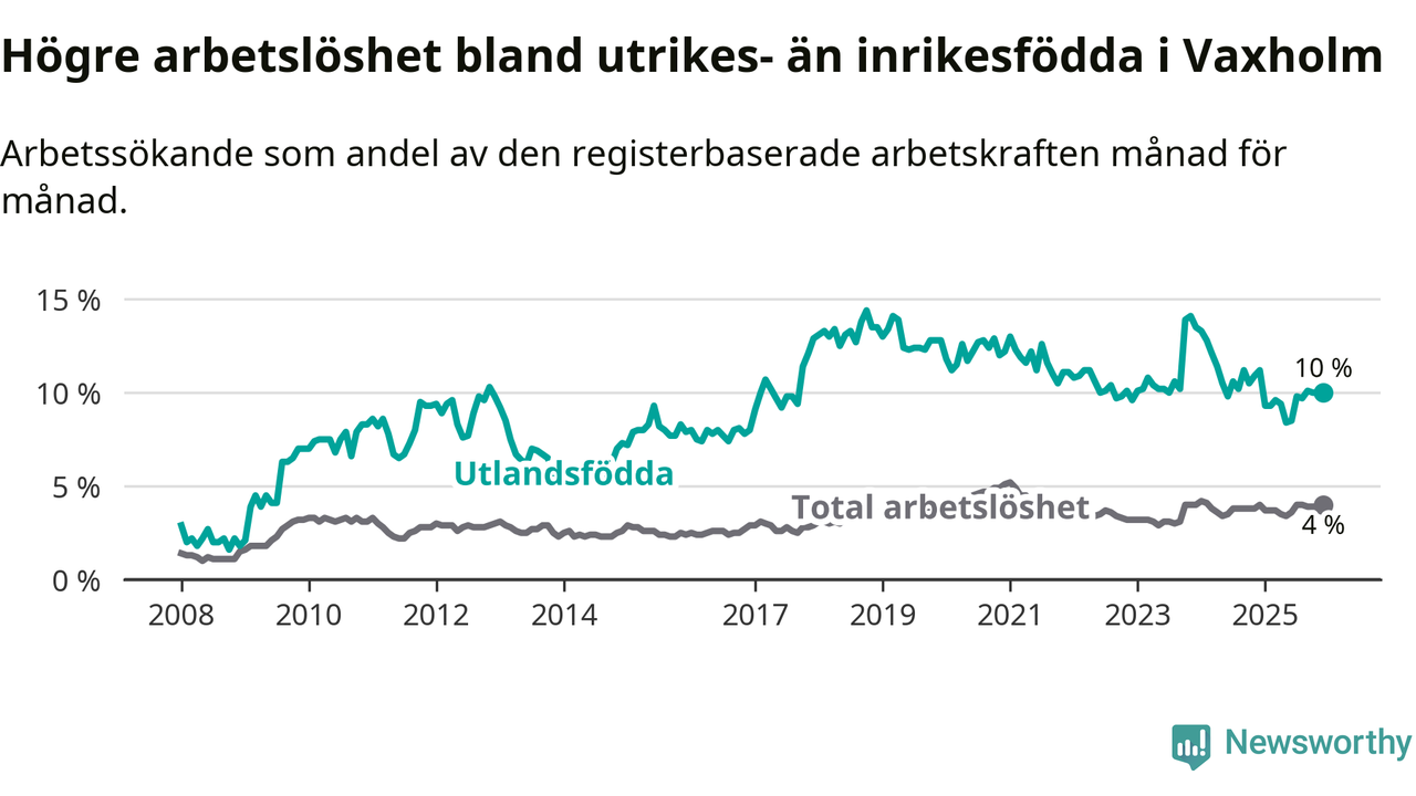 Arbetslösheten bland utlandsfödda var 10,0 procent i Vaxholm under december månad, motsvarande 69 av 690 personer. Det är 1,2 procentenheter färre än vid samma tidpunkt i fjol (−9 om man räknar personer). Därmed är de utlandsföddas arbetslöshet lägre än vid samma tidpunkt i fjol för 15:e månaden i följd. Sedan september 2024 har arbetslösheten bland utlandsfödda minskat från 11,2 till 10,0 procent.