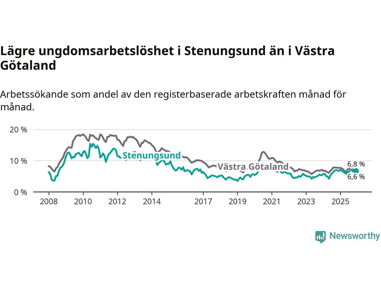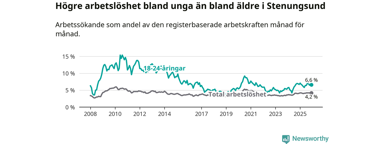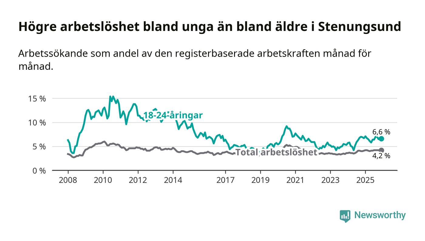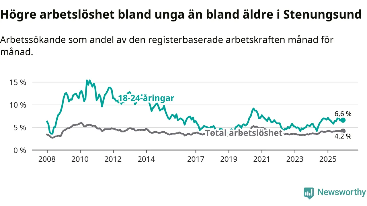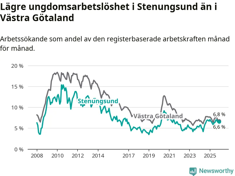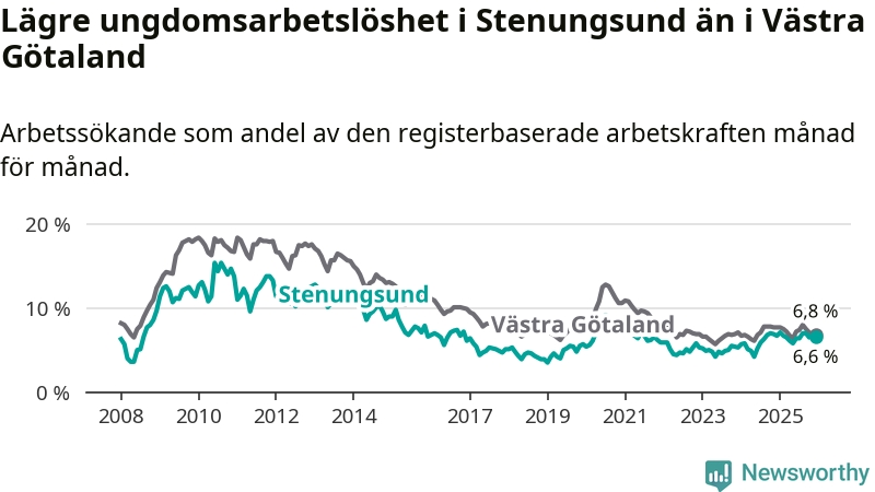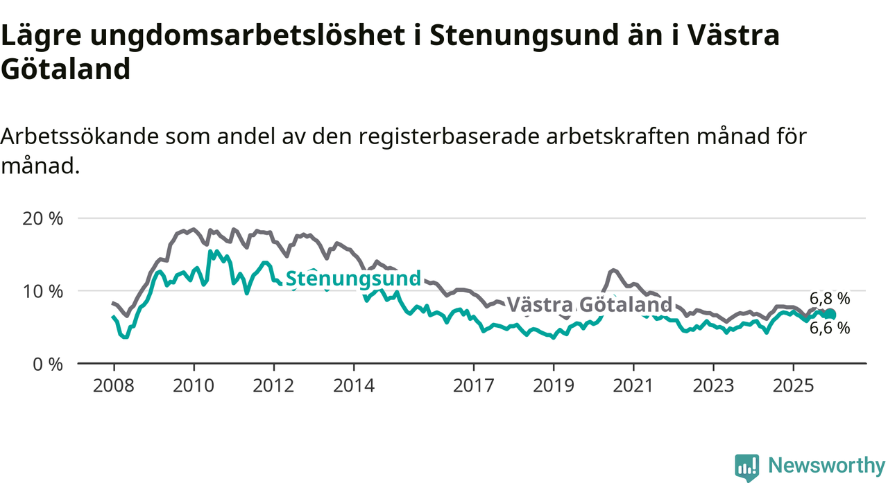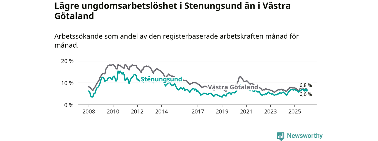 Precis som den totala arbetslösheten ligger ungdomsarbetslösheten i Stenungsund lägre än i Västra Götaland som helhet. Skillnaden mellan kommunen och länet är 0,2 procentenheter.