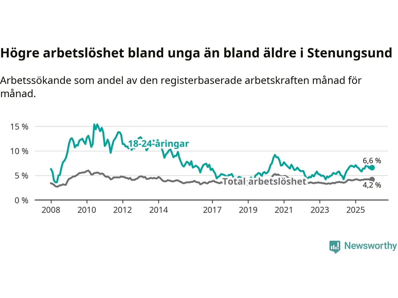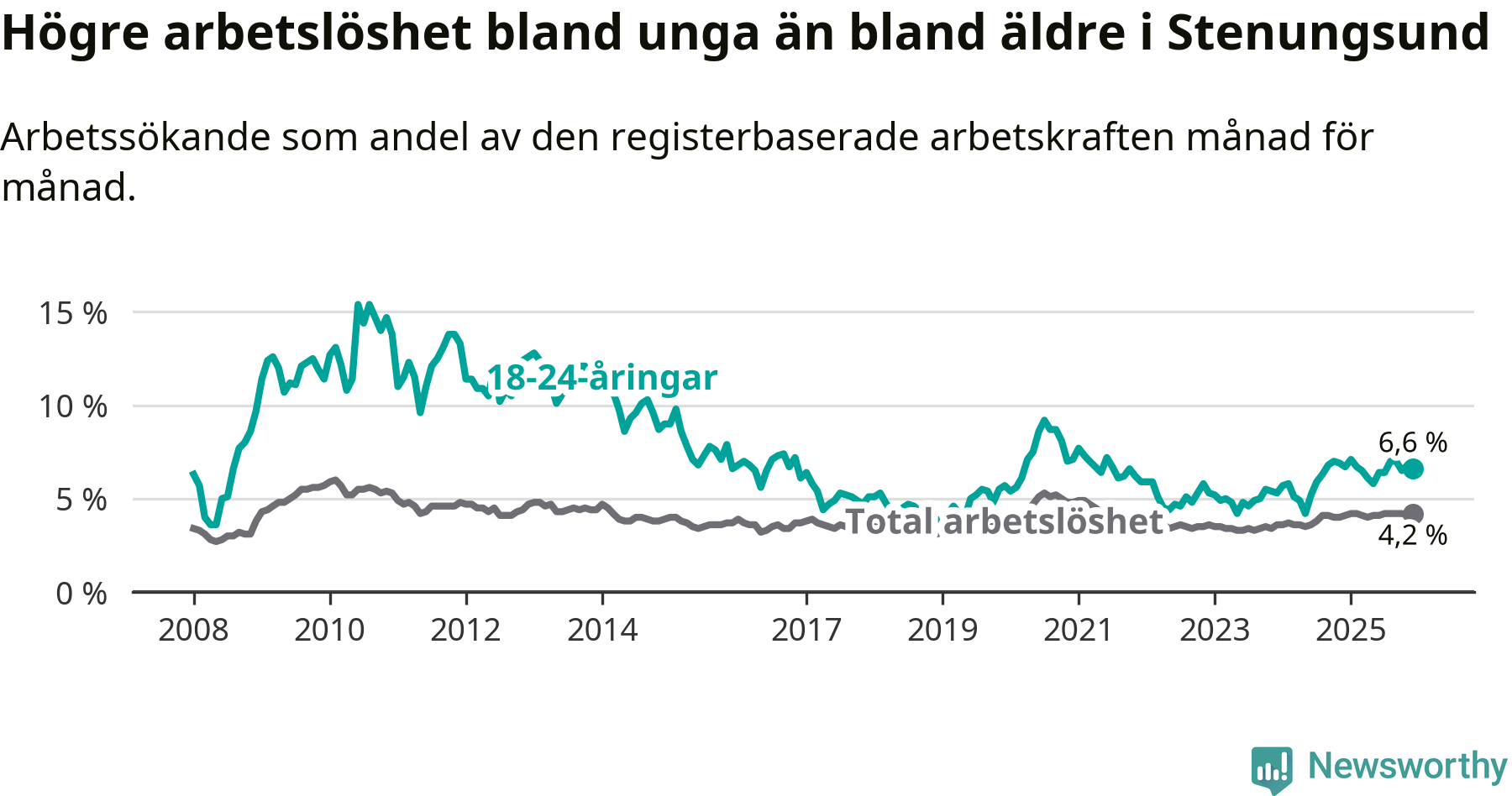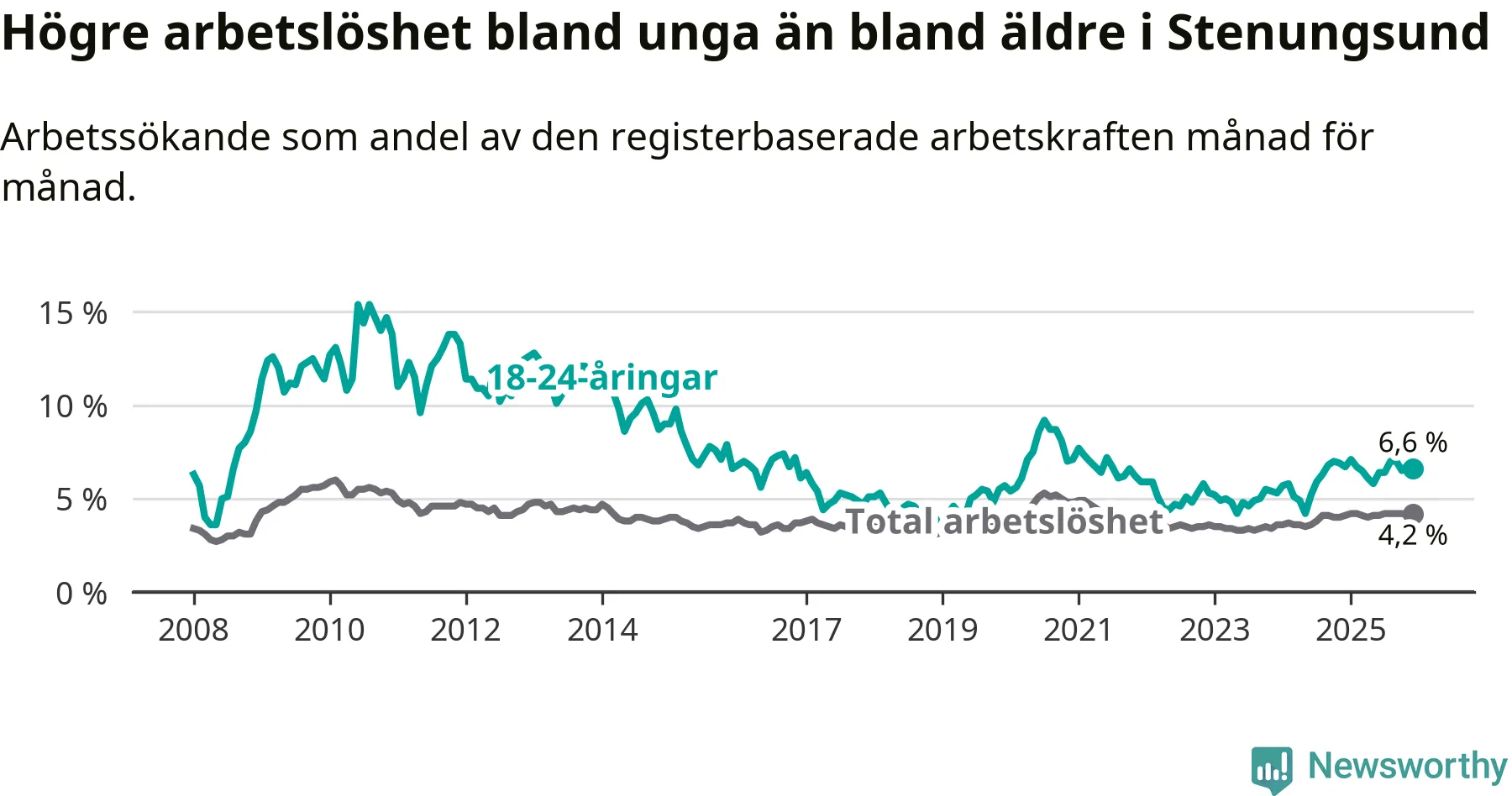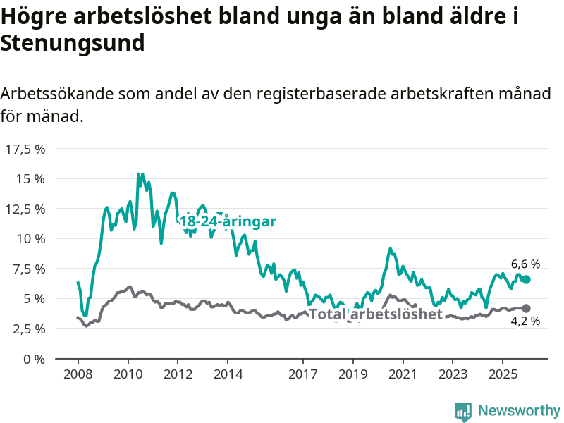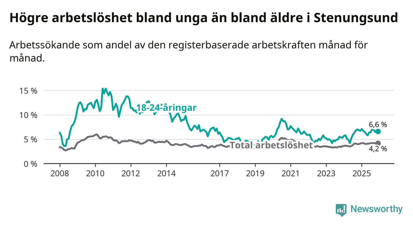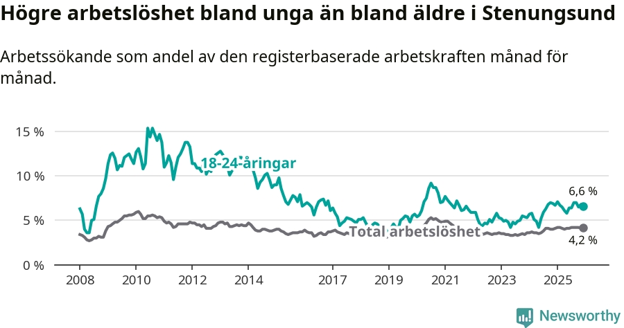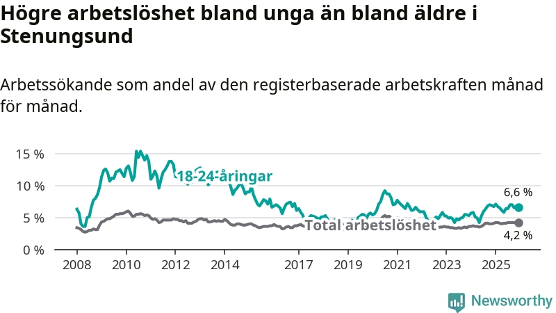 Precis som den totala arbetslösheten ligger ungdomsarbetslösheten i Stenungsund lägre än i Västra Götaland som helhet. Skillnaden mellan kommunen och länet är 0,2 procentenheter.