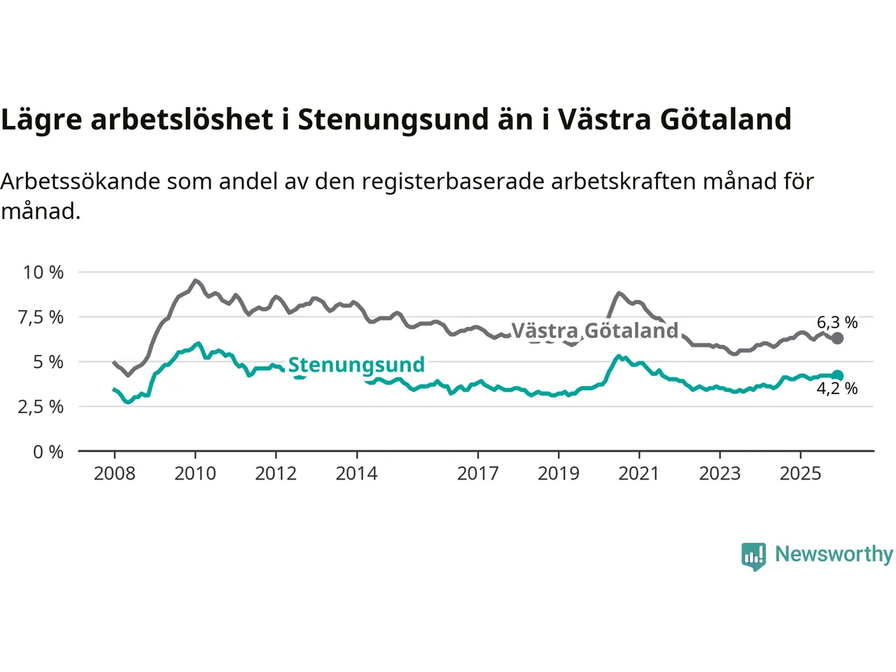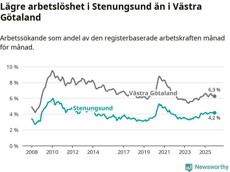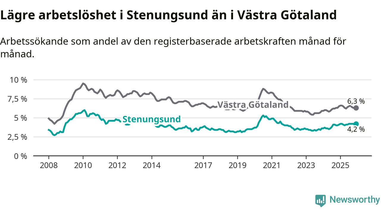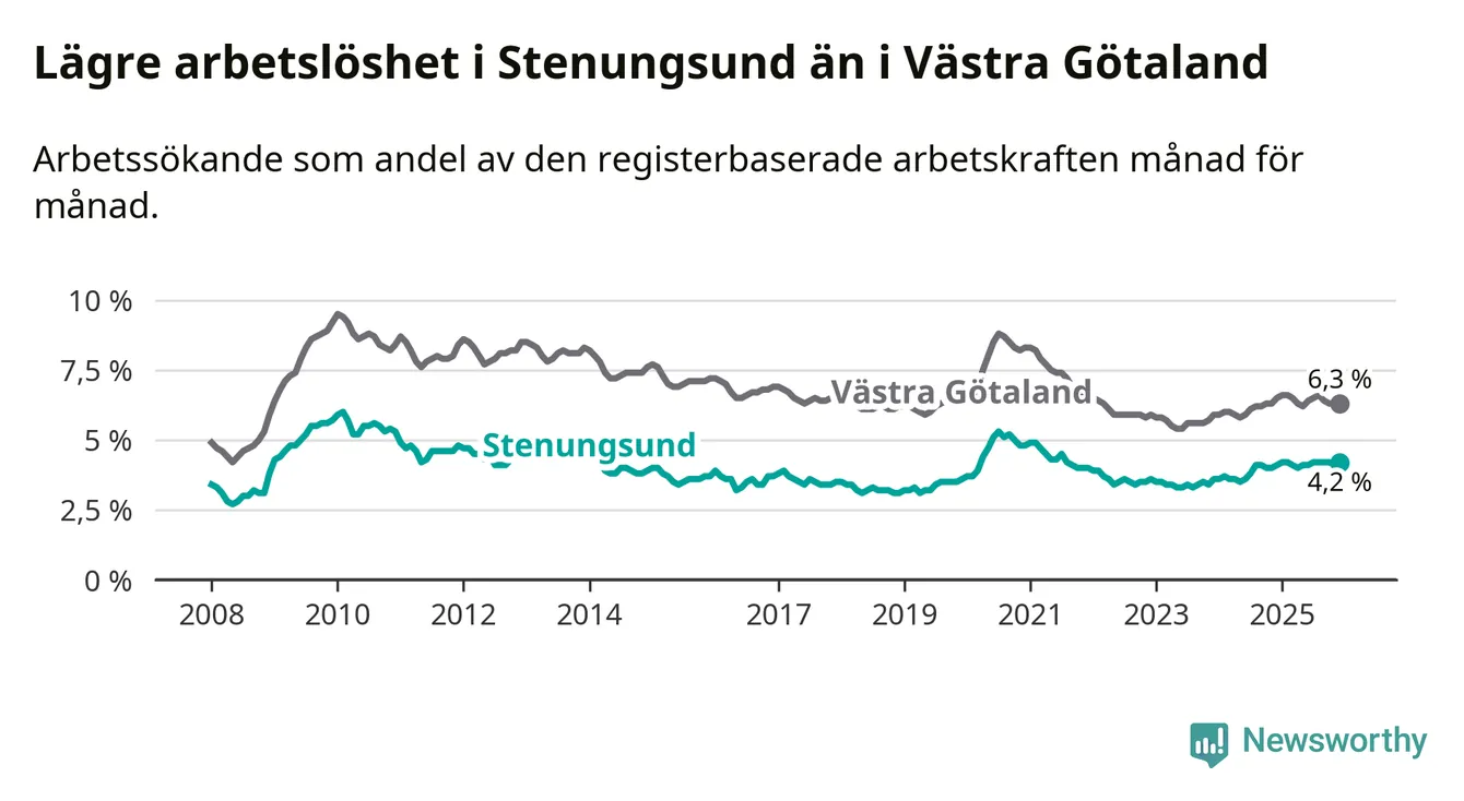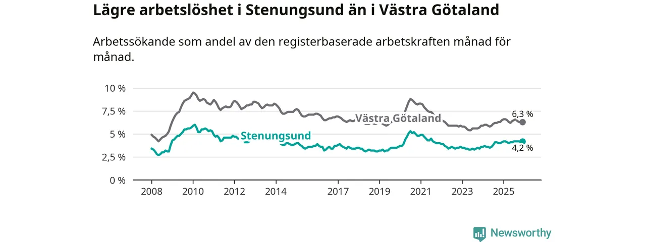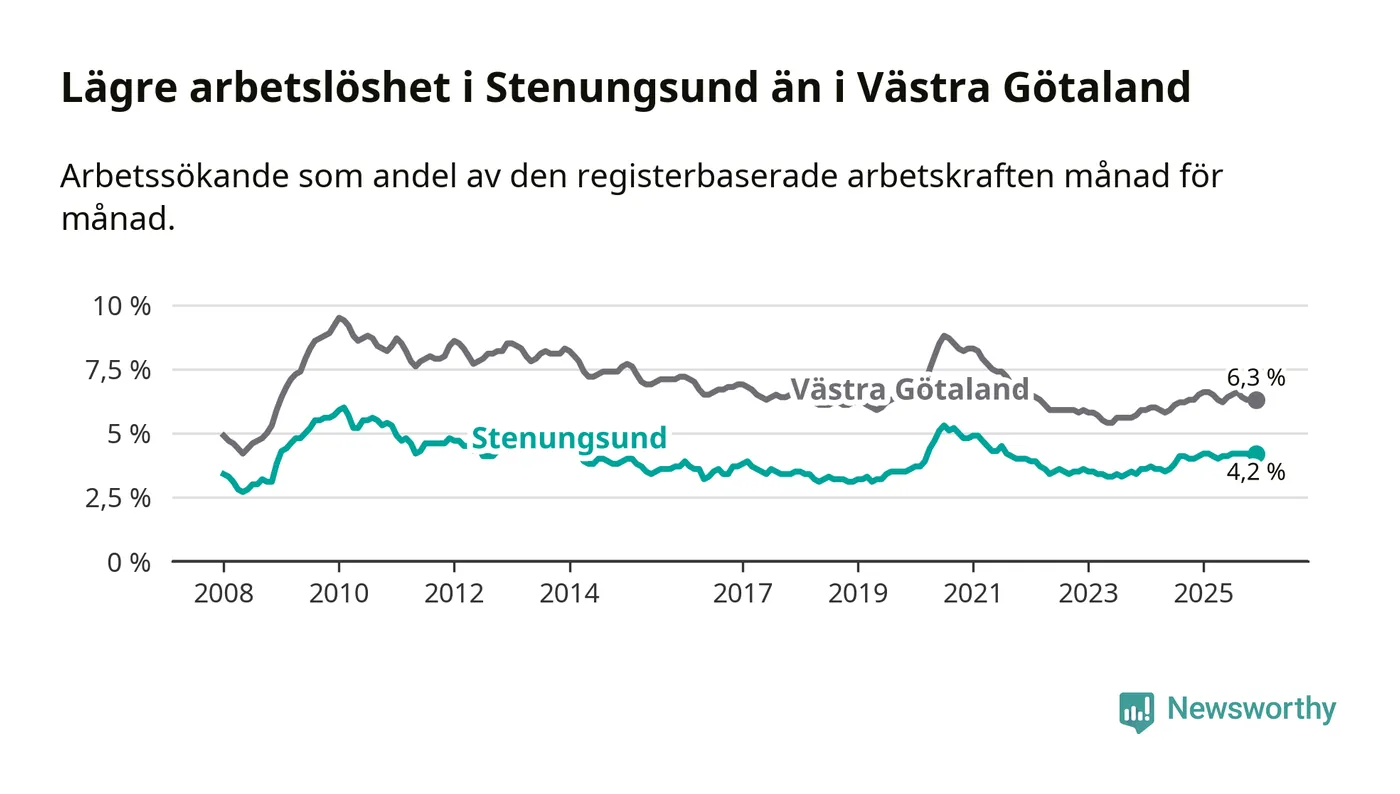 Även om arbetslösheten i Stenungsund alltså ökar, så ligger den fortfarande under snittet i hela Västra Götalands län (4,2 procent i kommunen, jämfört med 6,3 procent i hela länet). Öckerö har den lägsta arbetslösheten i länet (3,0 procent), medan Gullspång har den högsta (8,8 procent). För att Stenungsund skulle komma ner i samma arbetslöshetsnivå som Öckerö skulle 169 personer behöva sysselsättas.