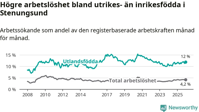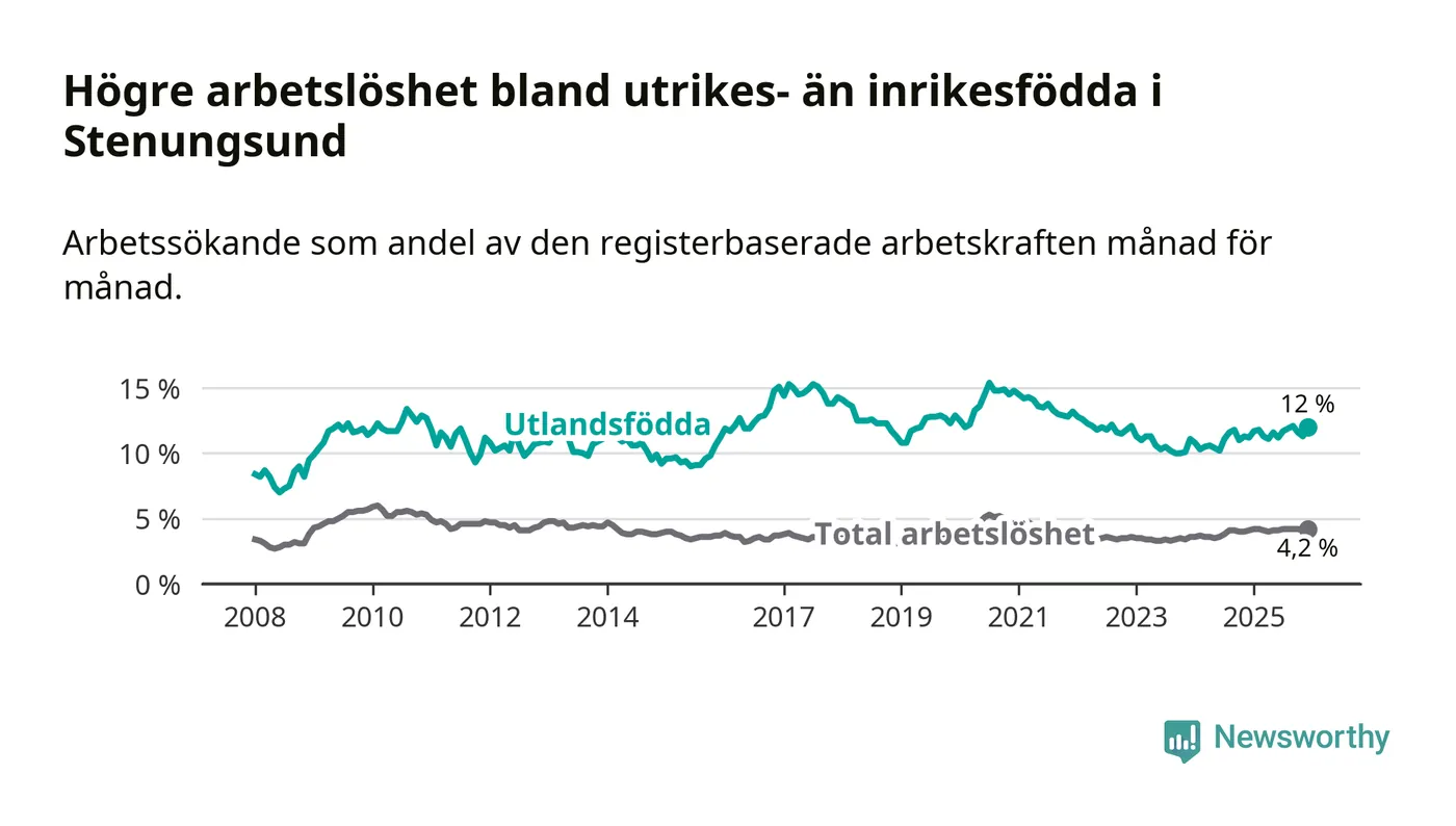 Skillnaden i arbetslöshet mellan utrikesfödda och hela befolkningen är 7,8 procentenheter i Stenungsund. Det är en större skillnad än för ett år sedan (+0,7 procentenheter).