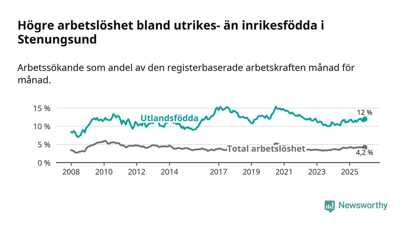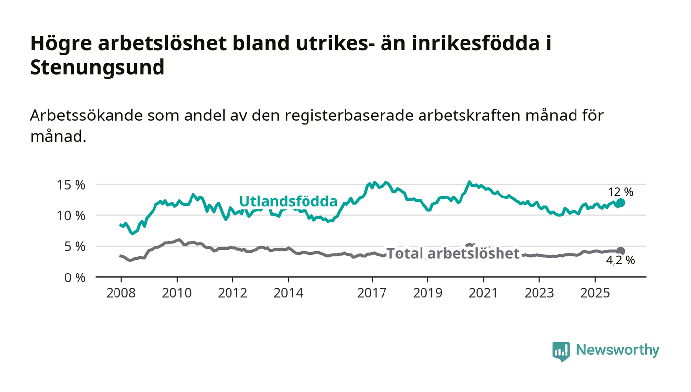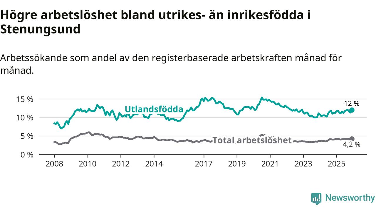 Arbetslösheten bland utlandsfödda var 12,0 procent i Stenungsund under december månad, motsvarande 232 av 1 933 personer. Det är 0,8 procentenheter fler än vid samma tidpunkt i fjol (+18 om man räknar personer). Den senaste månadens uppgång innebär ett trendbrott. Under de ett föregående månaderna hade arbetslösheten bland utlandsfödda varit lägre än motsvarande tidpunkt året innan.
