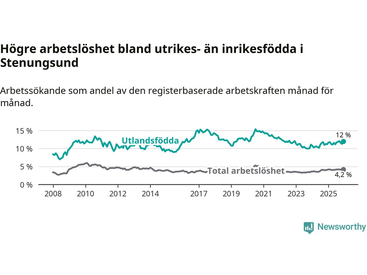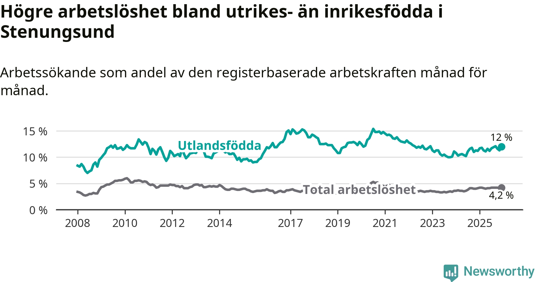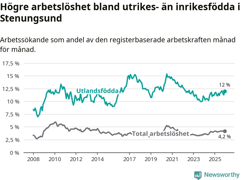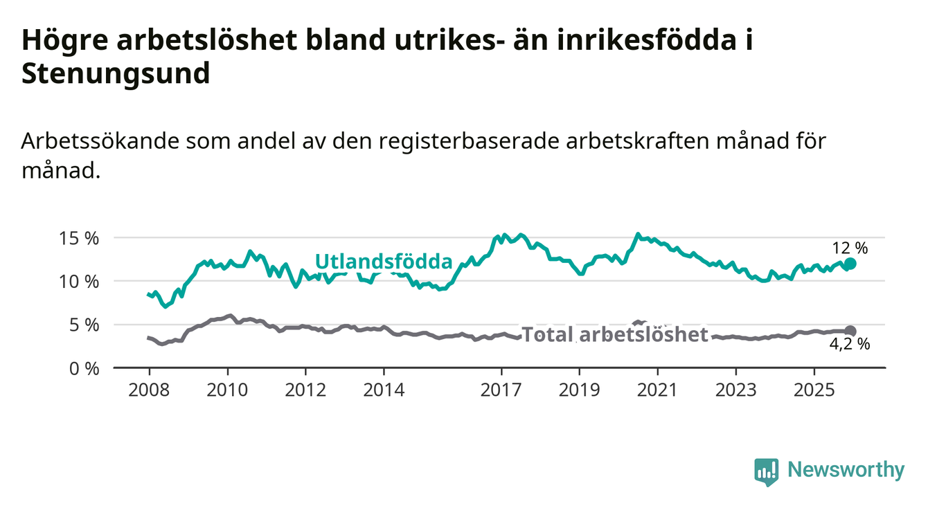 Arbetslösheten bland utlandsfödda var 12,0 procent i Stenungsund under december månad, motsvarande 232 av 1 933 personer. Det är 0,8 procentenheter fler än vid samma tidpunkt i fjol (+18 om man räknar personer). Den senaste månadens uppgång innebär ett trendbrott. Under de ett föregående månaderna hade arbetslösheten bland utlandsfödda varit lägre än motsvarande tidpunkt året innan.