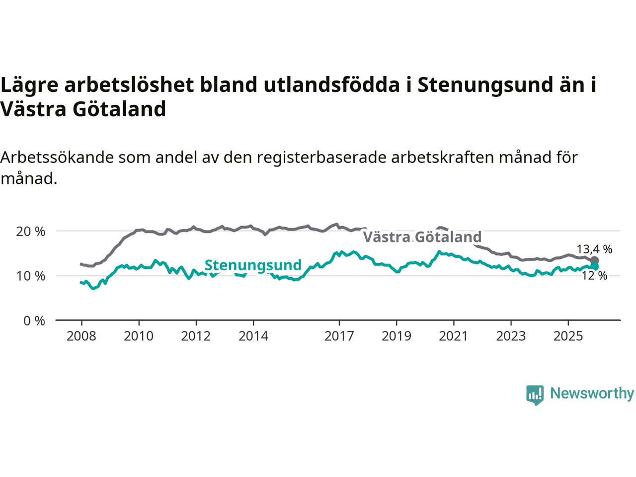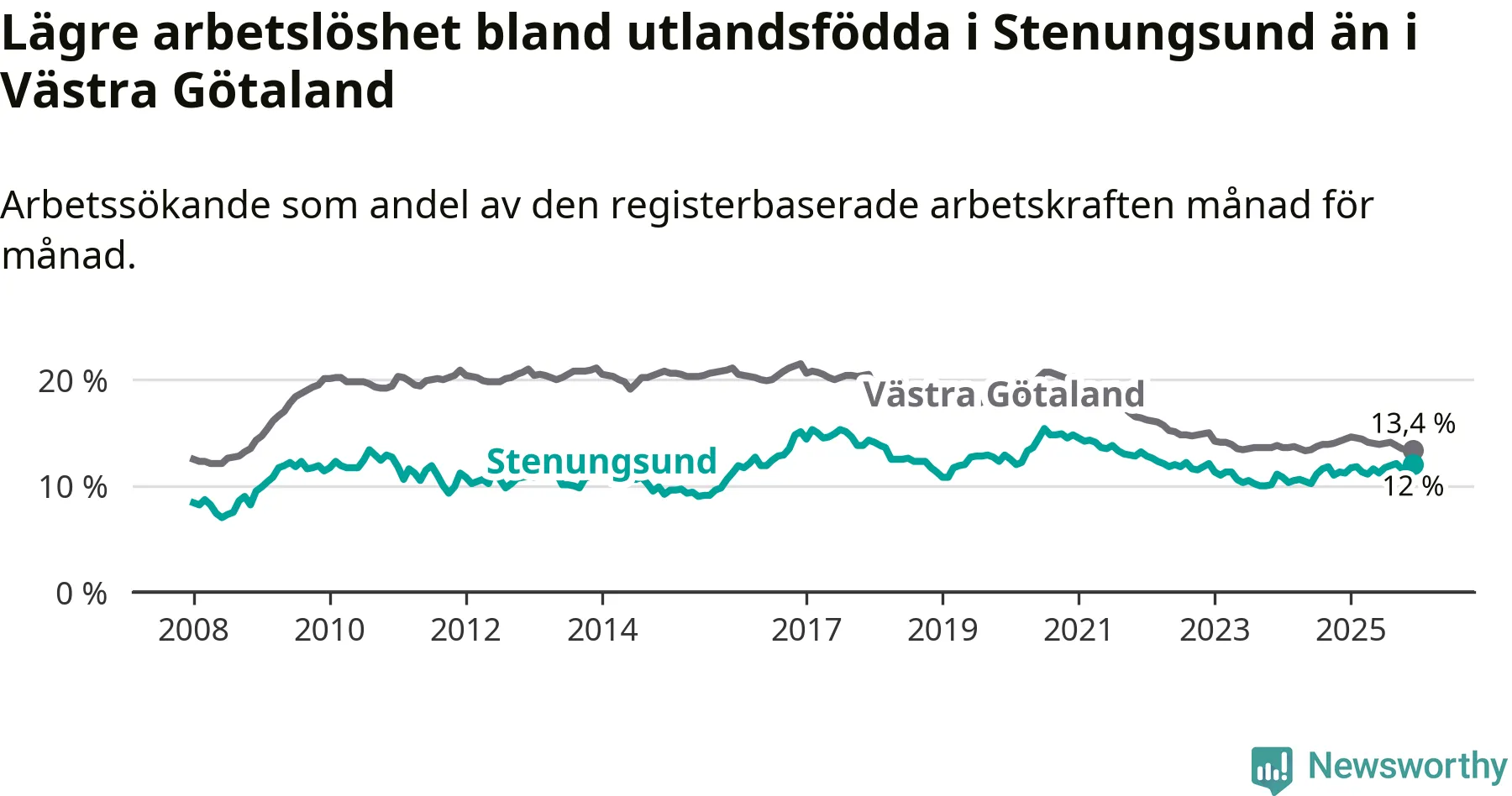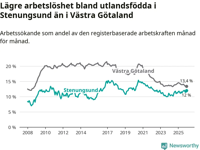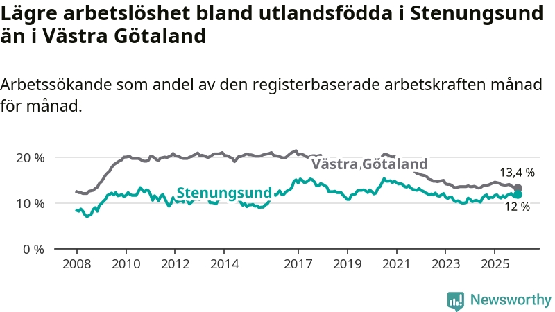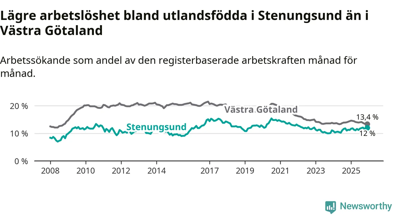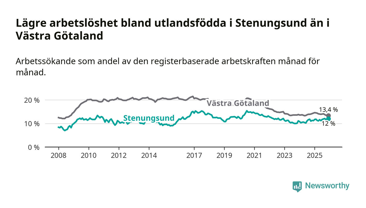 Medan arbetslösheten bland utlandsfödda alltså ökar i Stenungsund så minskar den i Västra Götaland. Jämfört med december förra året har andelen arbetslösa utlandsfödda i länet minskat med 1,0 procentenheter (till 13,4 procent). Trots den senaste uppgången har Stenungsund med andra ord fortfarande lägre arbetslöshet bland utlandsfödda än Västra Götaland.
