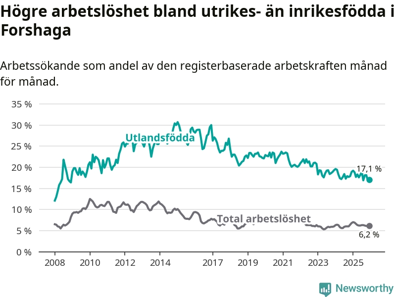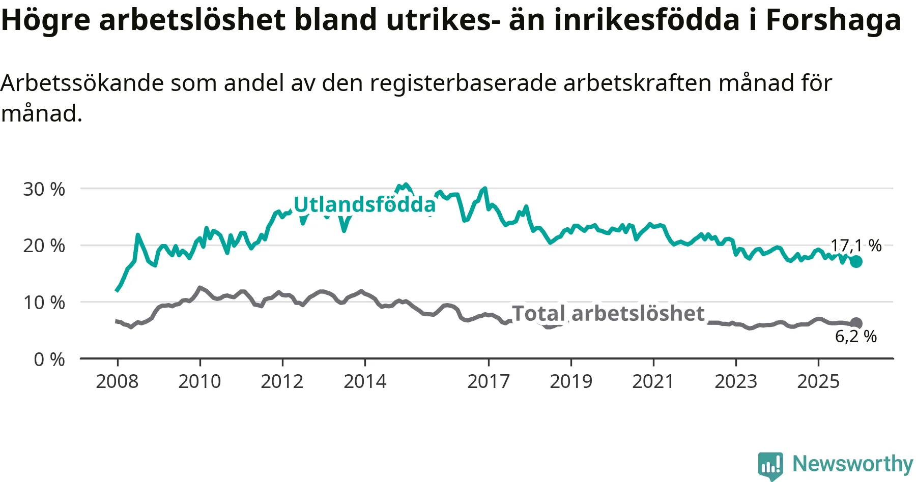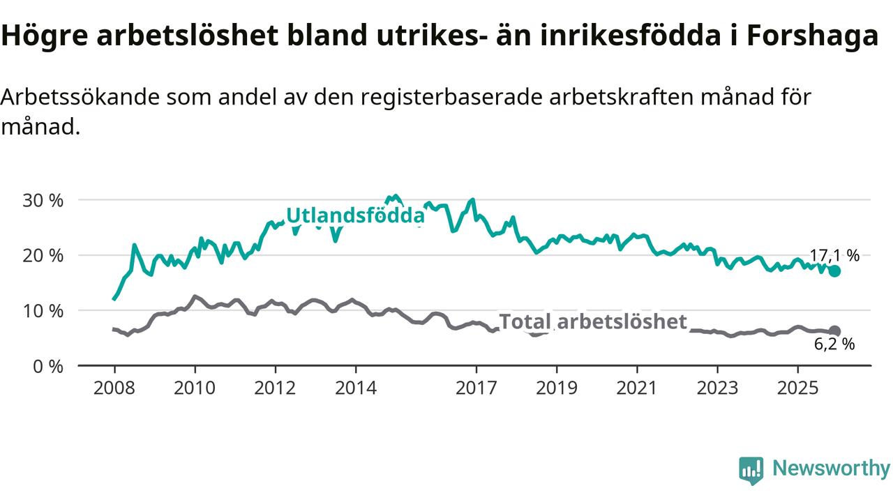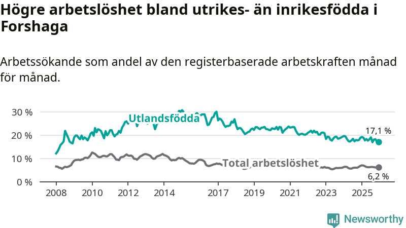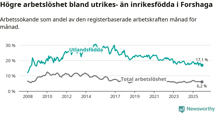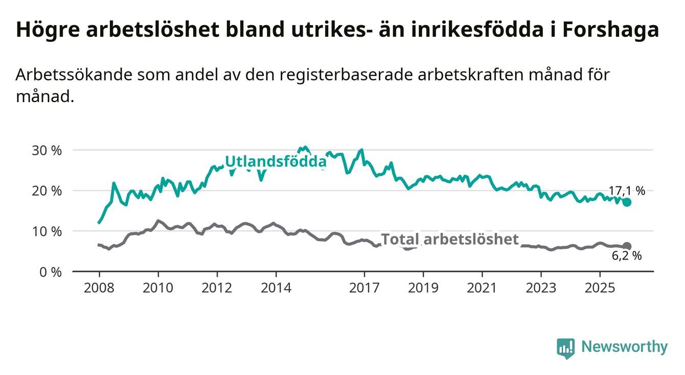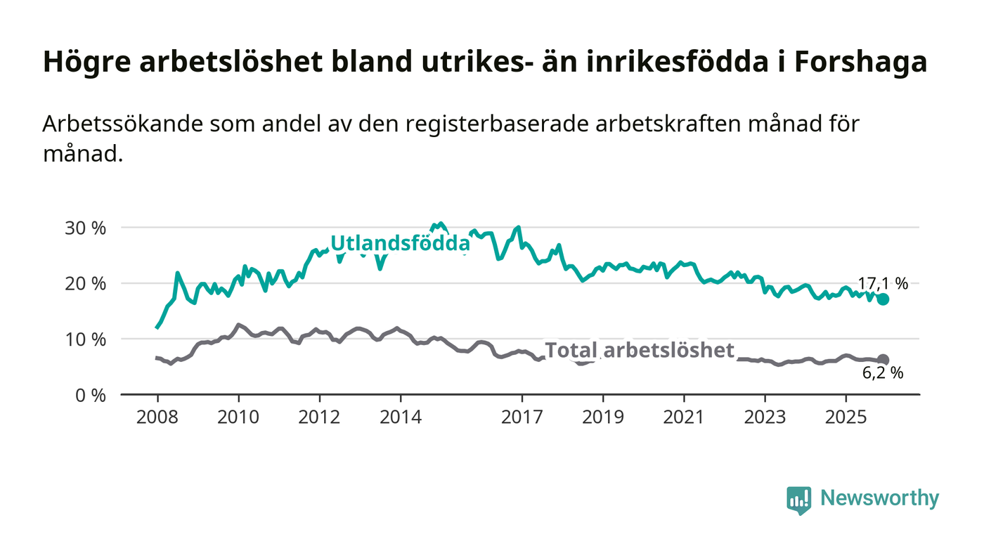 Arbetslösheten bland utlandsfödda var 17,1 procent i Forshaga under december månad, motsvarande 95 av 556 personer. Det är 1,8 procentenheter färre än vid samma tidpunkt i fjol (−12 om man räknar personer).