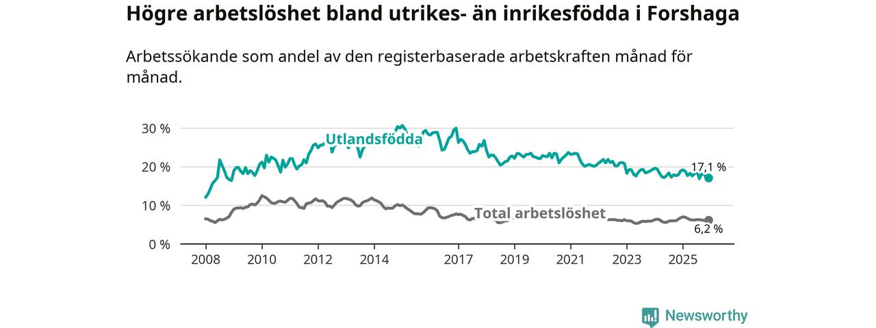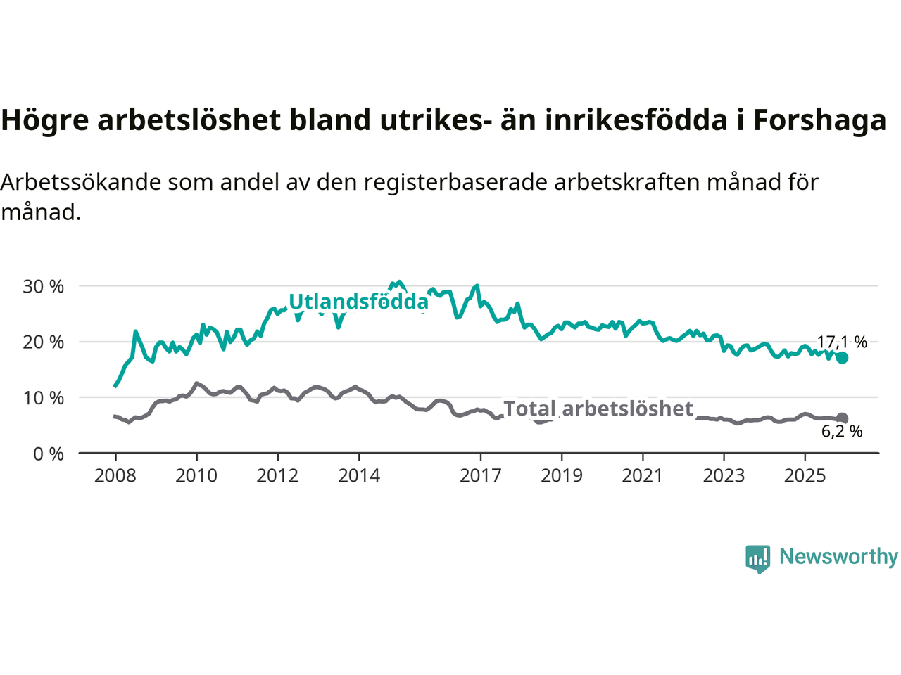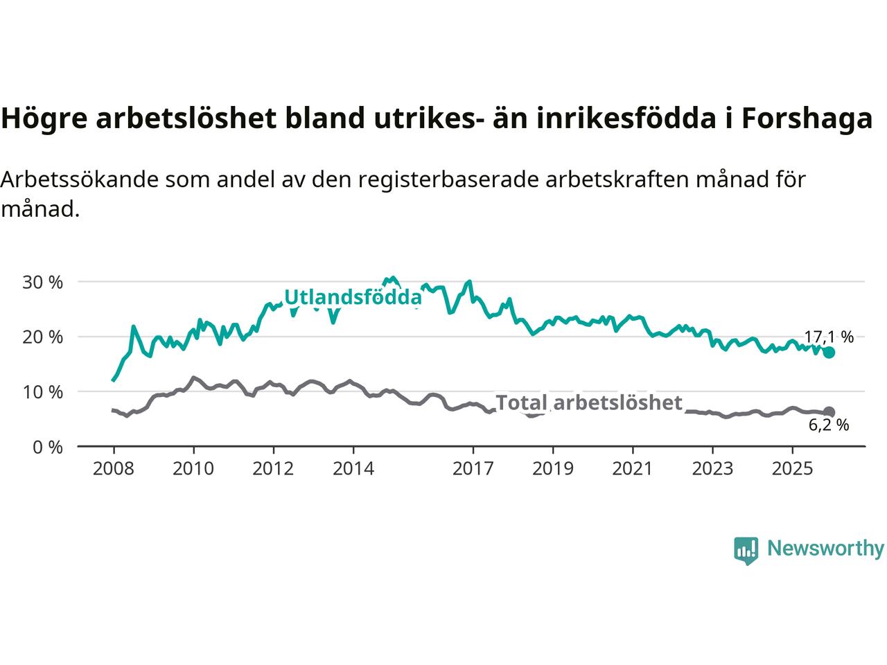 Skillnaden i arbetslöshet mellan utrikesfödda och hela befolkningen är 10,9 procentenheter i Forshaga. Det är en mindre skillnad än för ett år sedan (−1,2 procentenheter).