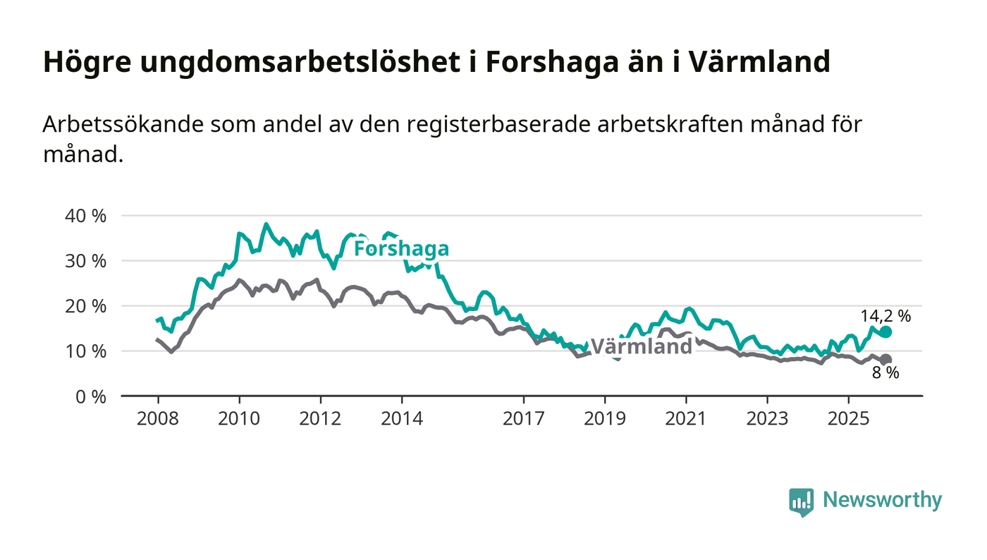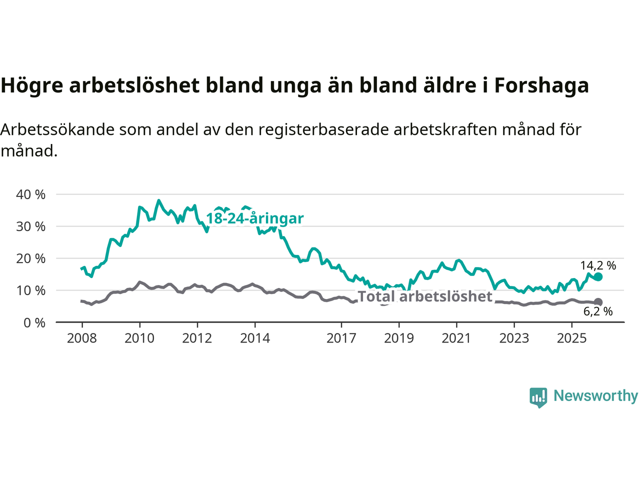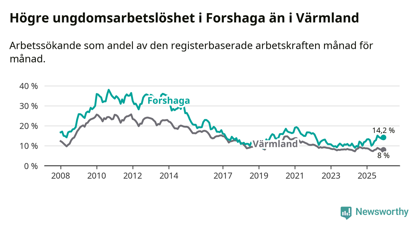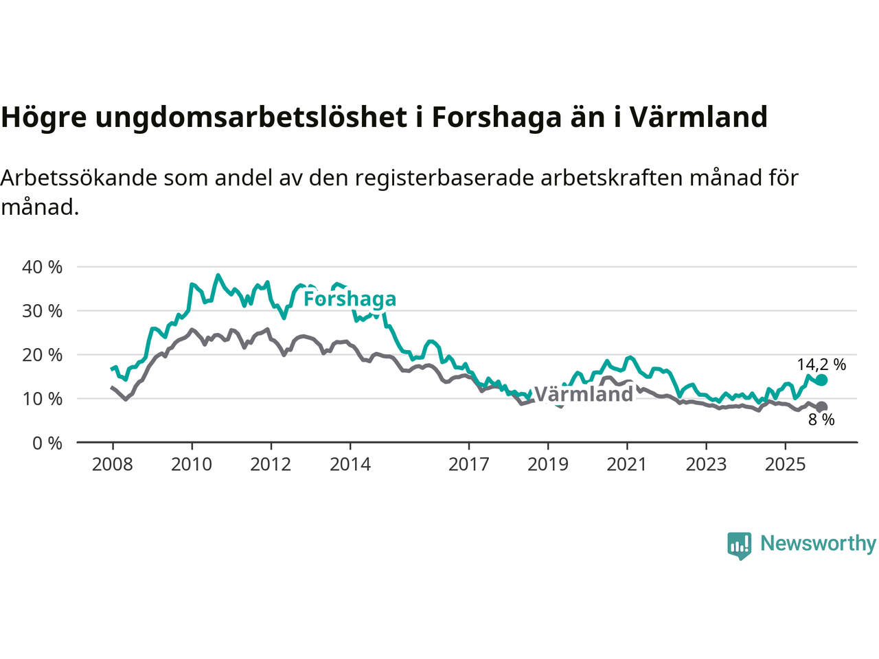 I och med den senaste månadens uppgång har de ungas arbetslöshet i Forshaga stigit 14 månader i följd (upp från 10,0 procent i oktober 2024 till 14,2 procent nu).