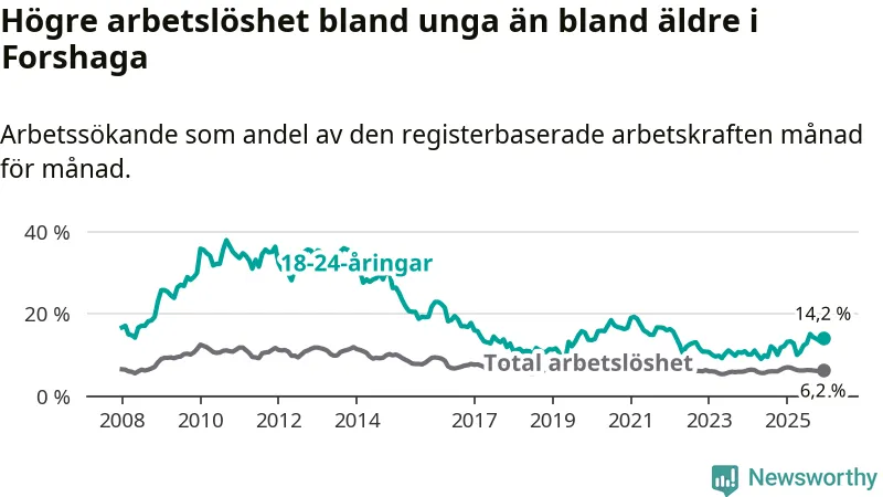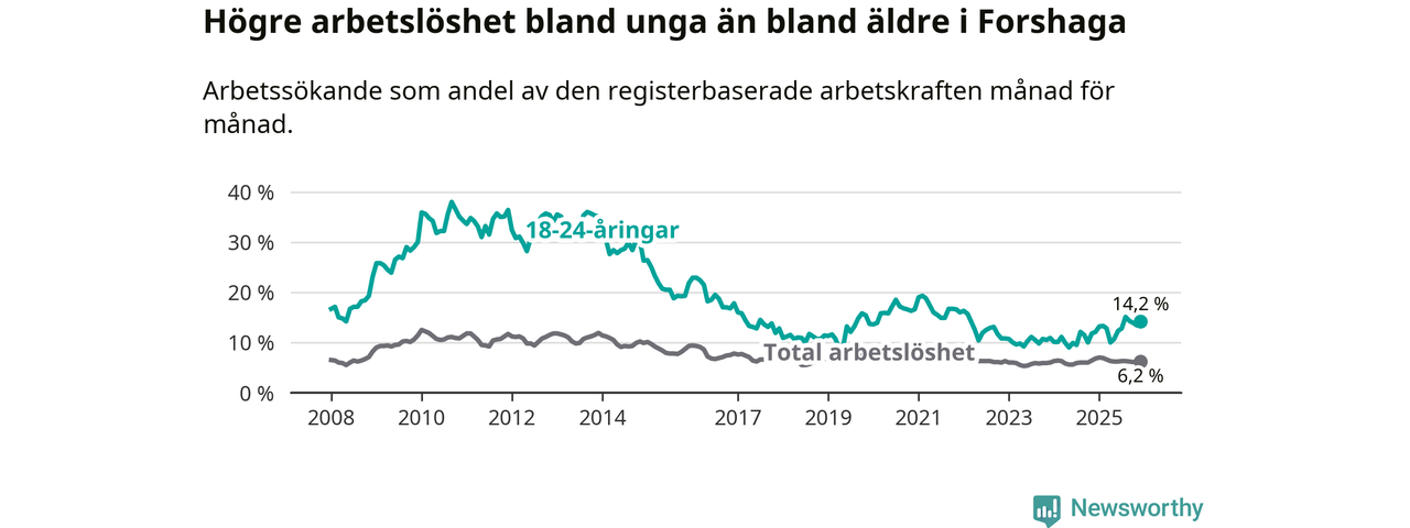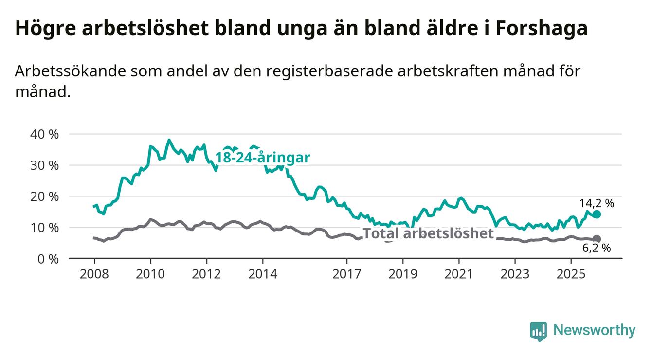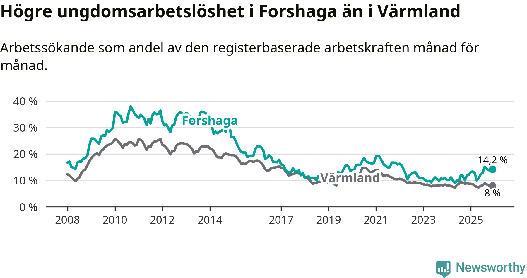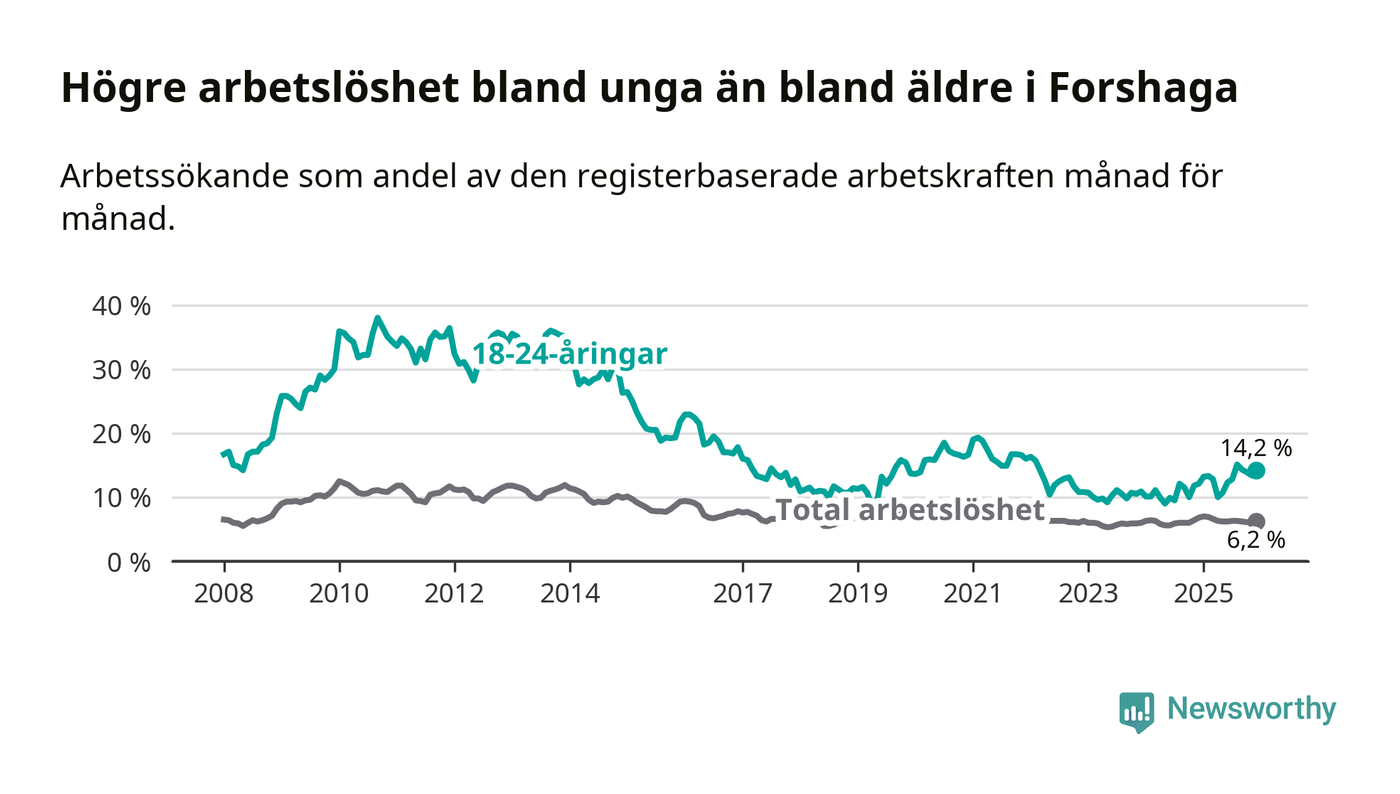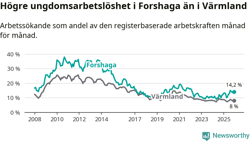 I och med den senaste månadens uppgång har de ungas arbetslöshet i Forshaga stigit 14 månader i följd (upp från 10,0 procent i oktober 2024 till 14,2 procent nu).