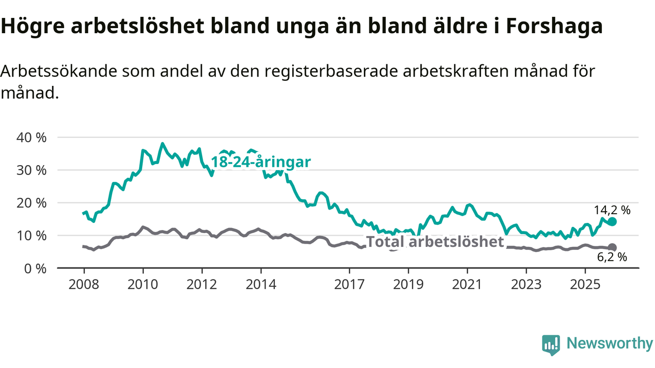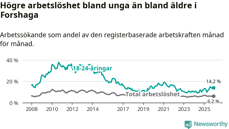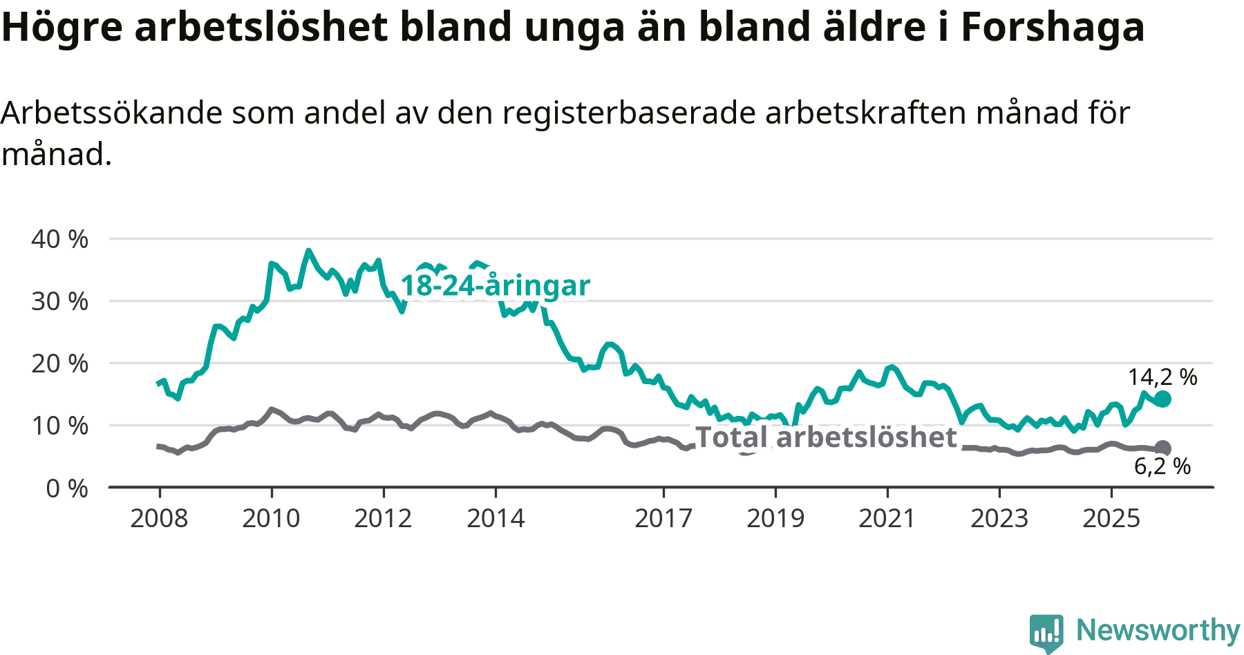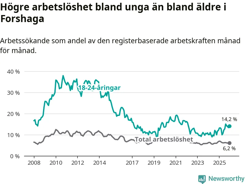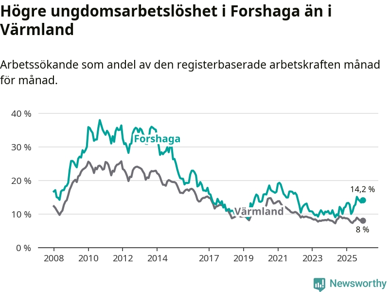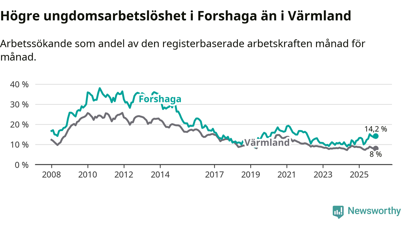 I och med den senaste månadens uppgång har de ungas arbetslöshet i Forshaga stigit 14 månader i följd (upp från 10,0 procent i oktober 2024 till 14,2 procent nu).