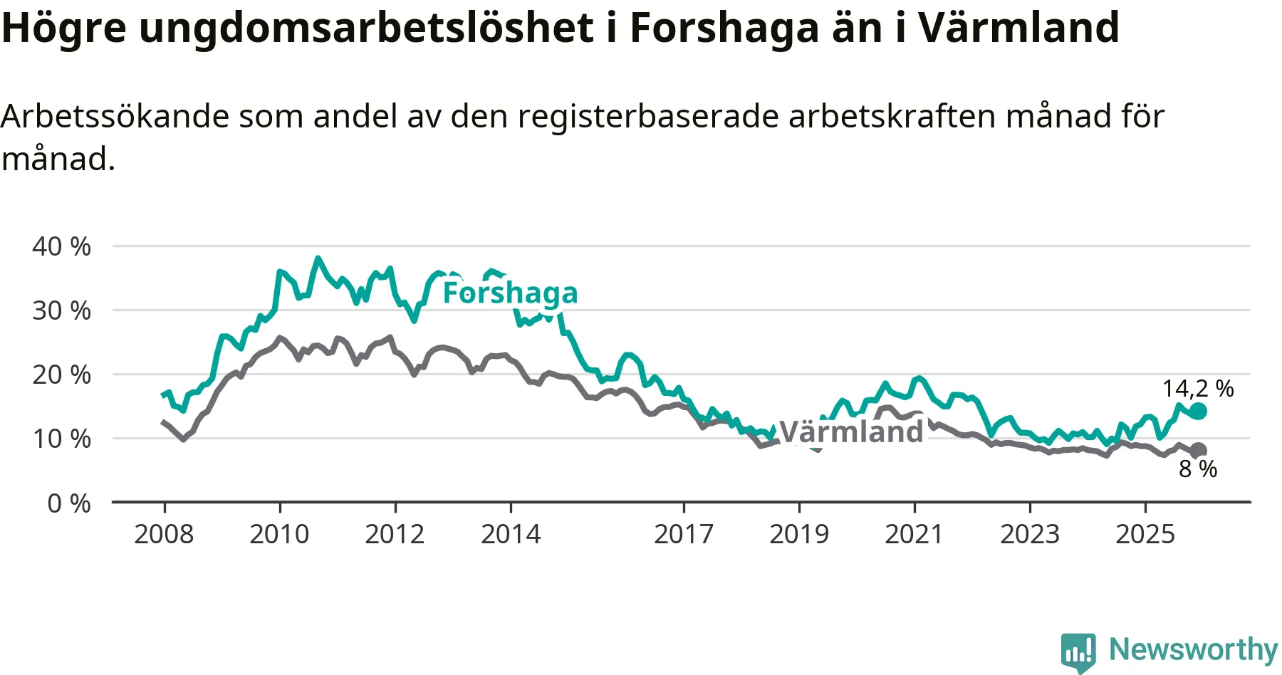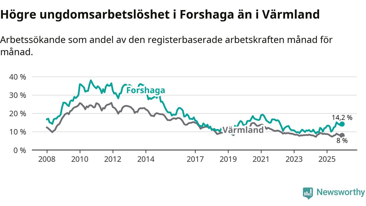 Precis som den totala arbetslösheten ligger ungdomsarbetslösheten i Forshaga högre än i Värmland som helhet. Skillnaden mellan kommunen och länet är 6,2 procentenheter.