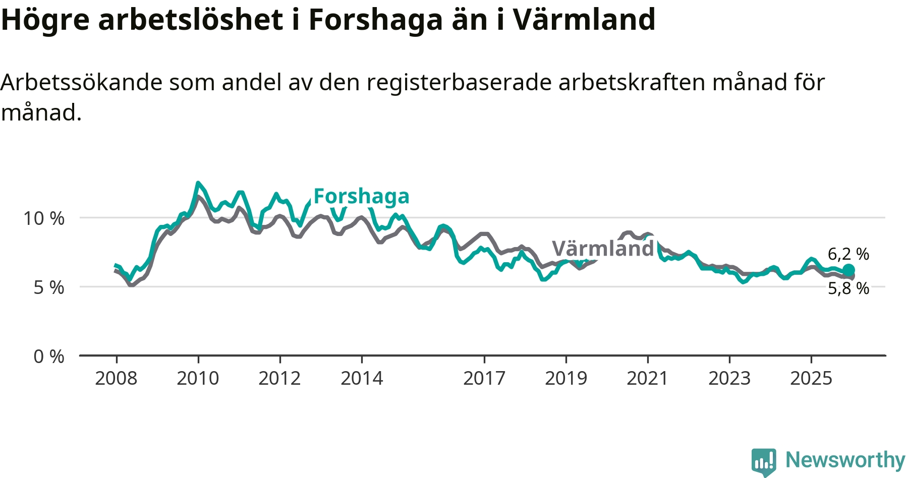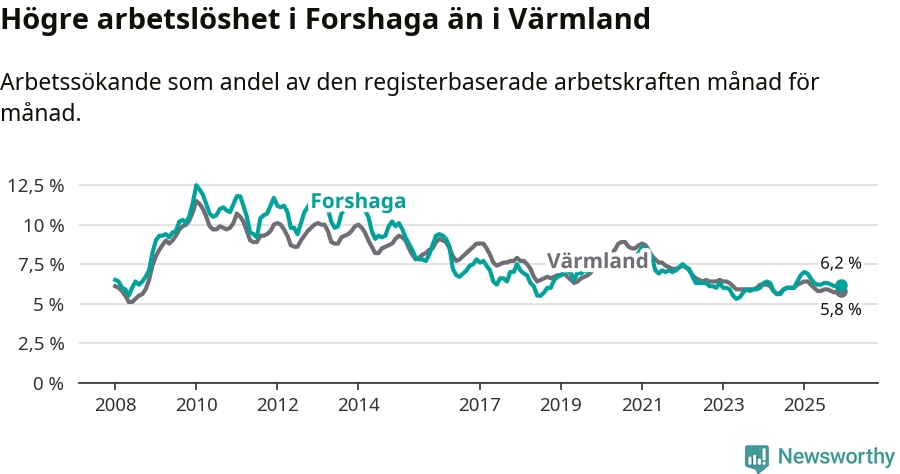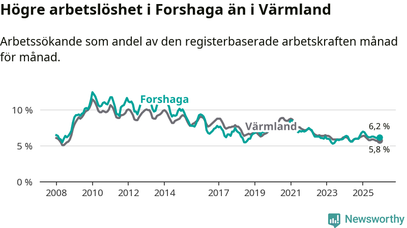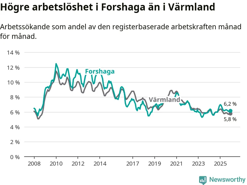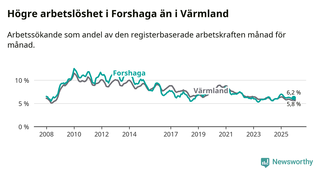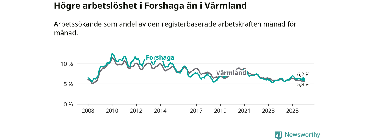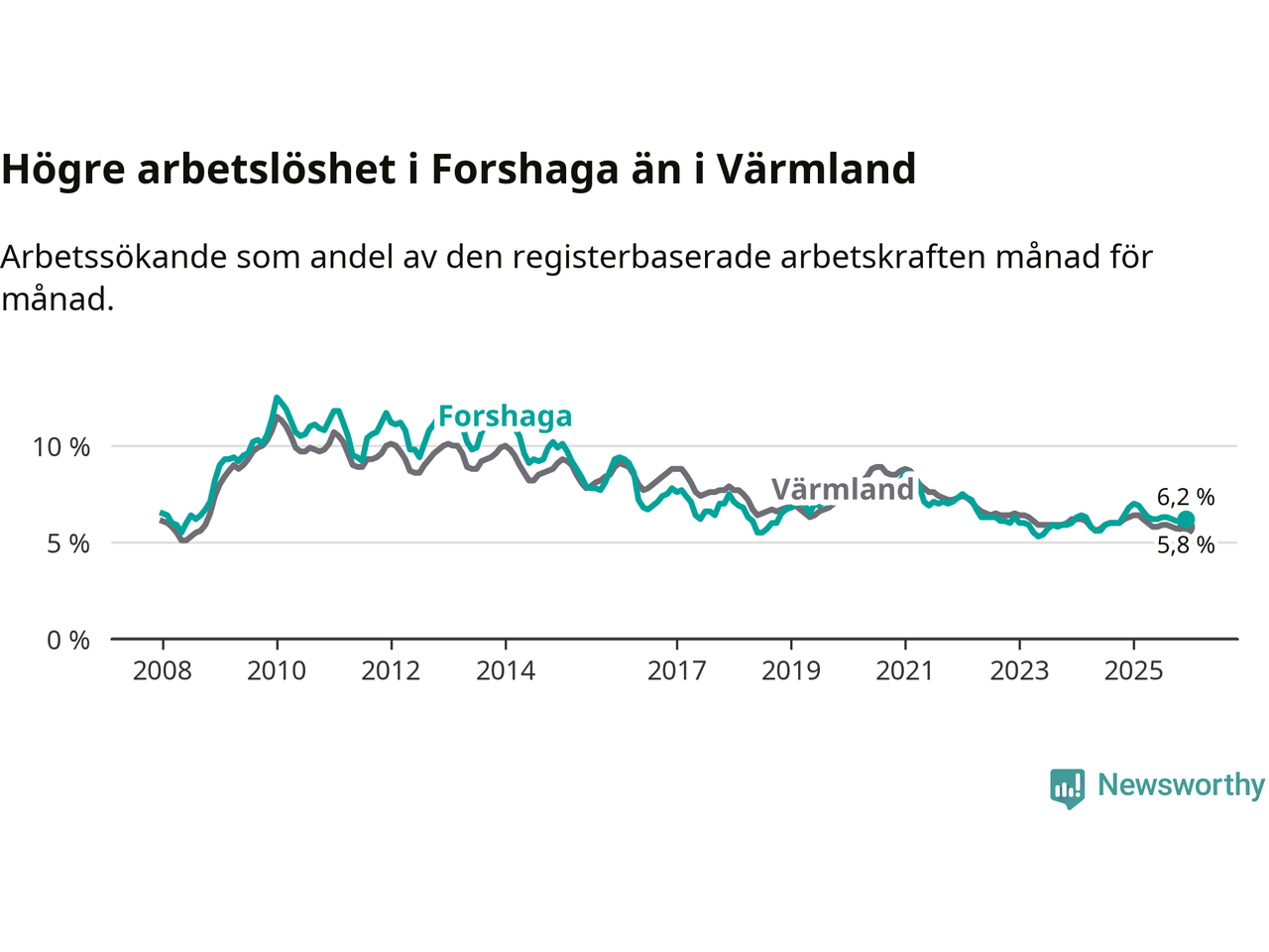 Under december månad rapporterade Forshaga kommun en total arbetslöshet på 6,2 procent. Det är en minskning jämfört med samma tidpunkt i fjol (−0,6 procentenheter). Även i Värmlands län sjunker arbetslösheten .