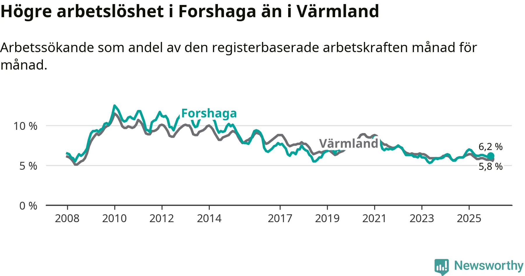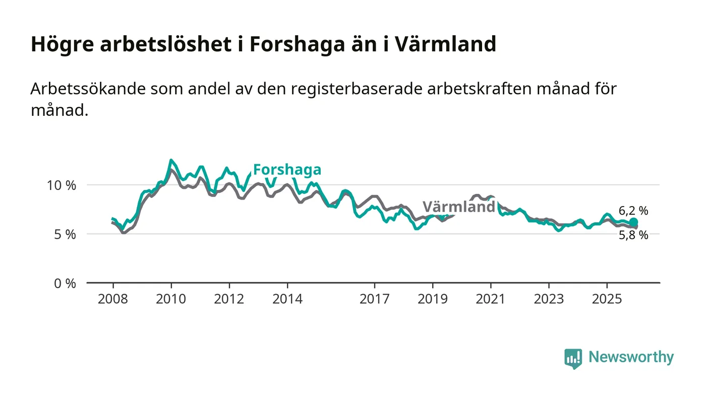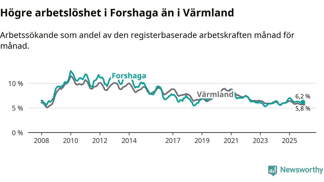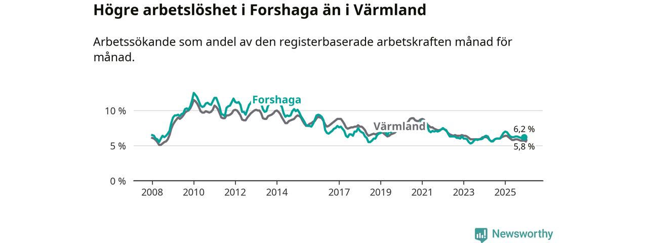 Även om arbetslösheten i Forshaga alltså minskar, så ligger den fortfarande över snittet i hela Värmlands län (6,2 procent i kommunen, jämfört med 5,8 procent i hela länet). Torsby har den lägsta arbetslösheten i länet (3,4 procent), medan Filipstad har den högsta (8,6 procent). För att Forshaga skulle komma ner i samma arbetslöshetsnivå som Torsby skulle 149 personer behöva sysselsättas.