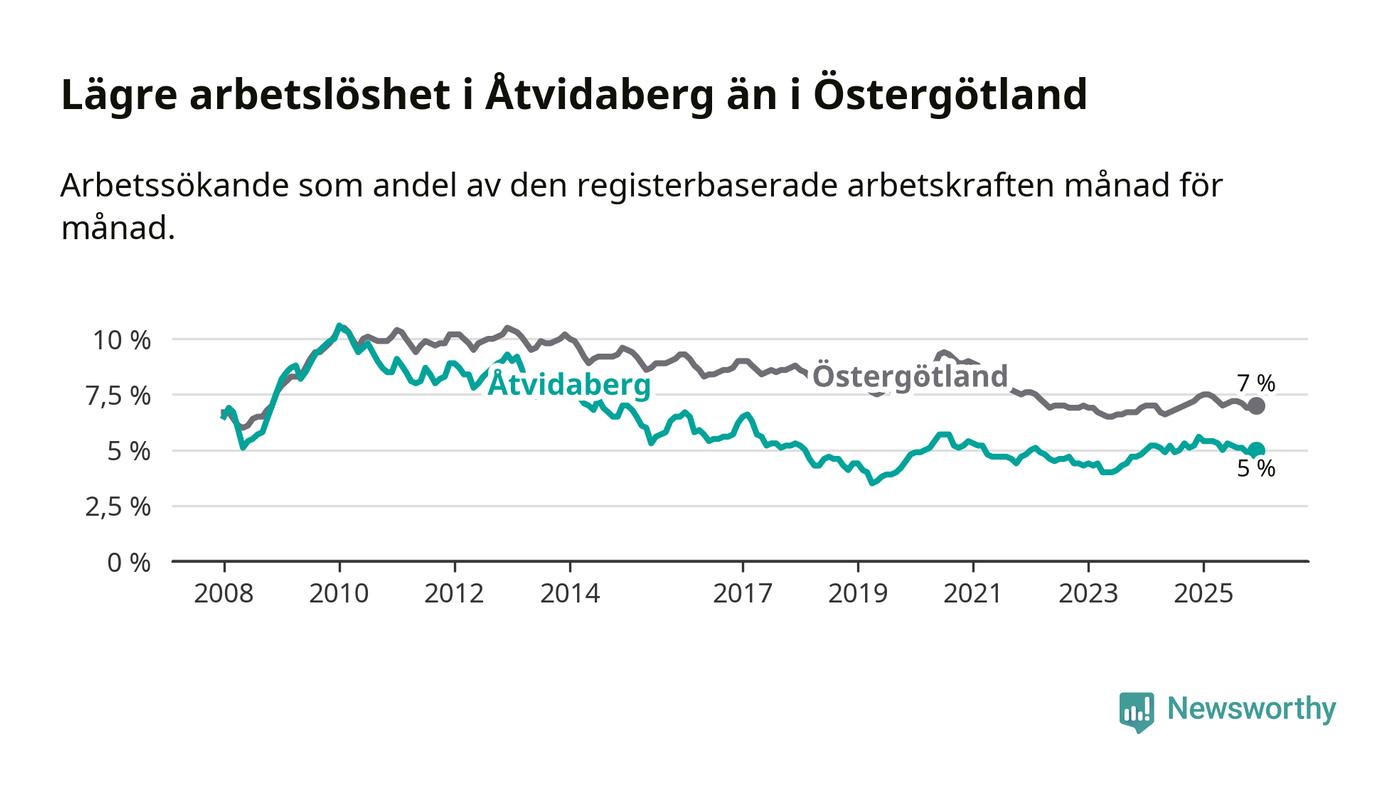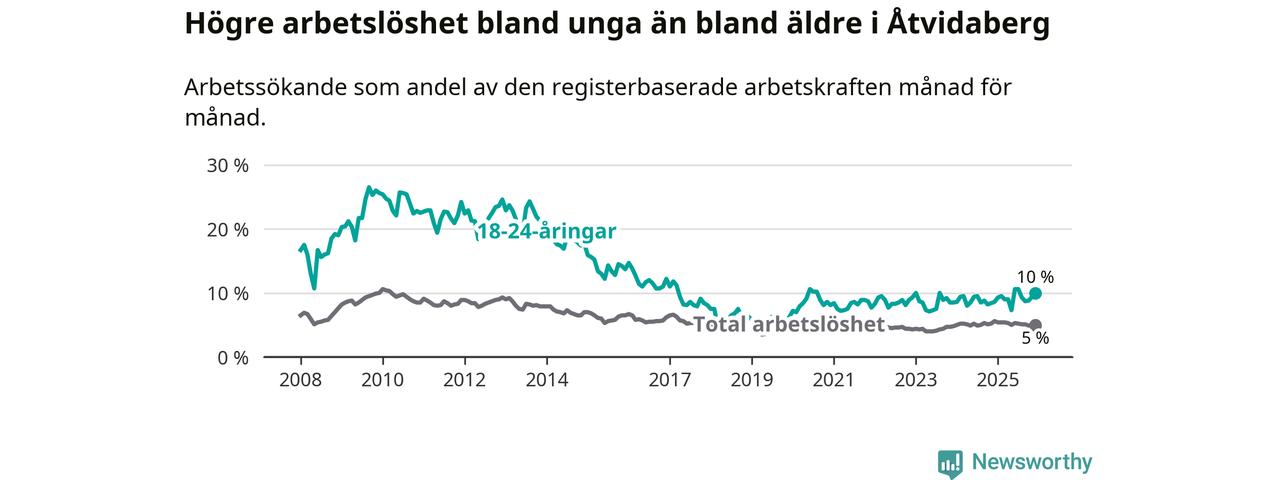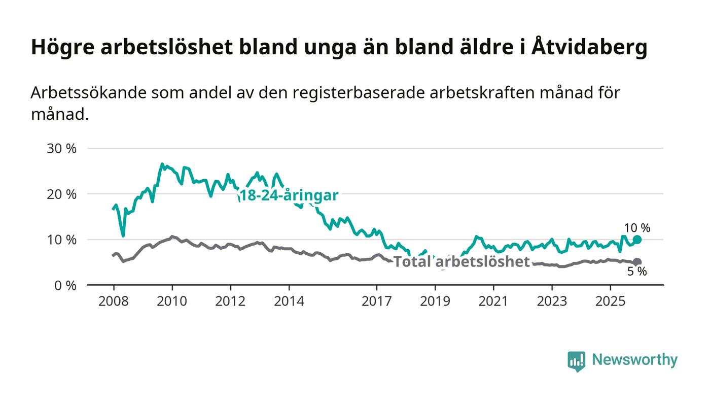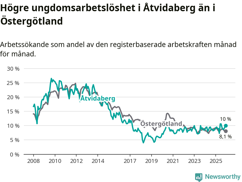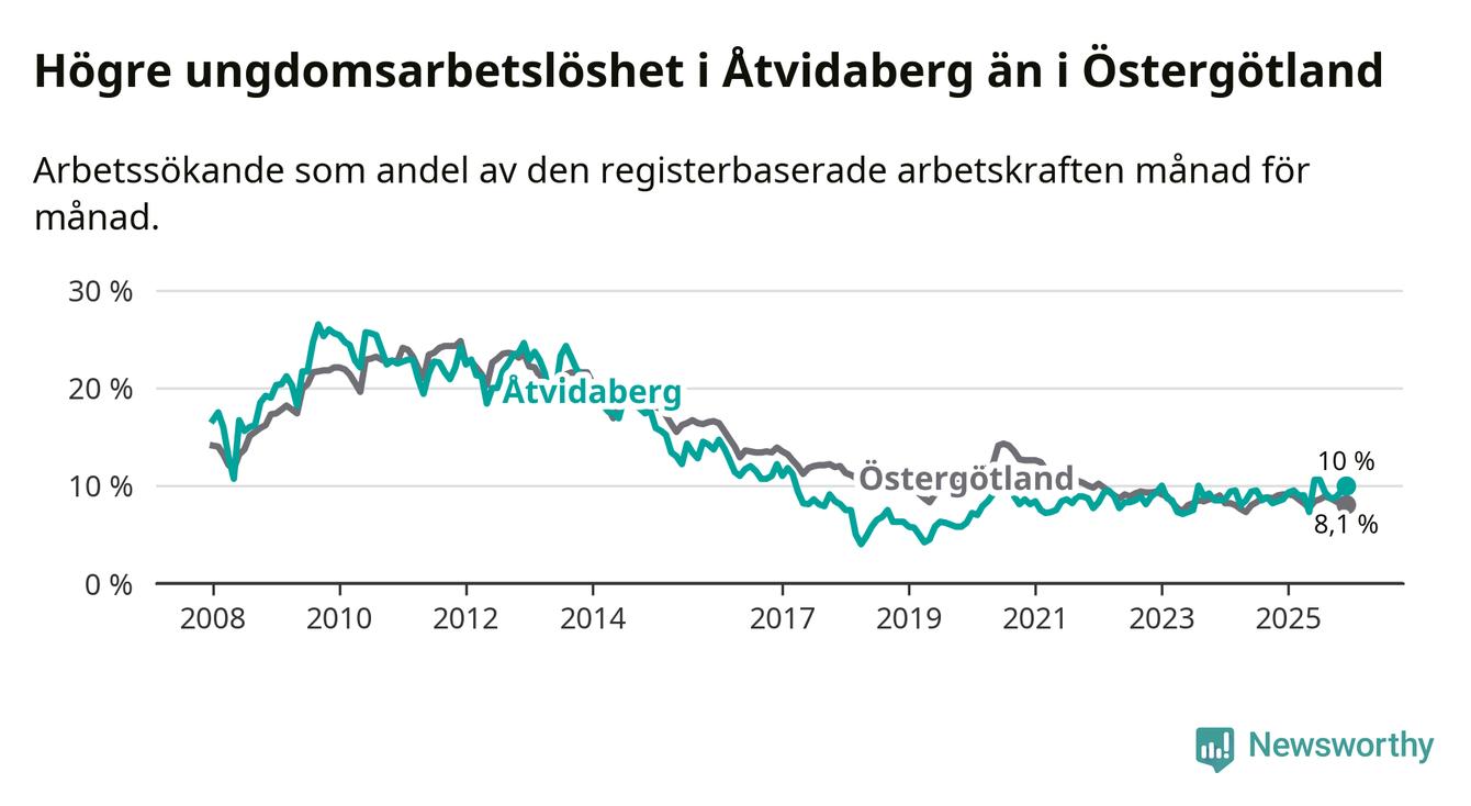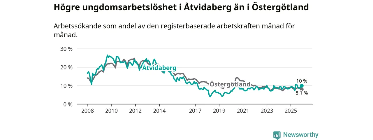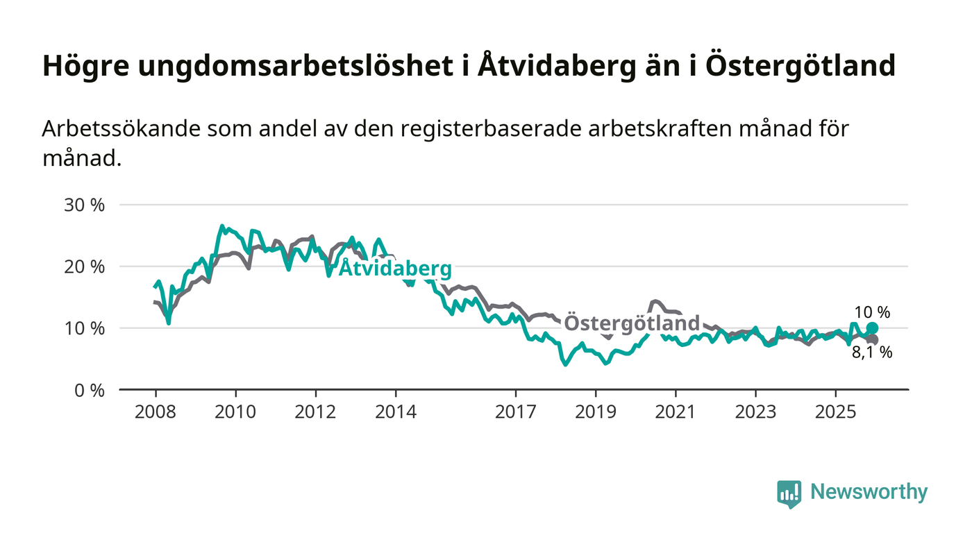 Medan Åtvidaberg har lägre total arbetslöshet än Östergötland, ligger ungdomsarbetslösheten 1,9 procentenheter högre i Åtvidaberg.