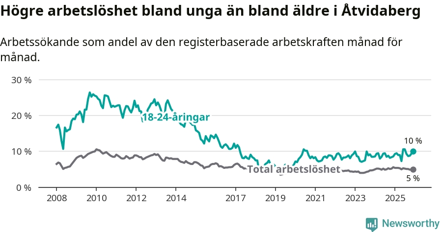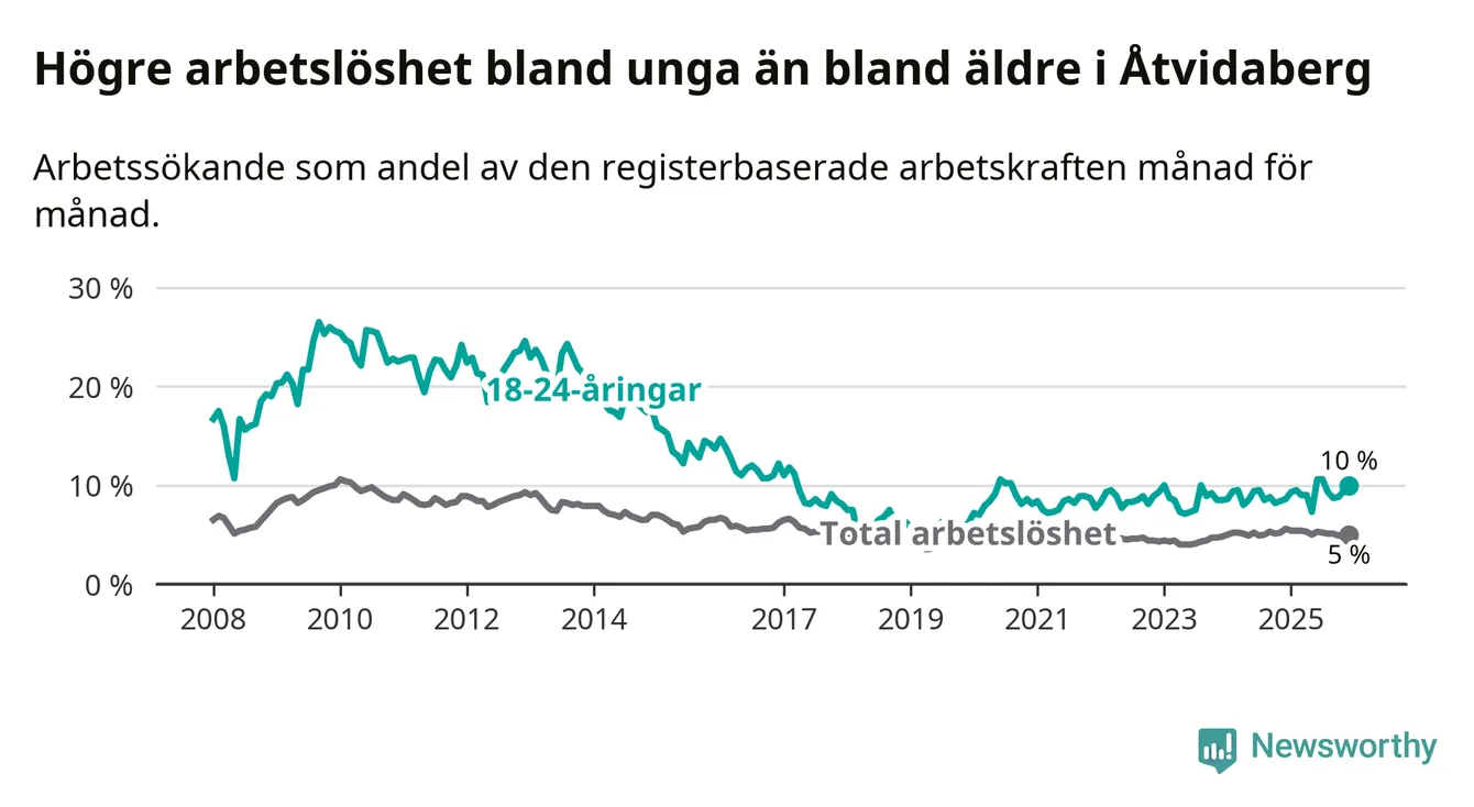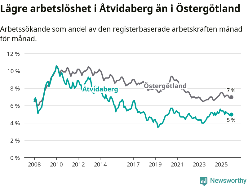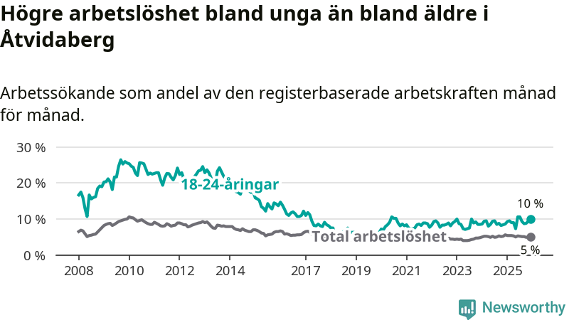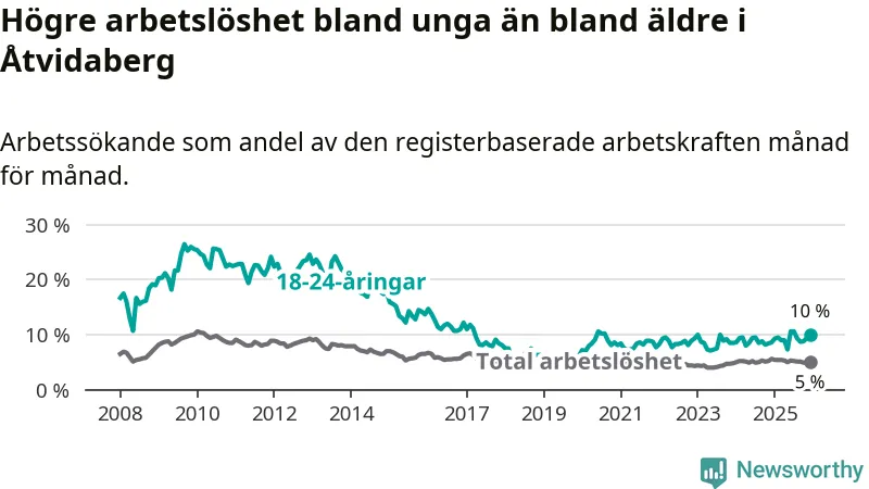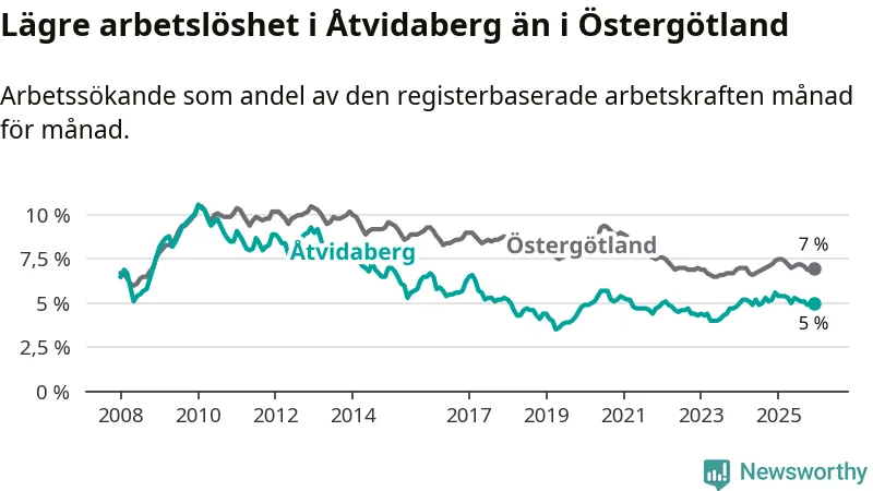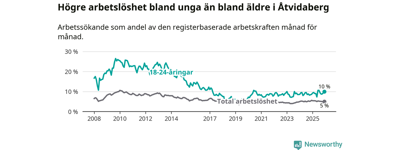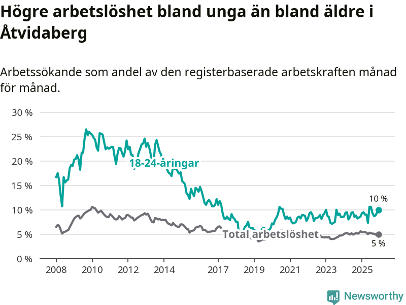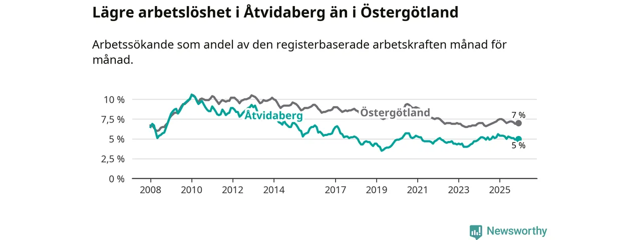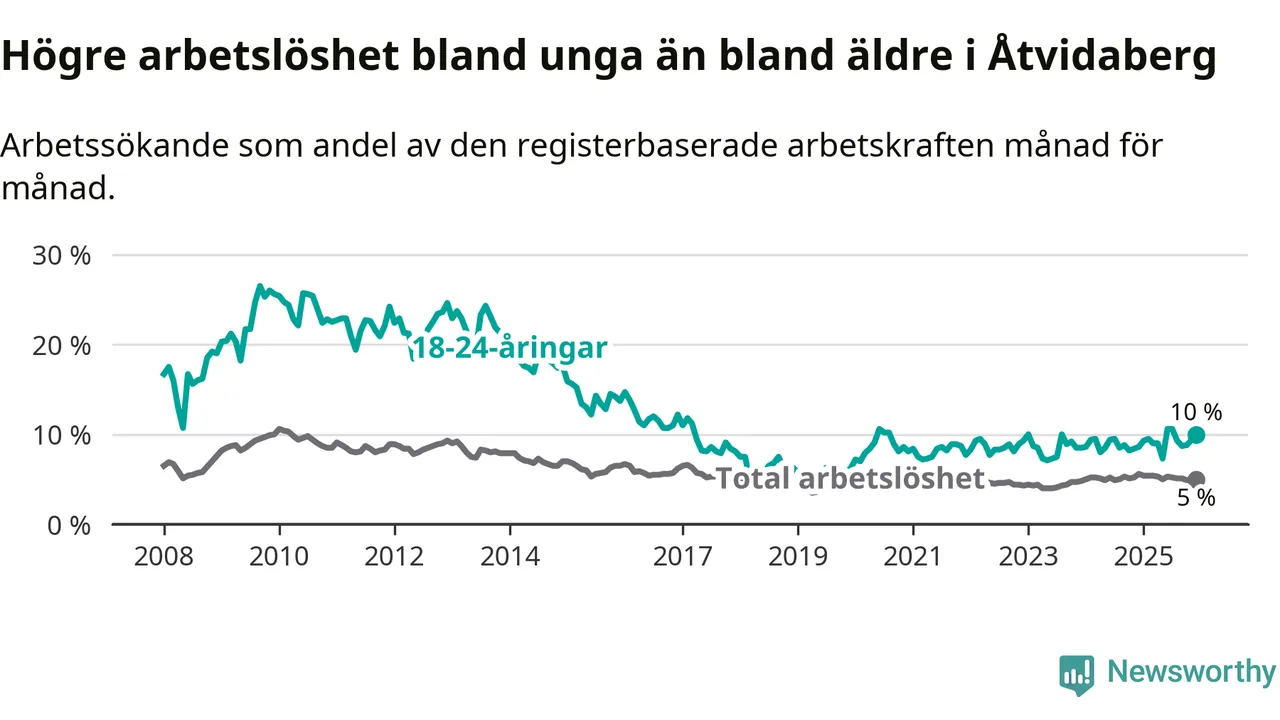 Medan Åtvidaberg har lägre total arbetslöshet än Östergötland, ligger ungdomsarbetslösheten 1,9 procentenheter högre i Åtvidaberg.
