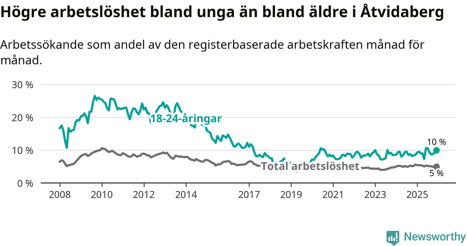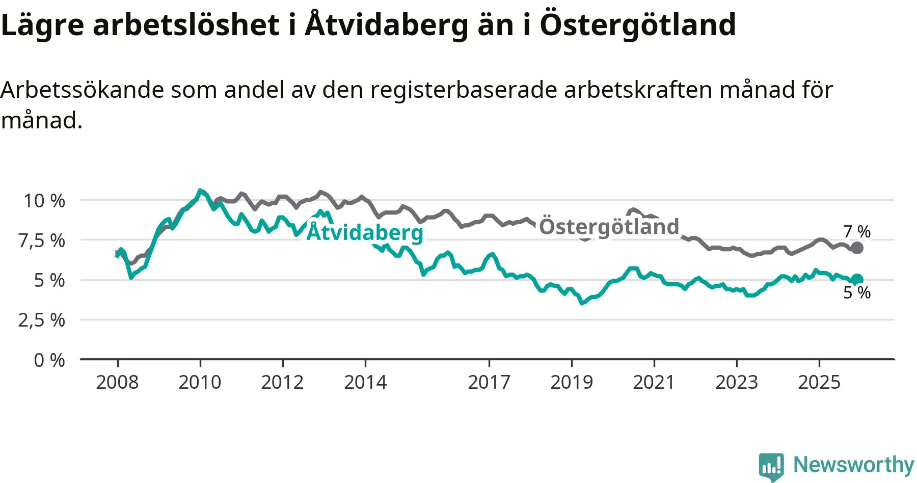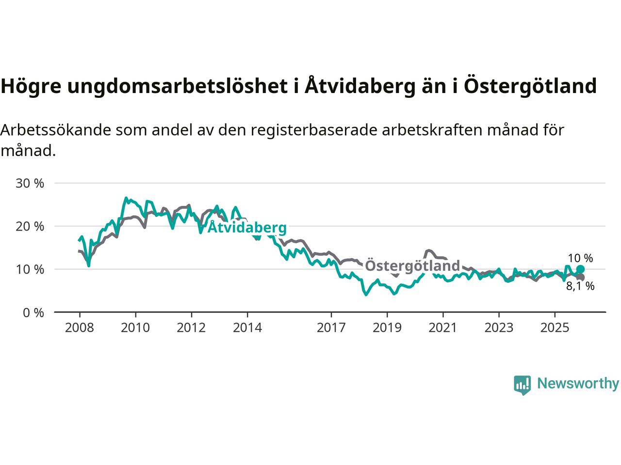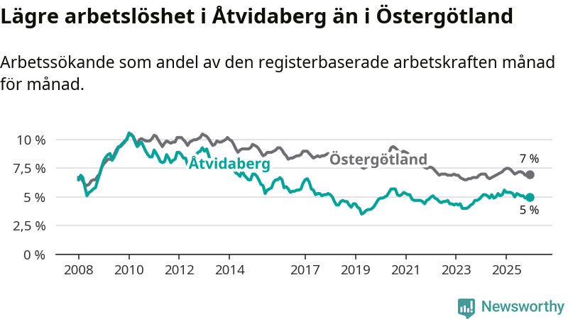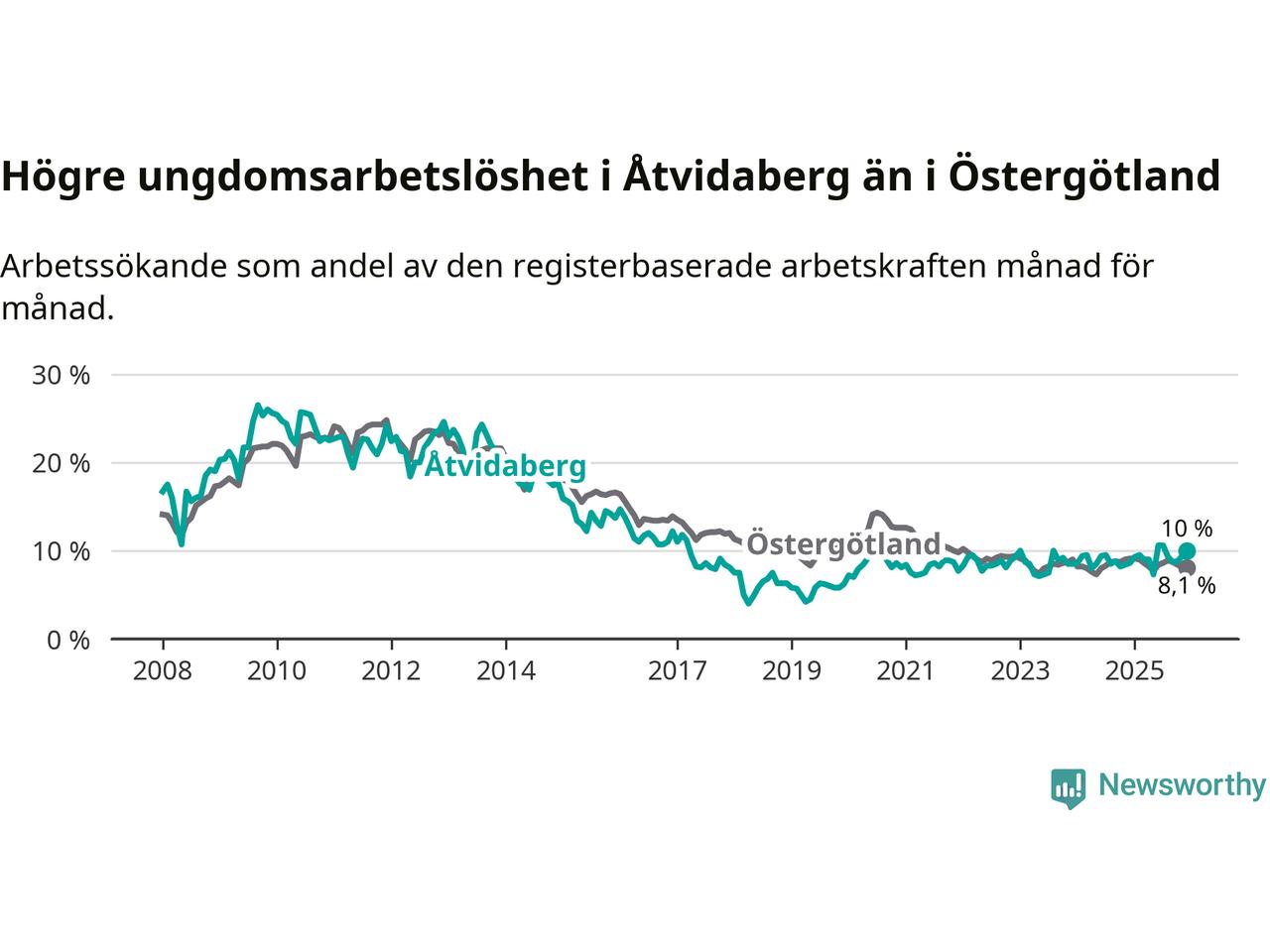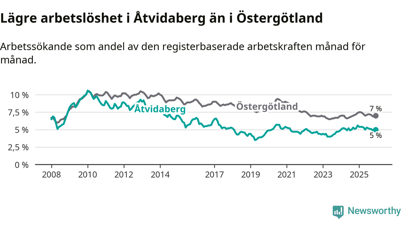 Medan Åtvidaberg har lägre total arbetslöshet än Östergötland, ligger ungdomsarbetslösheten 1,9 procentenheter högre i Åtvidaberg.