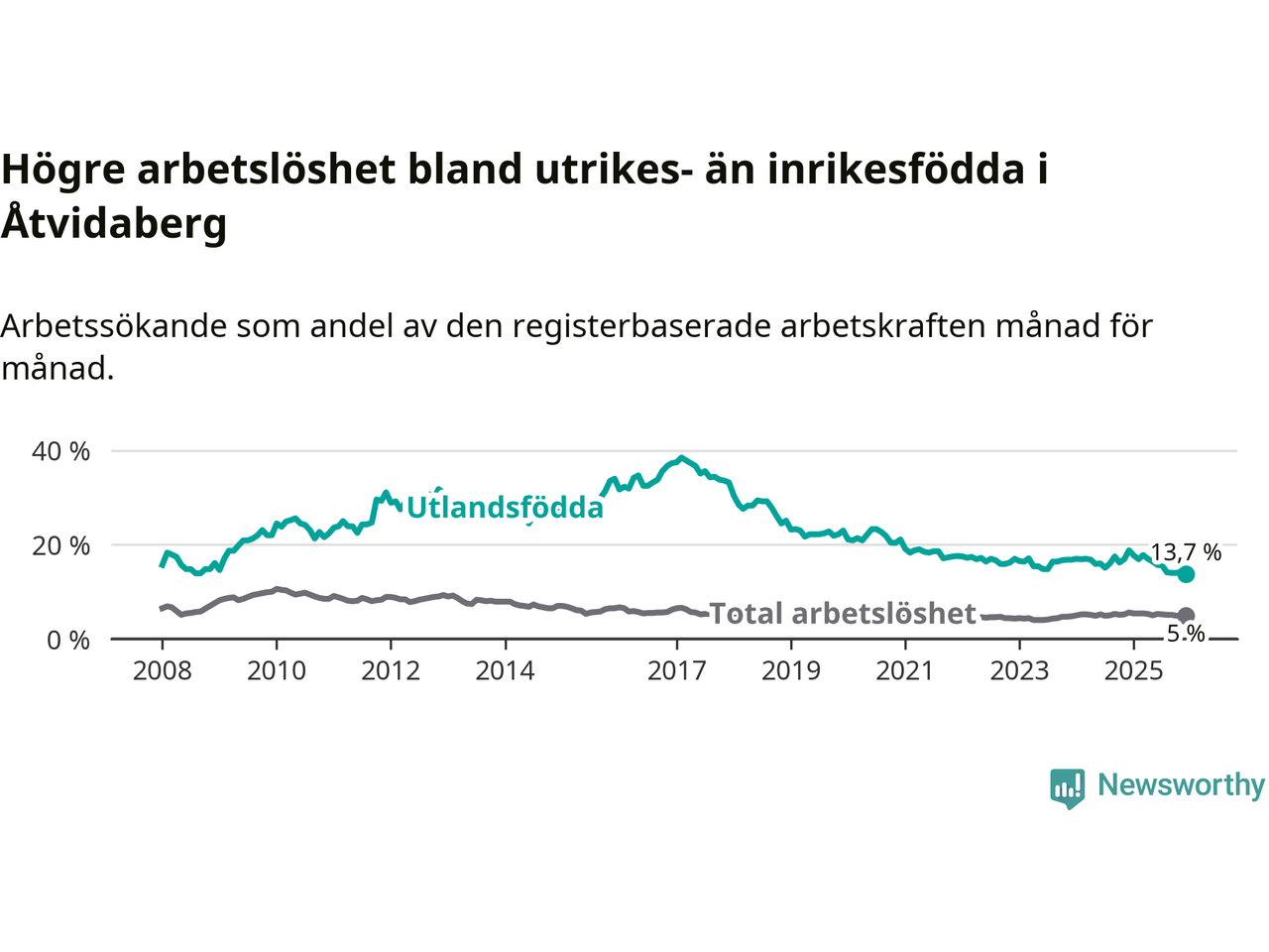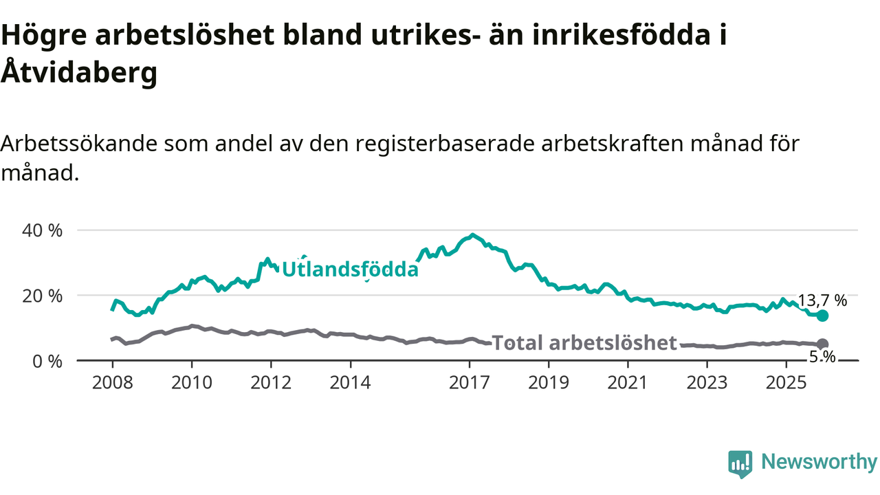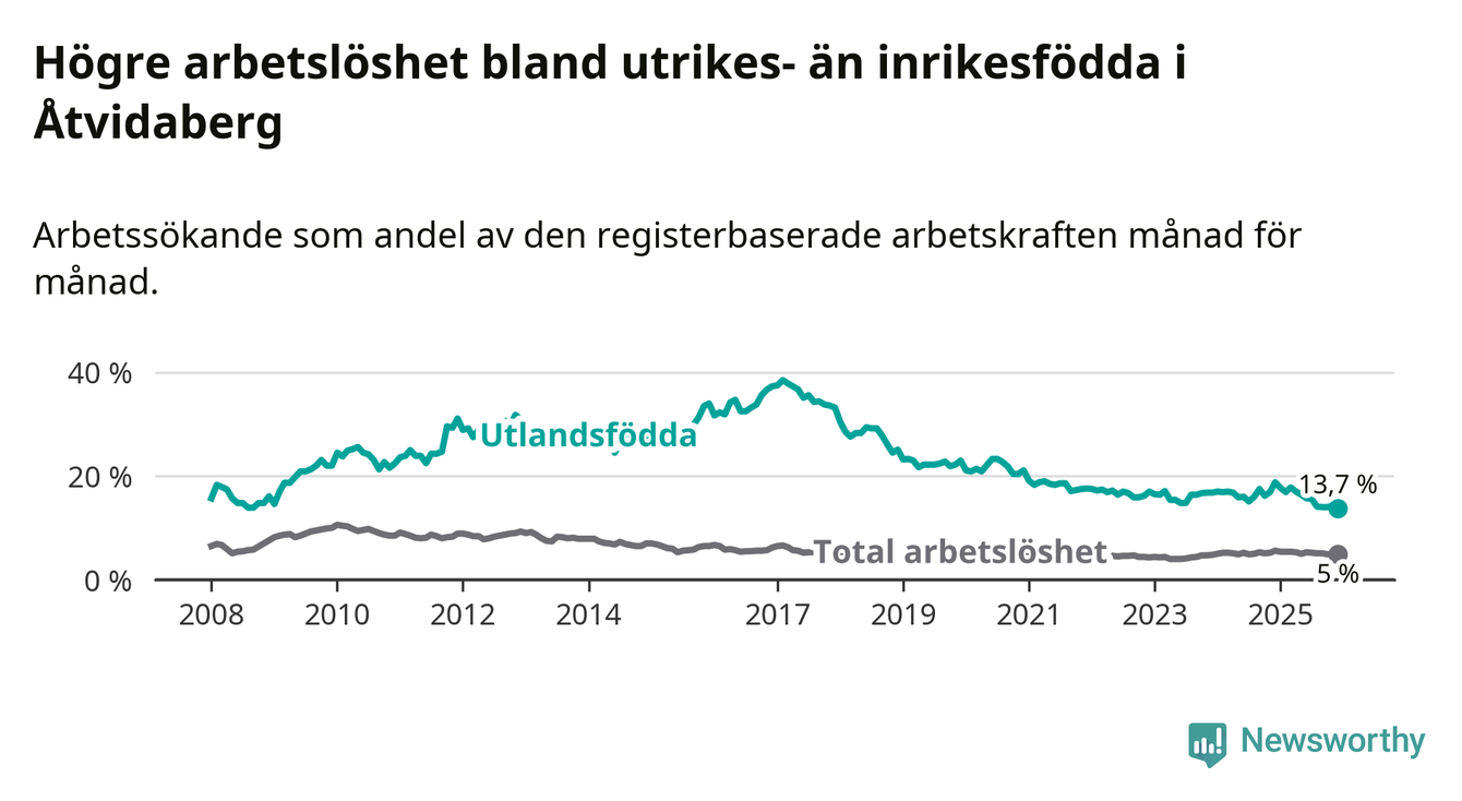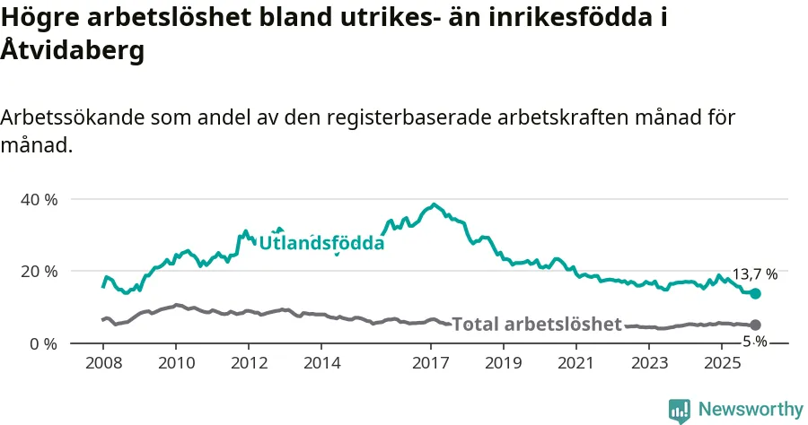 Skillnaden i arbetslöshet mellan utrikesfödda och hela befolkningen är 8,7 procentenheter i Åtvidaberg. Det är en betydligt mindre skillnad än för ett år sedan (−4,5 procentenheter).