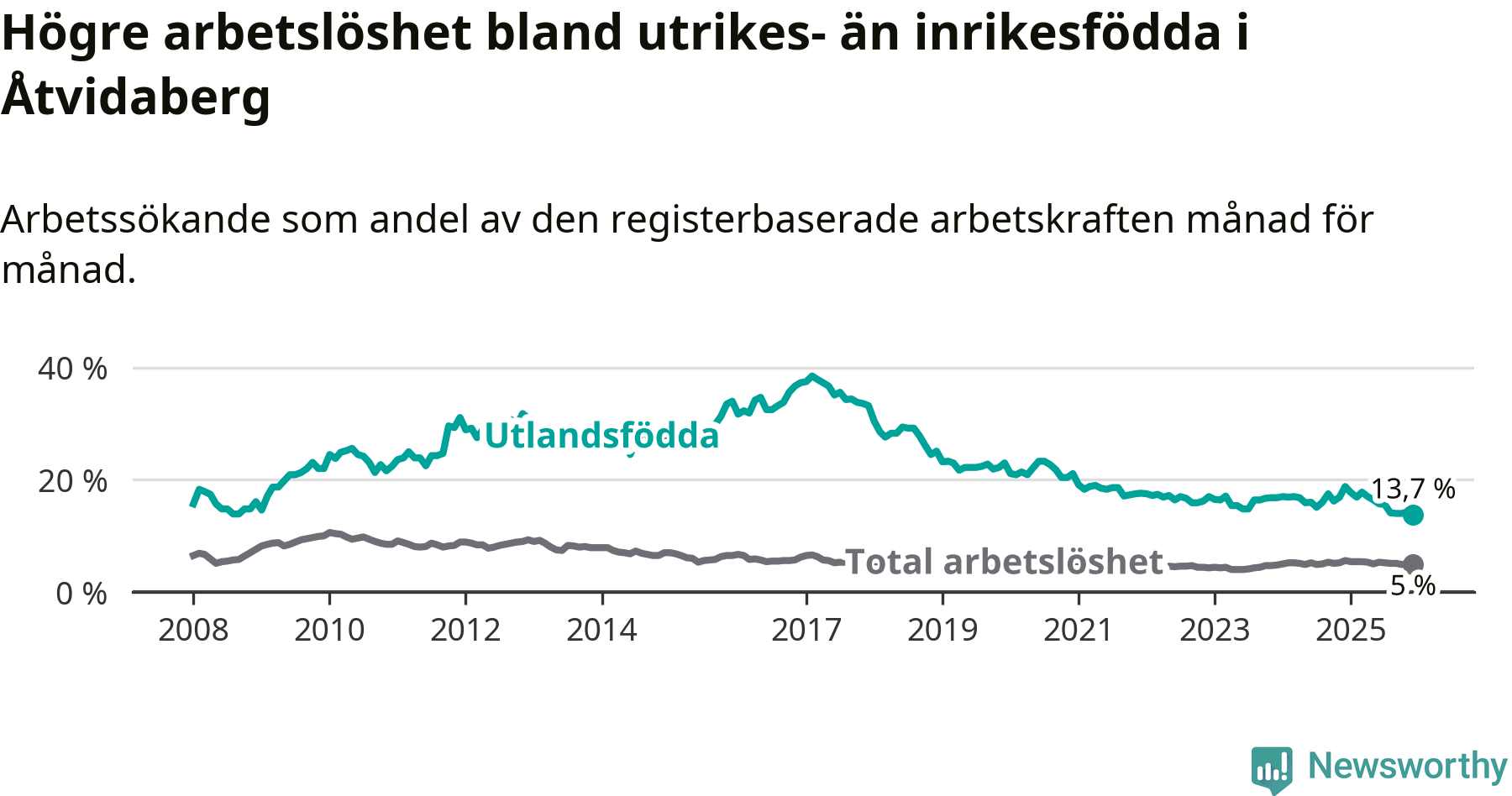 Läs mer om arbetslösheten bland utlandsfödda längre ner i den här texten.