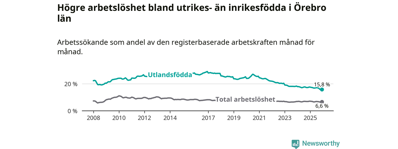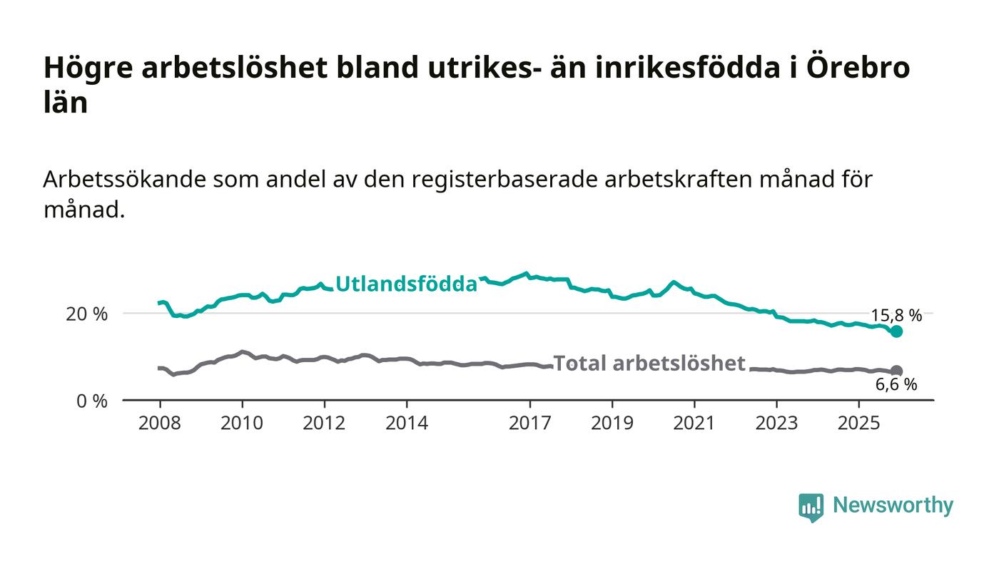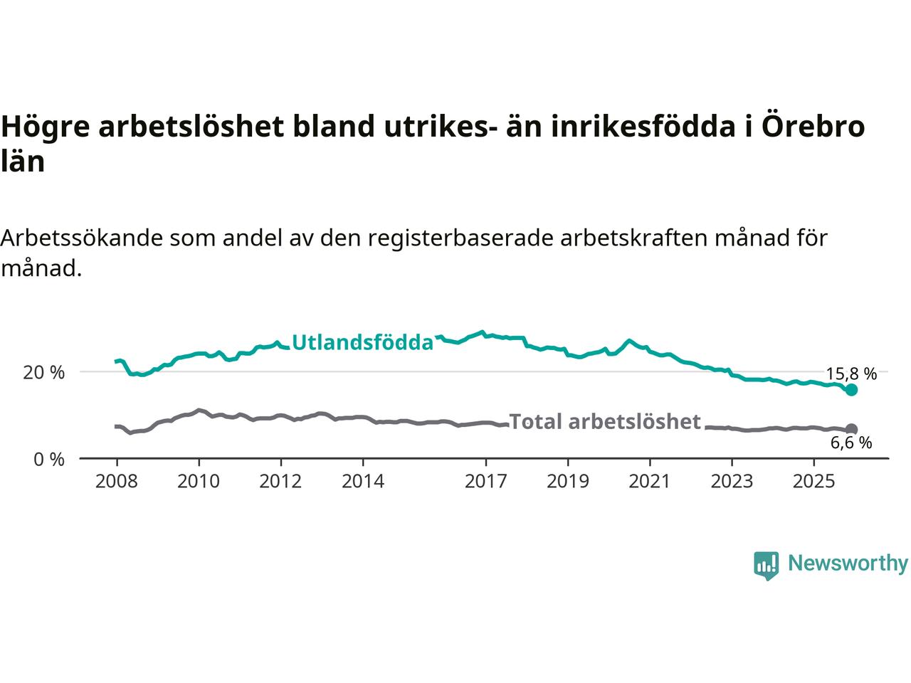 Arbetslösheten bland utlandsfödda var 15,8 procent i Örebro under december månad, motsvarande 5 048 av 31 949 personer. Det är 1,8 procentenheter färre än vid samma tidpunkt i fjol (−502 om man räknar personer). Därmed har de utlandsföddas arbetslöshet varit lägre än vid samma tidpunkt i fjol i över fyra år i sträck. Sedan februari 2021 har arbetslösheten bland utlandsfödda minskat från 24,3 till 15,8 procent.