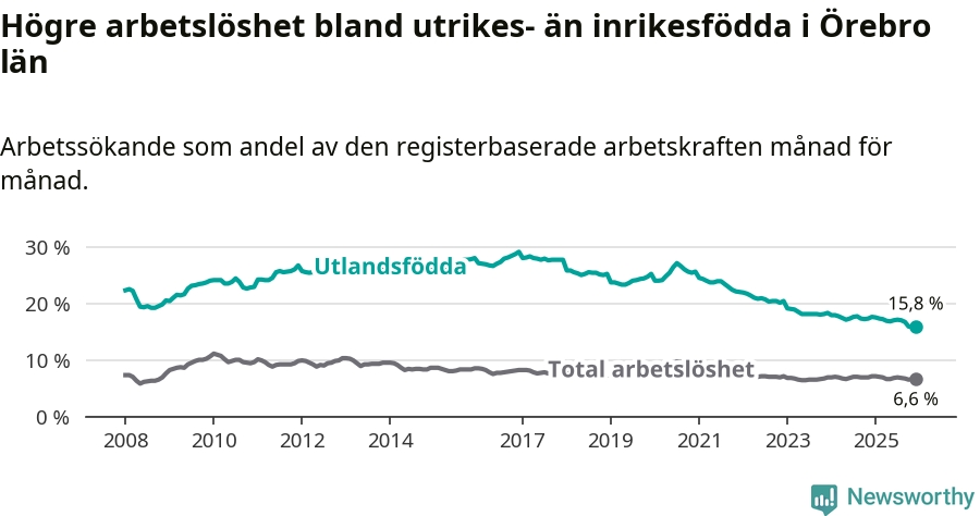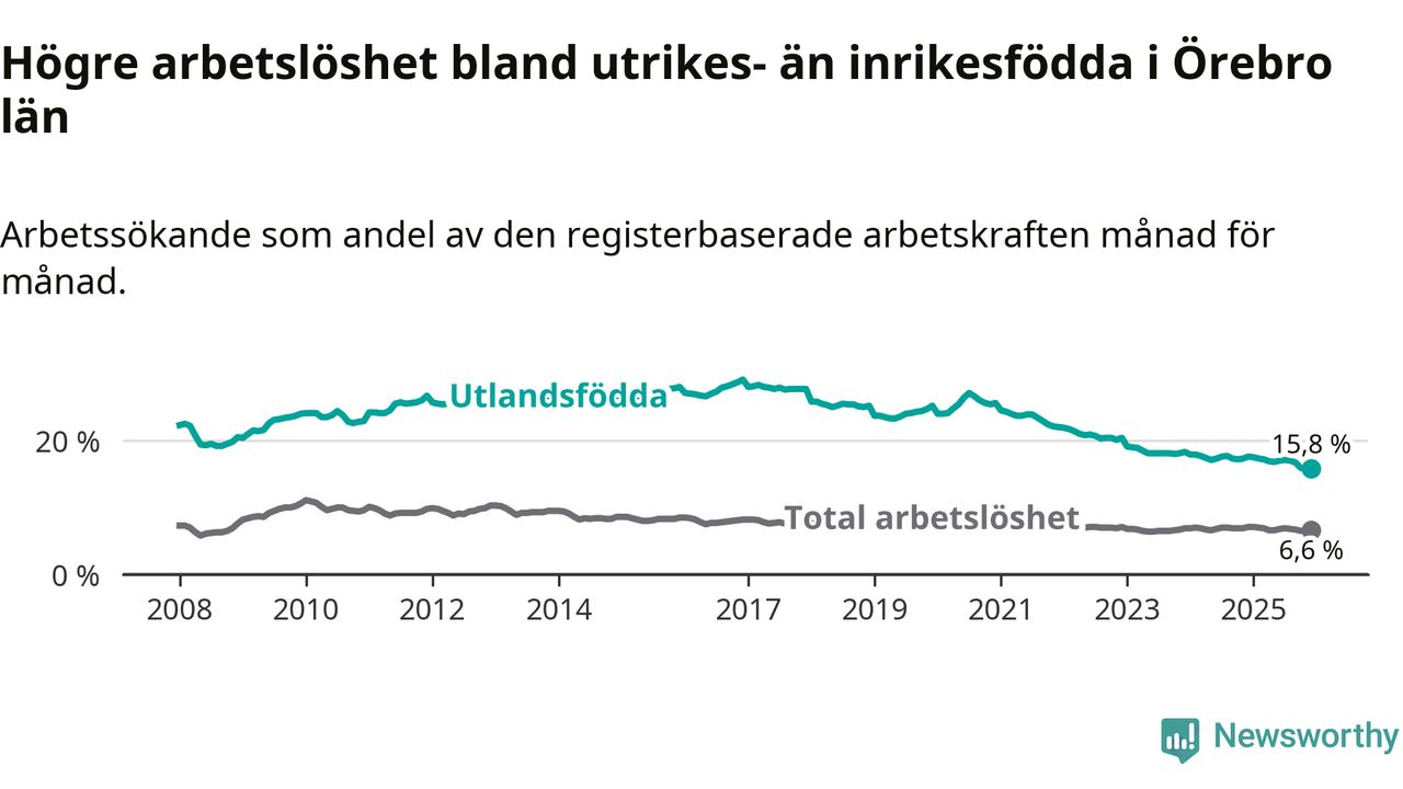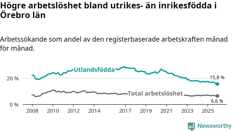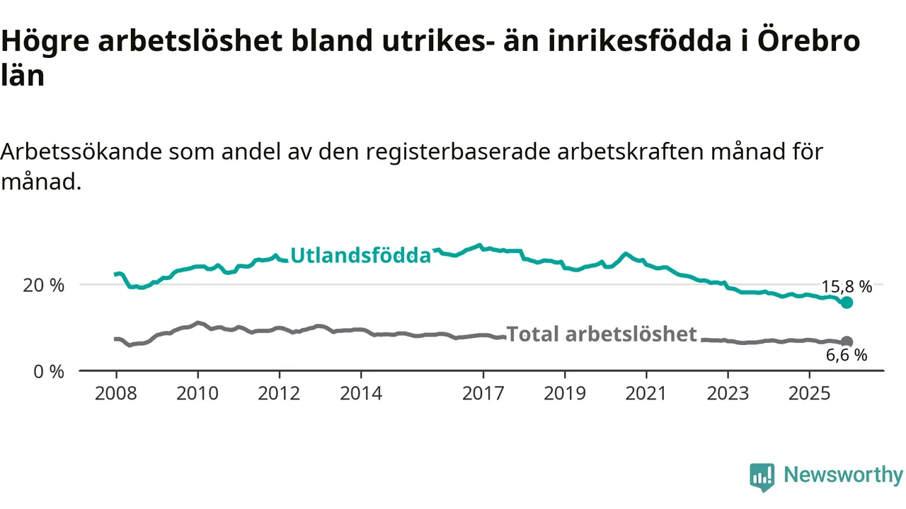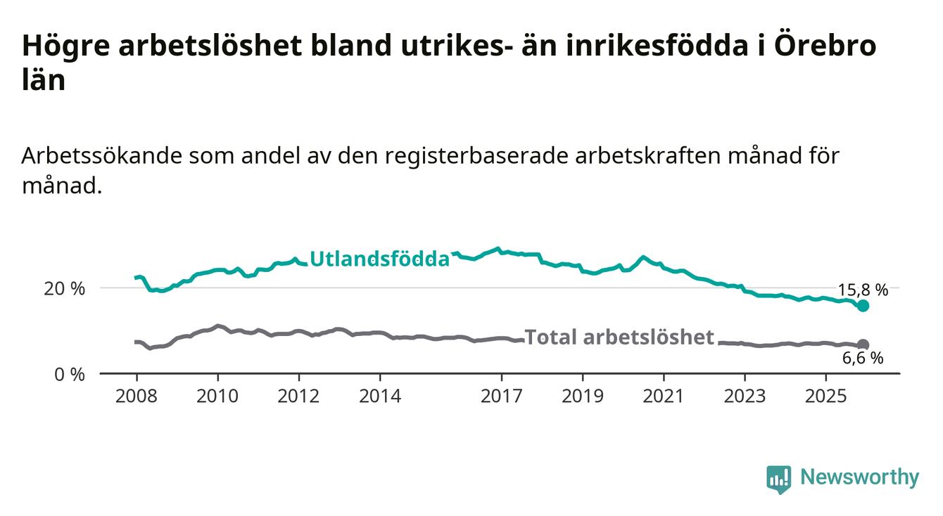 Arbetslösheten bland utlandsfödda var 15,8 procent i Örebro under december månad, motsvarande 5 048 av 31 949 personer. Det är 1,8 procentenheter färre än vid samma tidpunkt i fjol (−502 om man räknar personer). Därmed har de utlandsföddas arbetslöshet varit lägre än vid samma tidpunkt i fjol i över fyra år i sträck. Sedan februari 2021 har arbetslösheten bland utlandsfödda minskat från 24,3 till 15,8 procent.