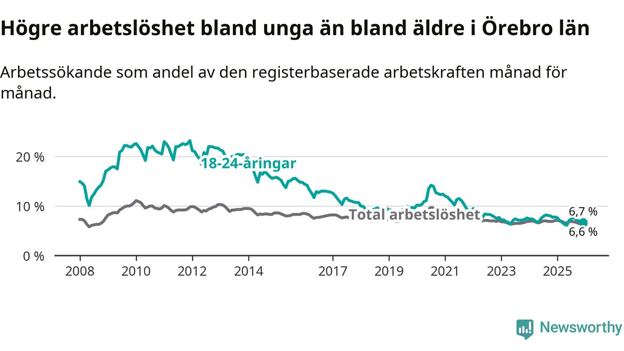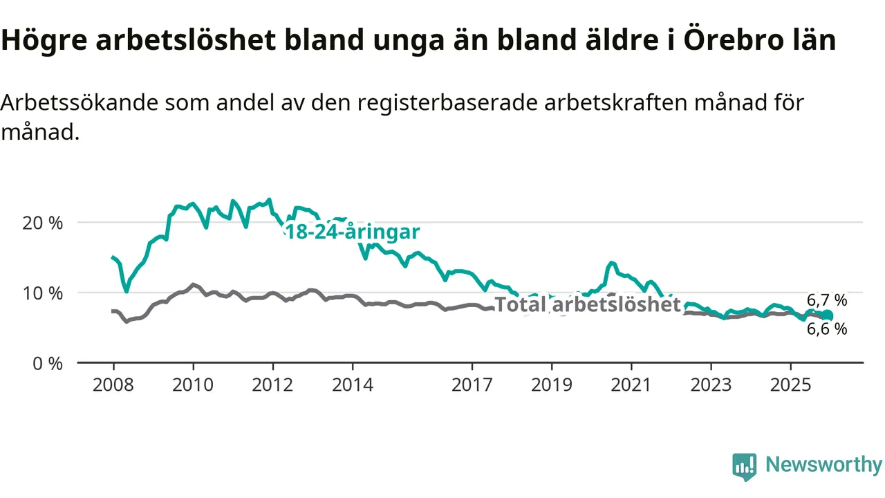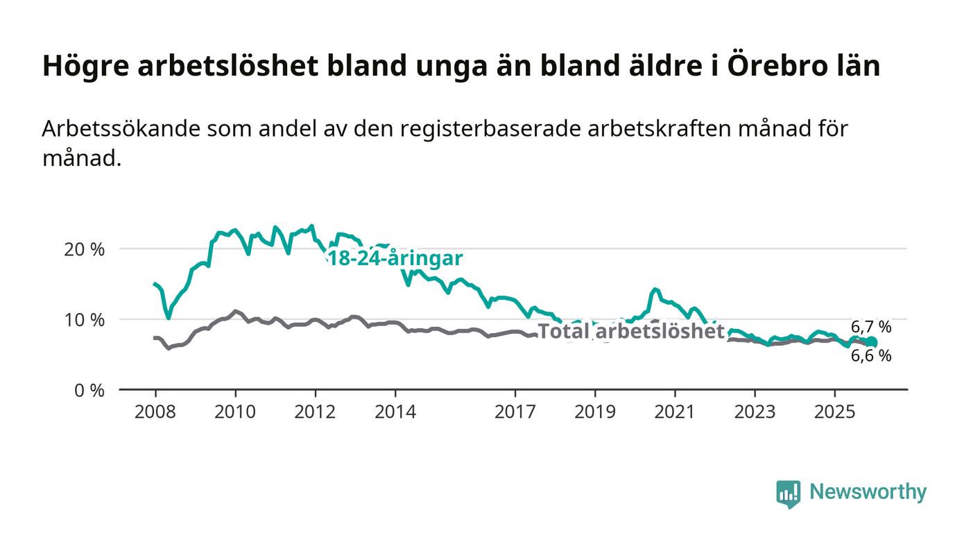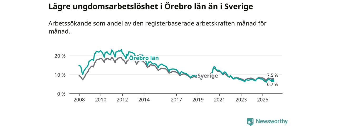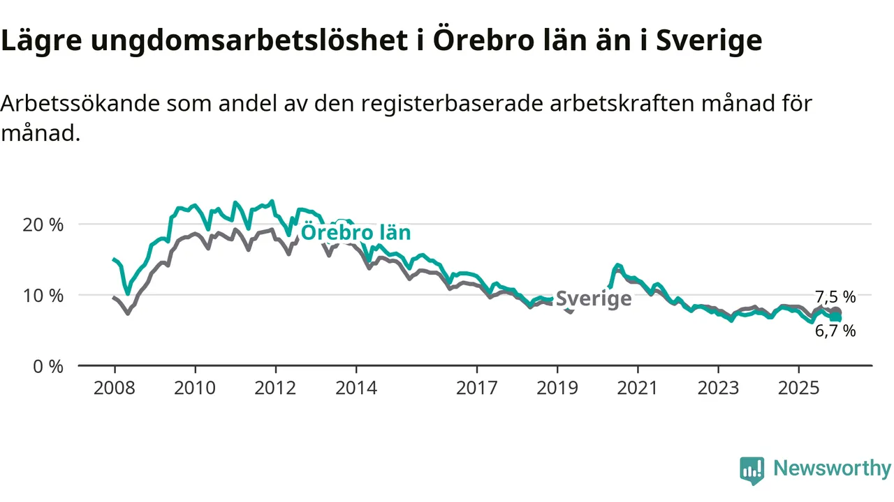 I och med den senaste månadens nedgång har de ungas arbetslöshet i Örebro sjunkit elva månader i följd (ner från 7,6 procent i januari 2025 till 6,7 procent nu).