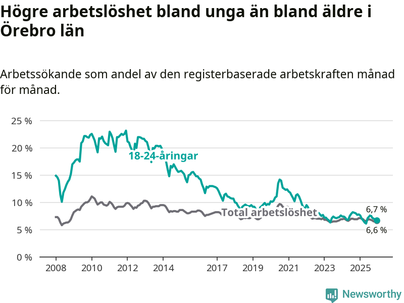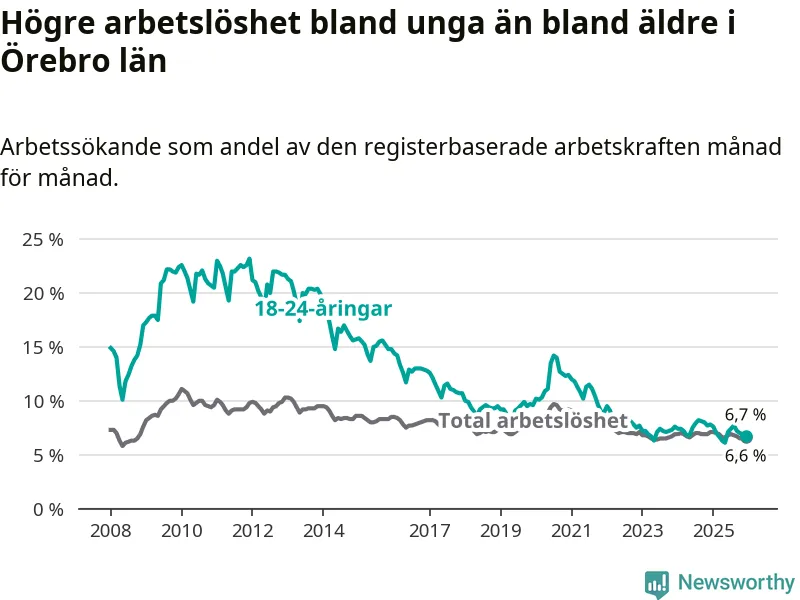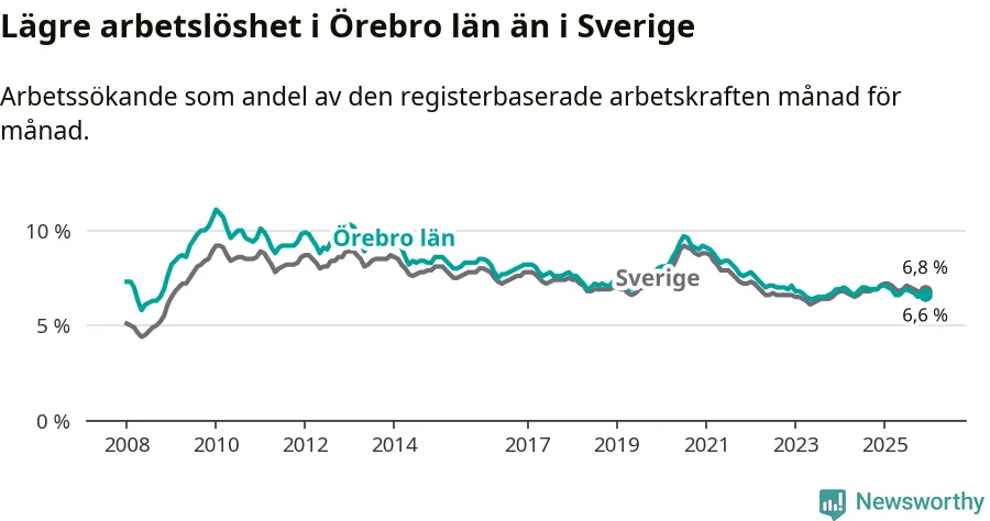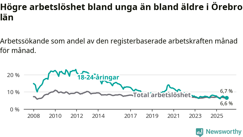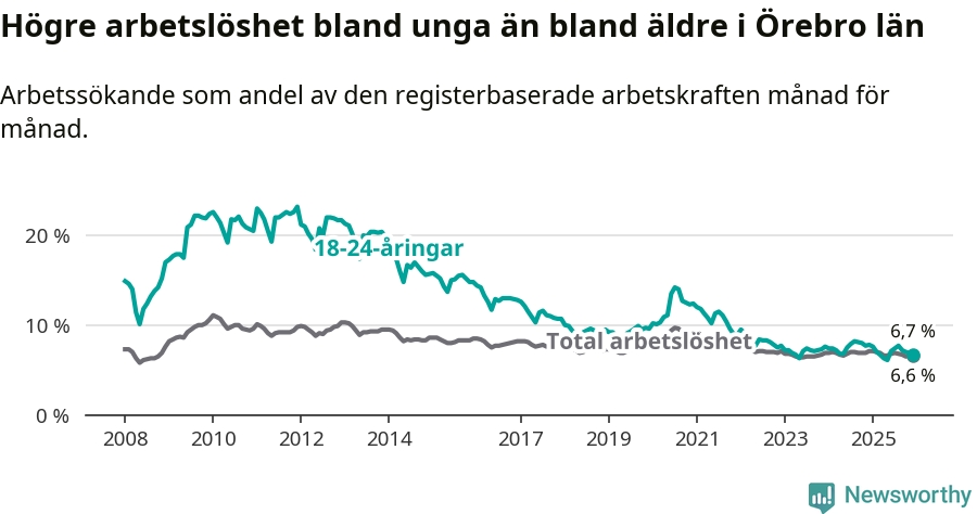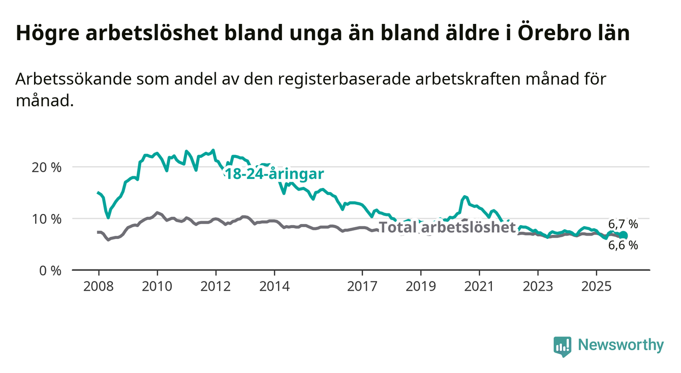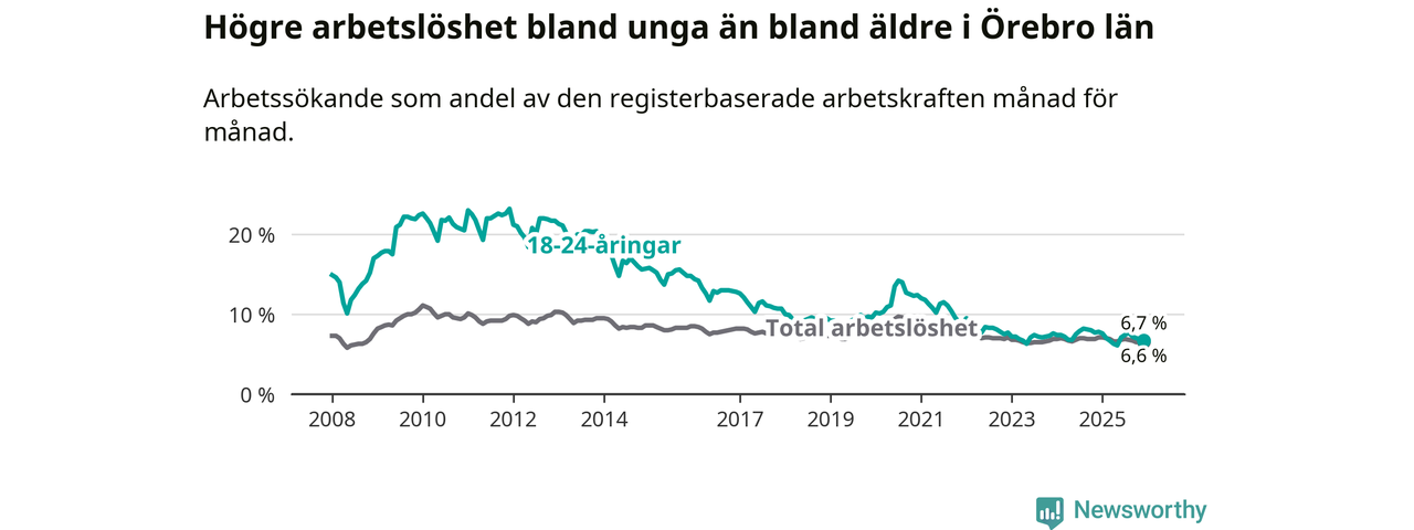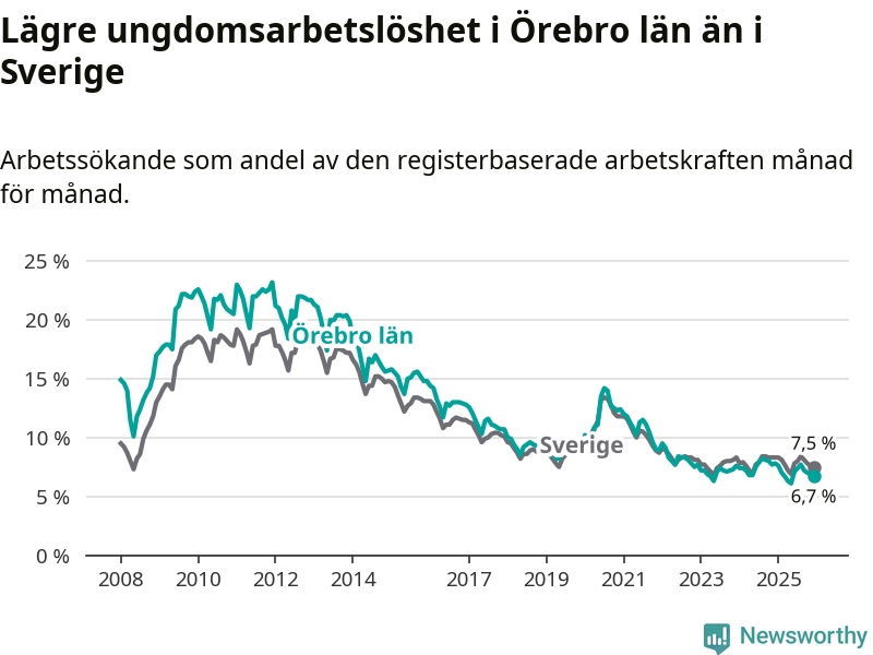 I och med den senaste månadens nedgång har de ungas arbetslöshet i Örebro sjunkit elva månader i följd (ner från 7,6 procent i januari 2025 till 6,7 procent nu).