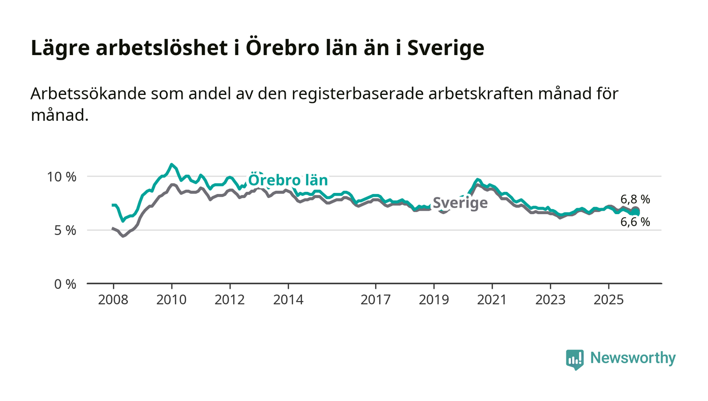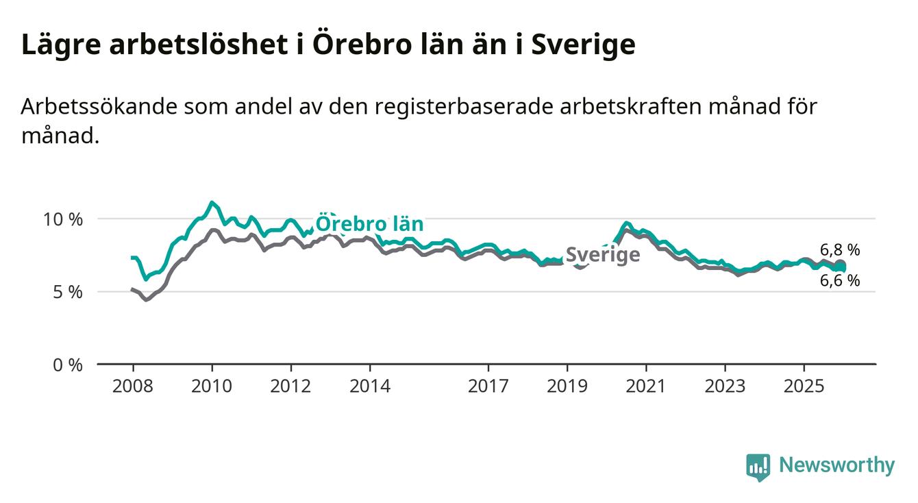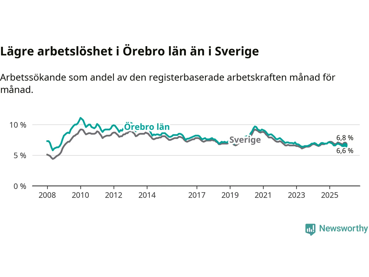 Örebro hade redan tidigare lägre arbetslöshet än snittet i hela Sverige och nu växer klyftan (6,6 procent i länet, jämfört med 6,8 procent i hela riket). Norrbotten har den lägsta arbetslösheten i riket (3,8 procent), medan Skåne har den högsta (8,9 procent). För att Örebro skulle komma ner i samma arbetslöshetsnivå som Norrbotten skulle 4 245 personer behöva sysselsättas.