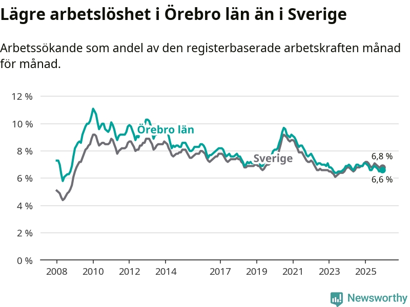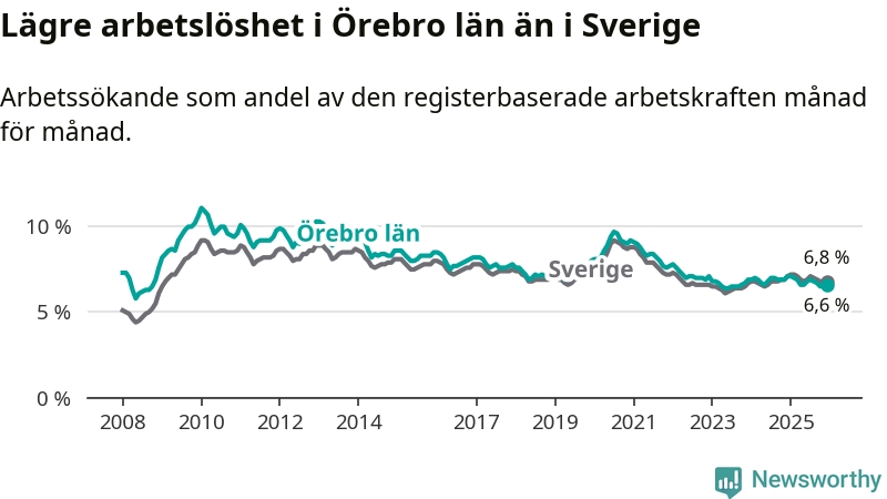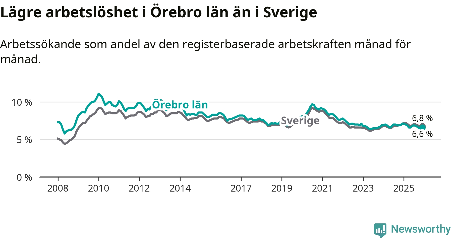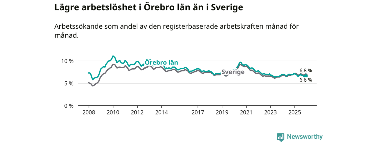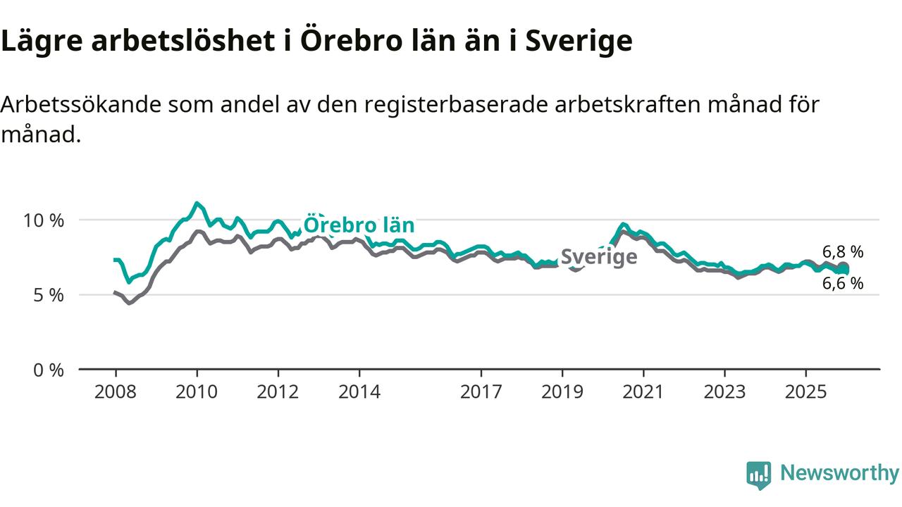 Örebro hade redan tidigare lägre arbetslöshet än snittet i hela Sverige och nu växer klyftan (6,6 procent i länet, jämfört med 6,8 procent i hela riket). Norrbotten har den lägsta arbetslösheten i riket (3,8 procent), medan Skåne har den högsta (8,9 procent). För att Örebro skulle komma ner i samma arbetslöshetsnivå som Norrbotten skulle 4 245 personer behöva sysselsättas.