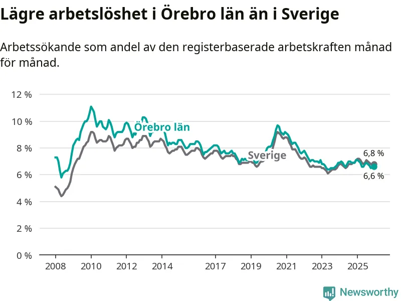 Under december månad rapporterade Örebro län en total arbetslöshet på 6,6 procent. Det är en minskning jämfört med samma tidpunkt i fjol (−0,5 procentenheter). Även i Sverige sjunker arbetslösheten .
