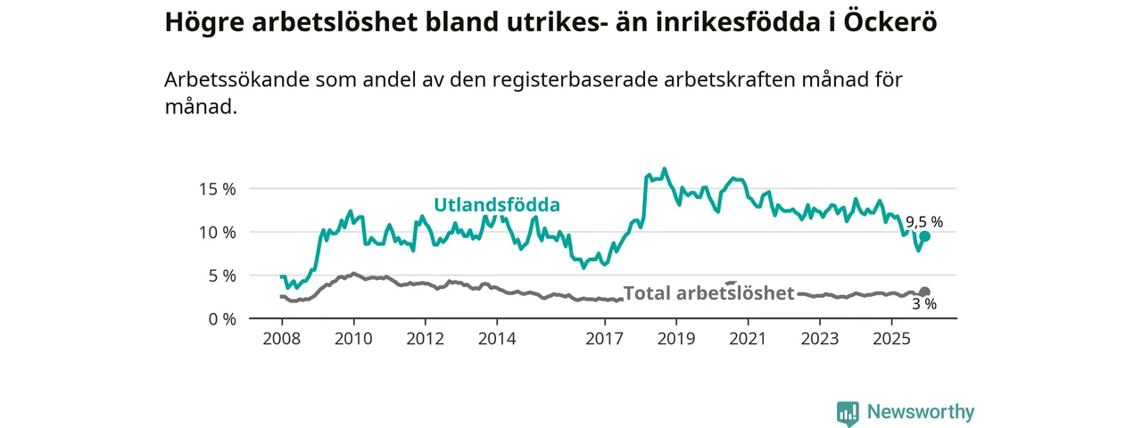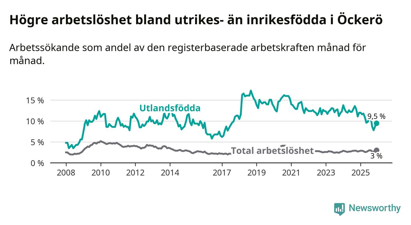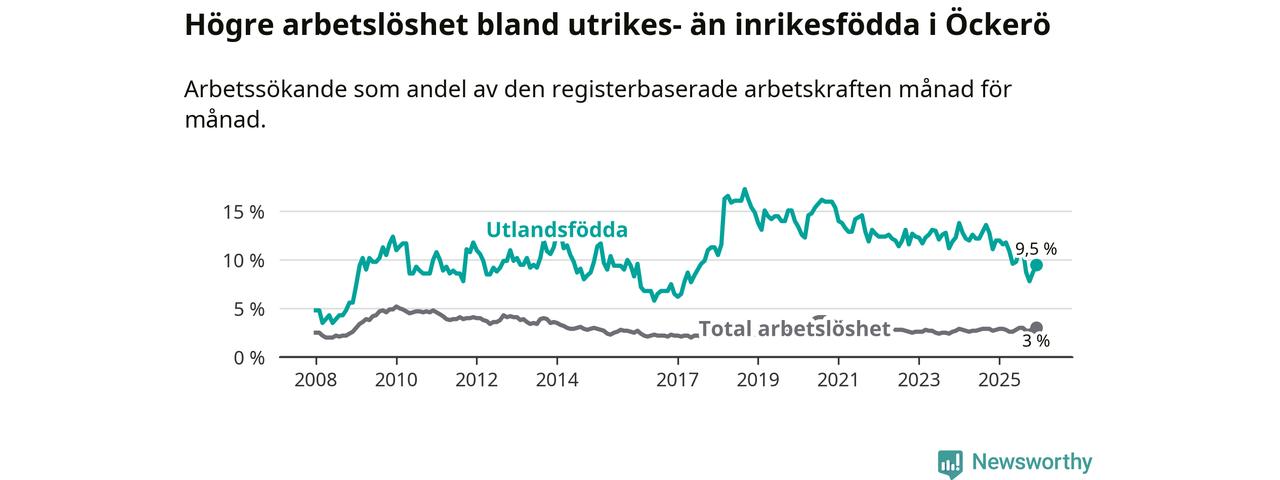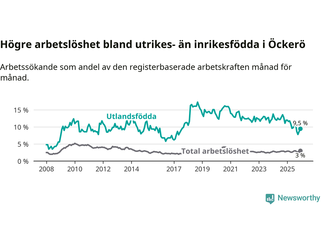 Arbetslösheten bland utlandsfödda var 9,5 procent på Öckerö under december månad, motsvarande 44 av 463 personer. Det är 2,5 procentenheter färre än vid samma tidpunkt i fjol (−11 om man räknar personer). Därmed är de utlandsföddas arbetslöshet lägre än vid samma tidpunkt i fjol för 14:e månaden i följd. Sedan oktober 2024 har arbetslösheten bland utlandsfödda minskat från 12,8 till 9,5 procent.