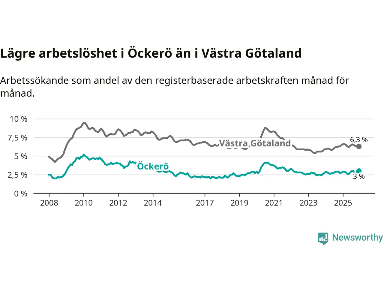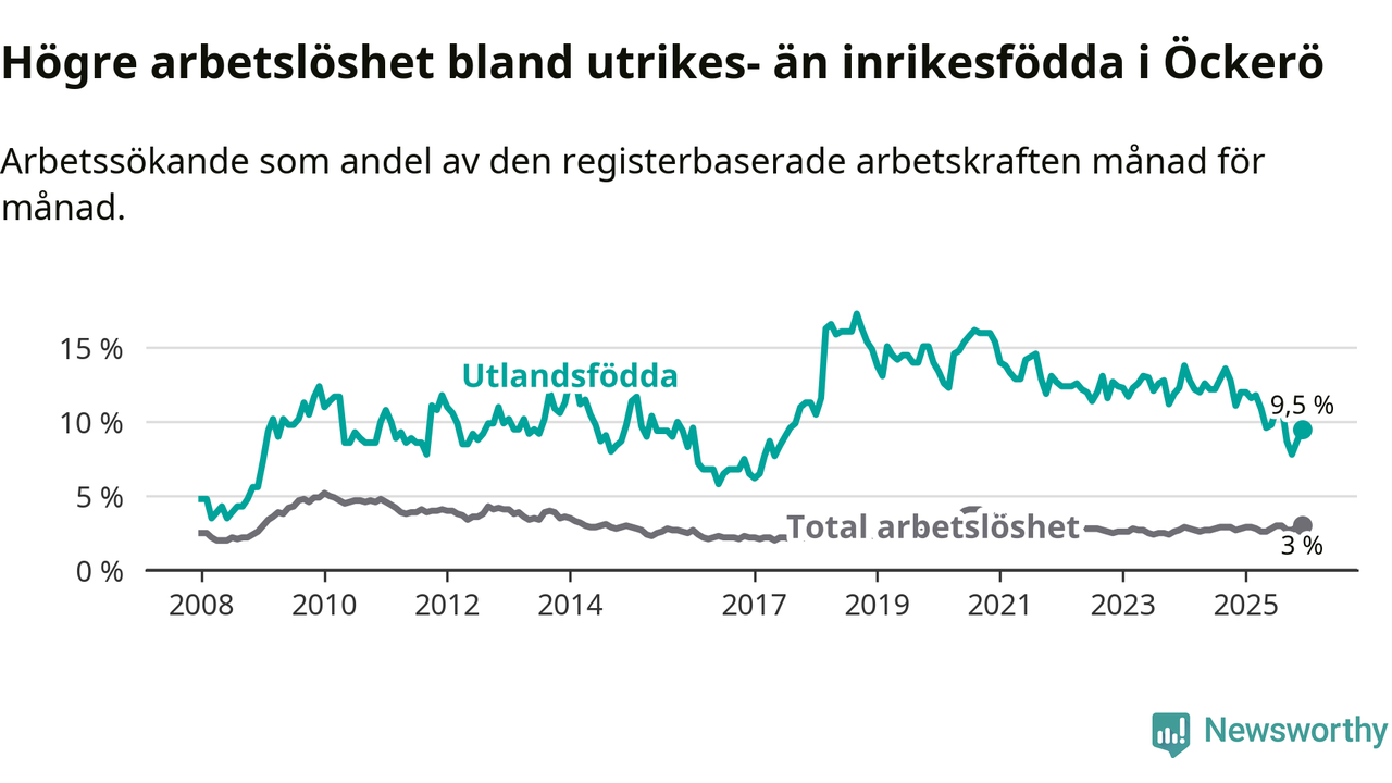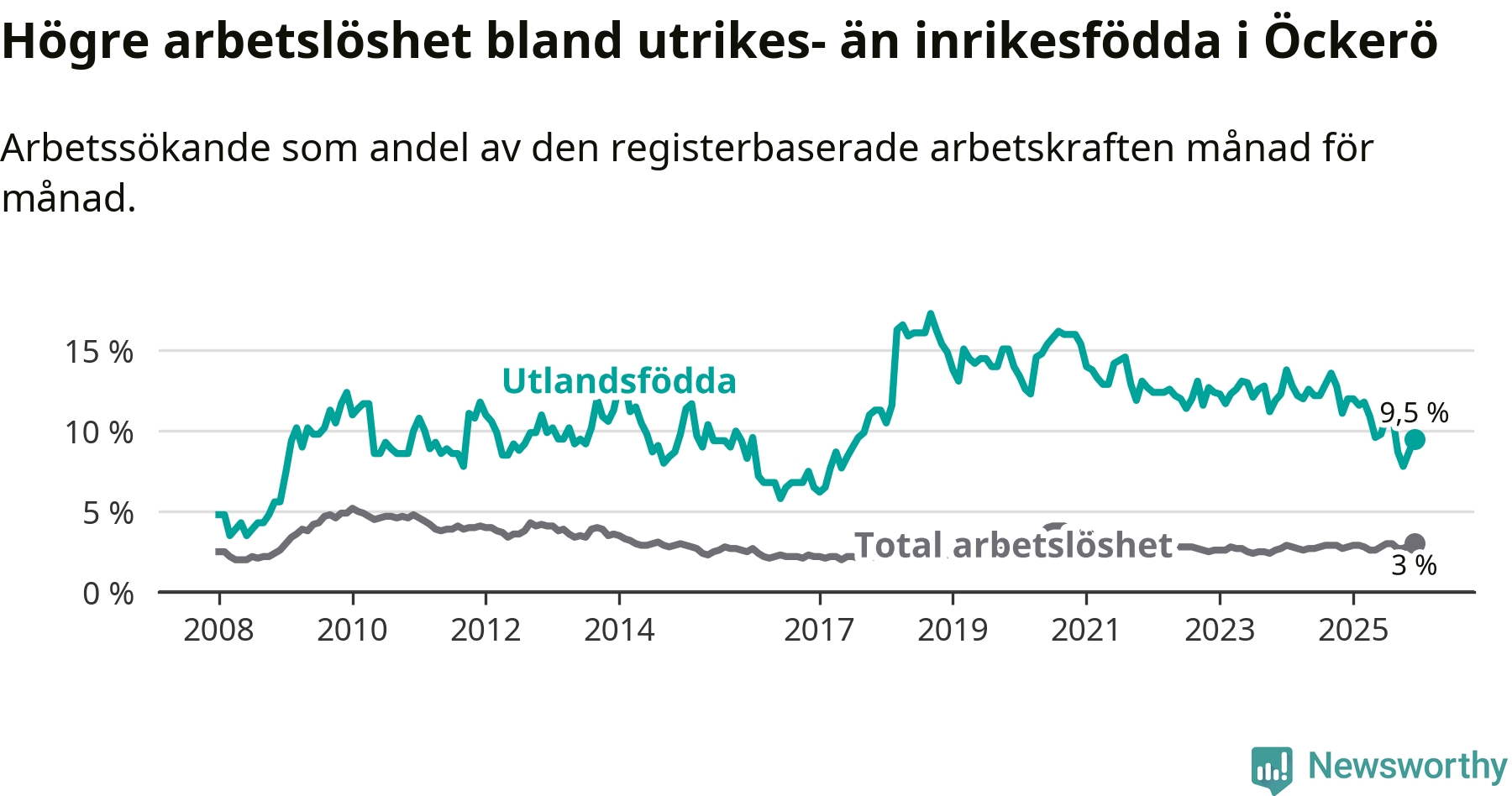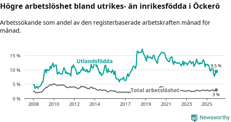 Arbetslösheten bland utlandsfödda var 9,5 procent på Öckerö under december månad, motsvarande 44 av 463 personer. Det är 2,5 procentenheter färre än vid samma tidpunkt i fjol (−11 om man räknar personer). Därmed är de utlandsföddas arbetslöshet lägre än vid samma tidpunkt i fjol för 14:e månaden i följd. Sedan oktober 2024 har arbetslösheten bland utlandsfödda minskat från 12,8 till 9,5 procent.