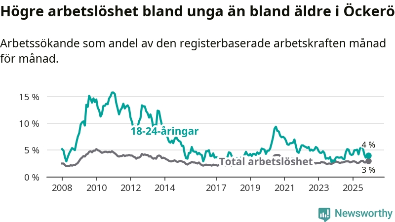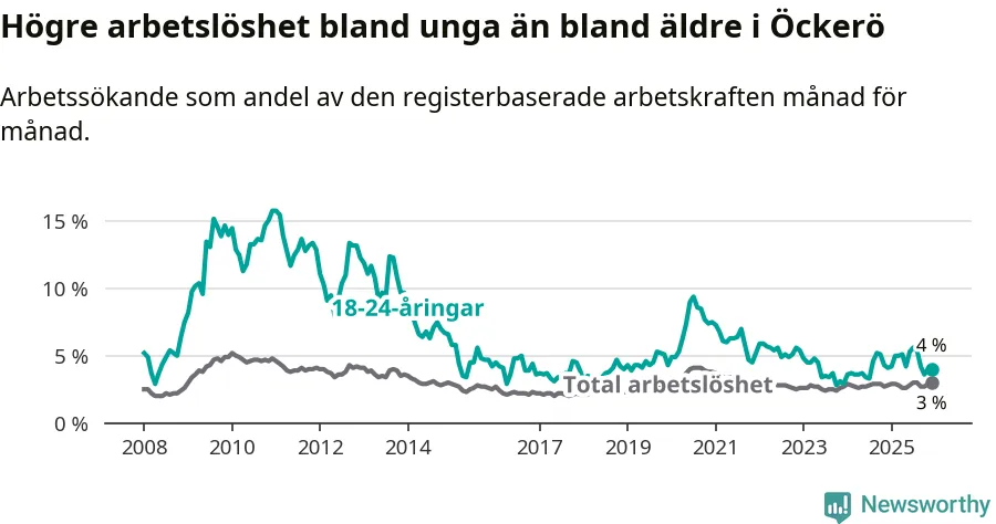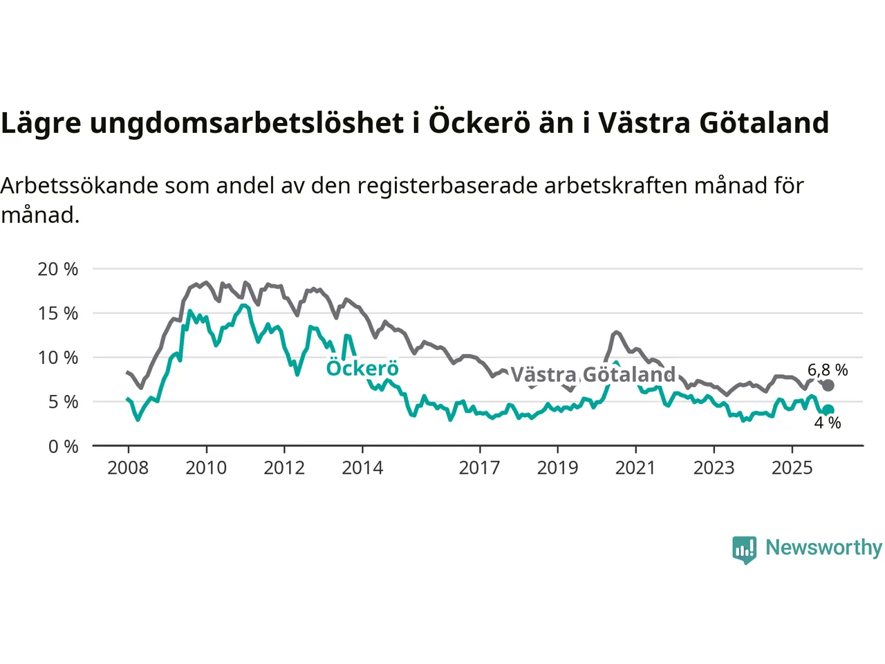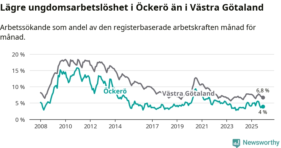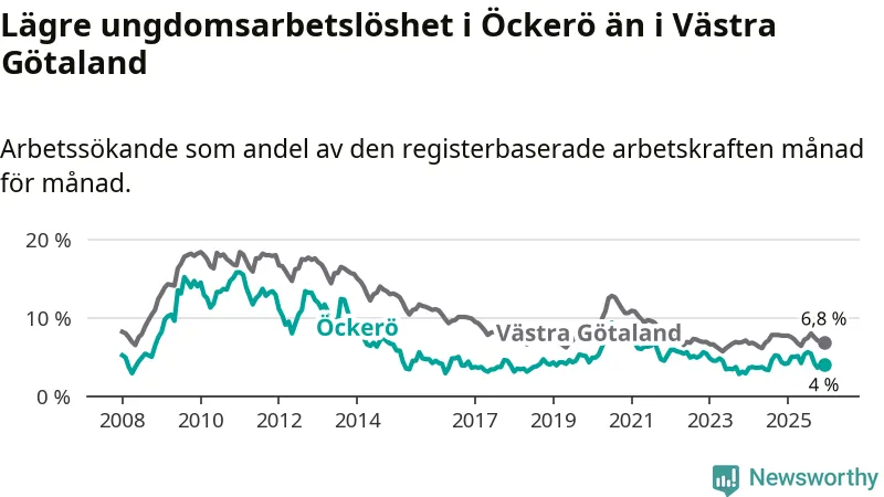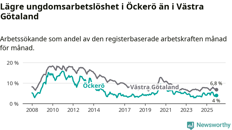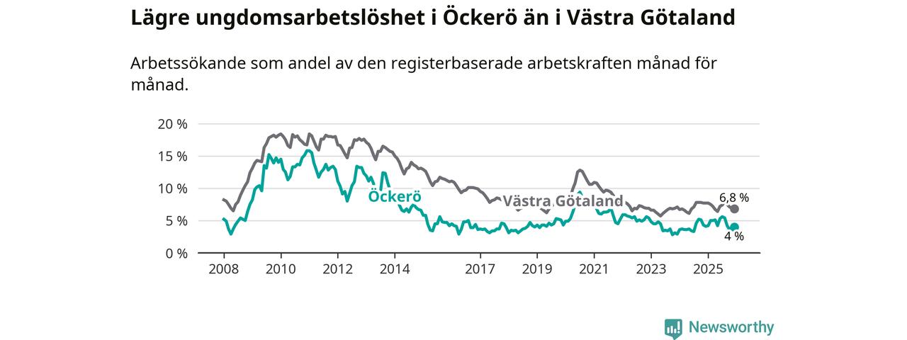 Precis som den totala arbetslösheten ligger ungdomsarbetslösheten på Öckerö lägre än i Västra Götaland som helhet. Skillnaden mellan kommunen och länet är 2,8 procentenheter.