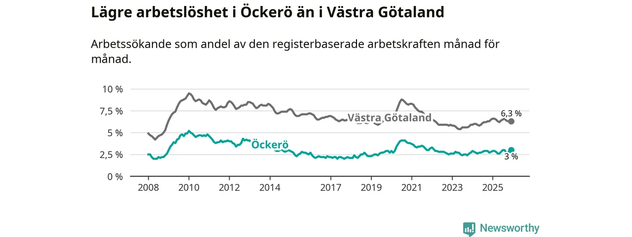 Ny statistik från Arbetsförmedlingen visar på en uppgång i arbetslöshet i Öckerö kommun. I Västra Götaland däremot minskar arbetslösheten.