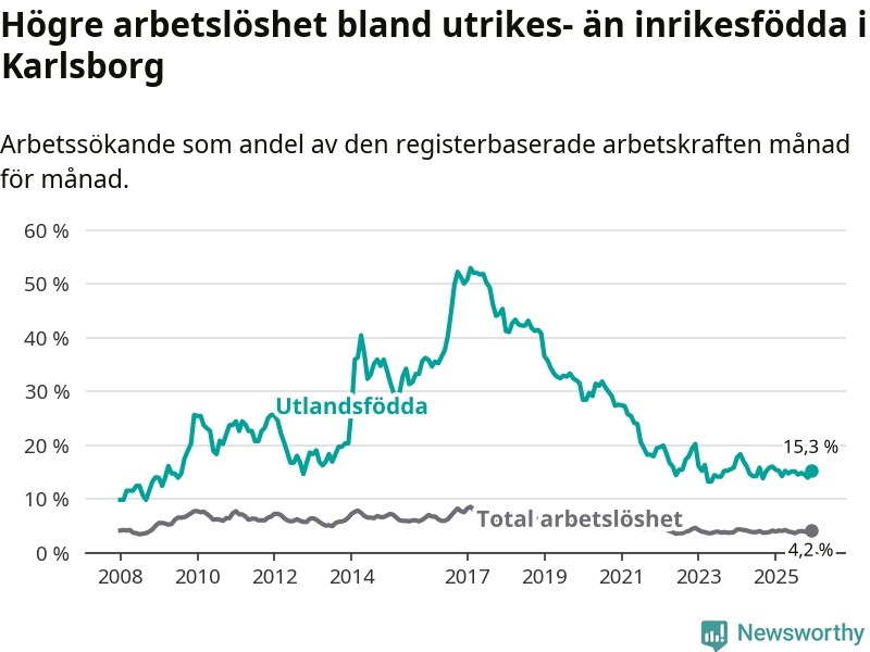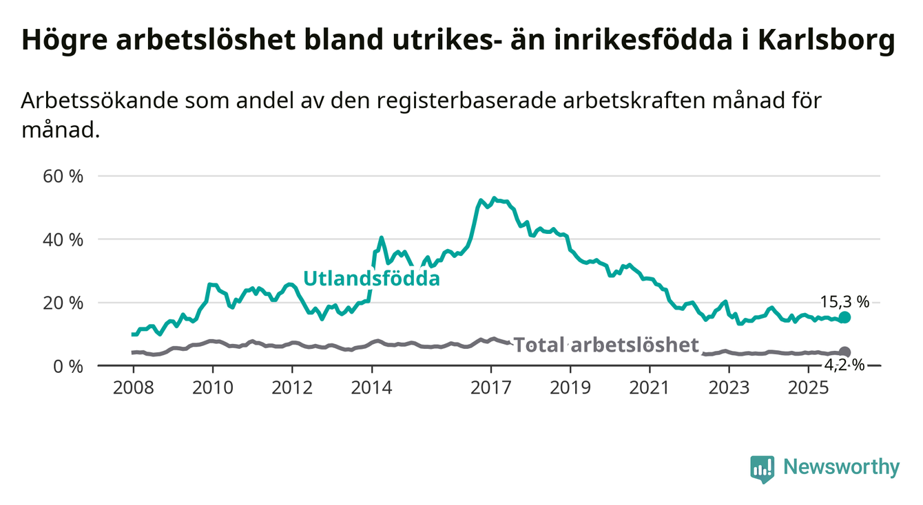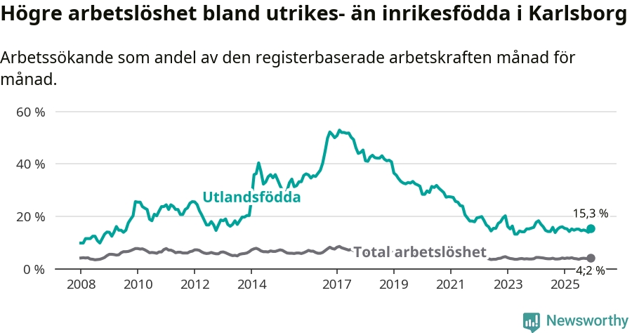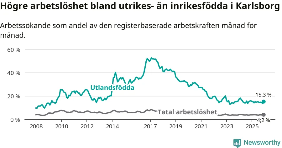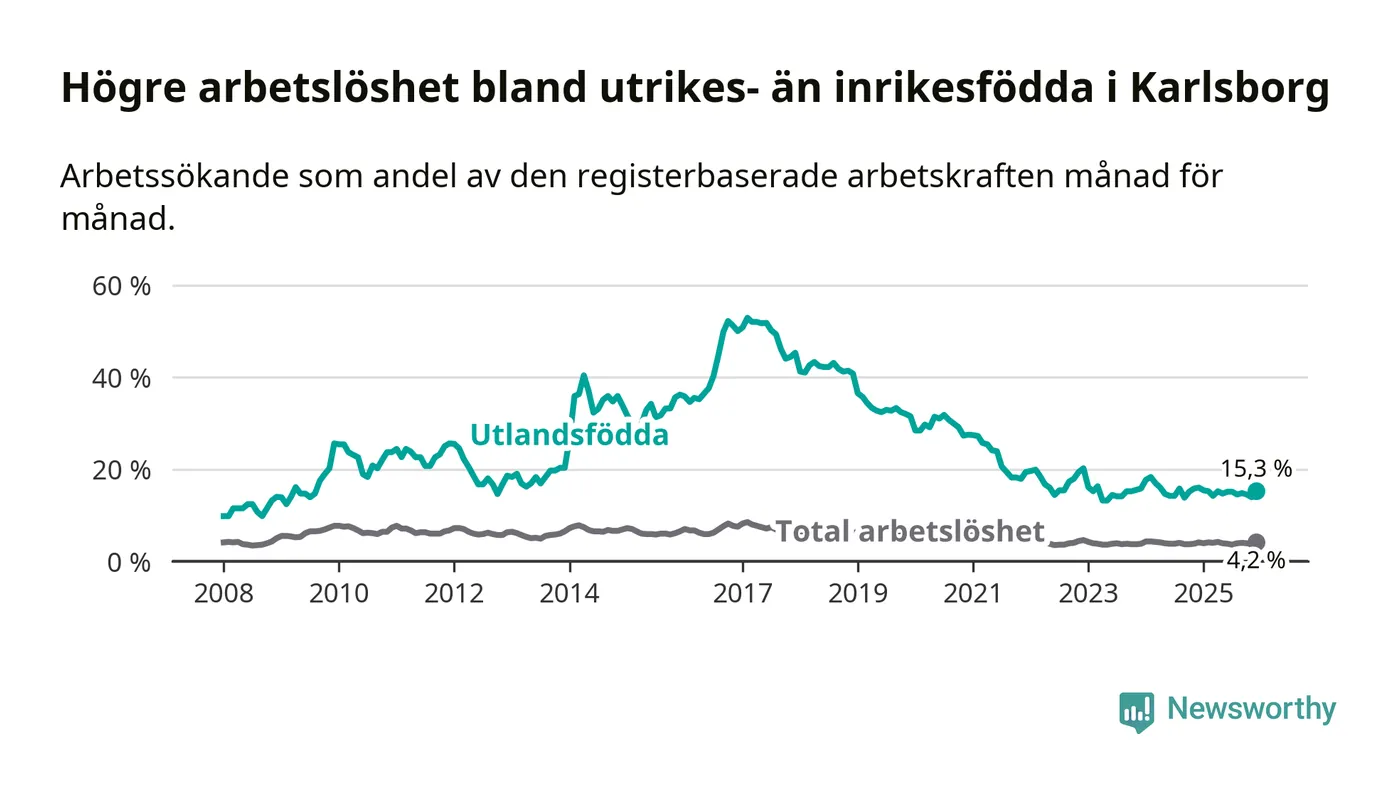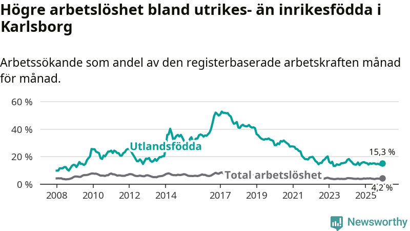 Arbetslösheten bland utlandsfödda var 15,3 procent i Karlsborg under december månad, motsvarande 46 av 301 personer. Det är 0,7 procentenheter färre än vid samma tidpunkt i fjol (−4 om man räknar personer).