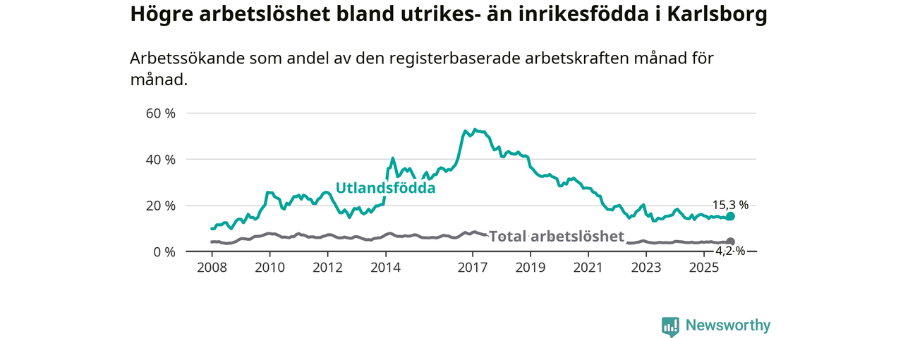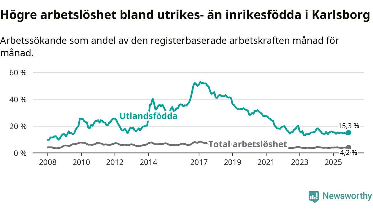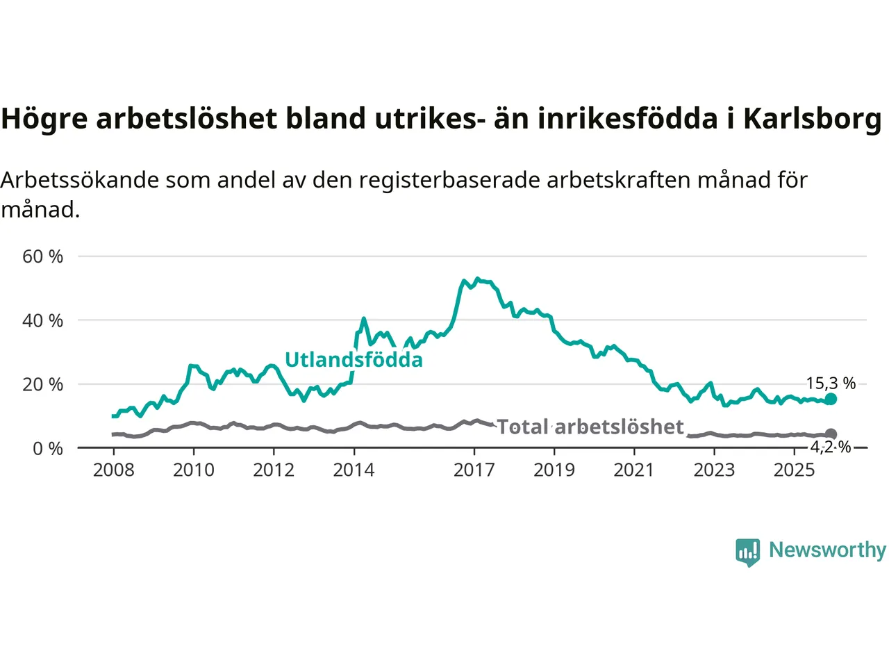 Skillnaden i arbetslöshet mellan utrikesfödda och hela befolkningen är 11,1 procentenheter i Karlsborg. Det är en mindre skillnad än för ett år sedan (−0,8 procentenheter).