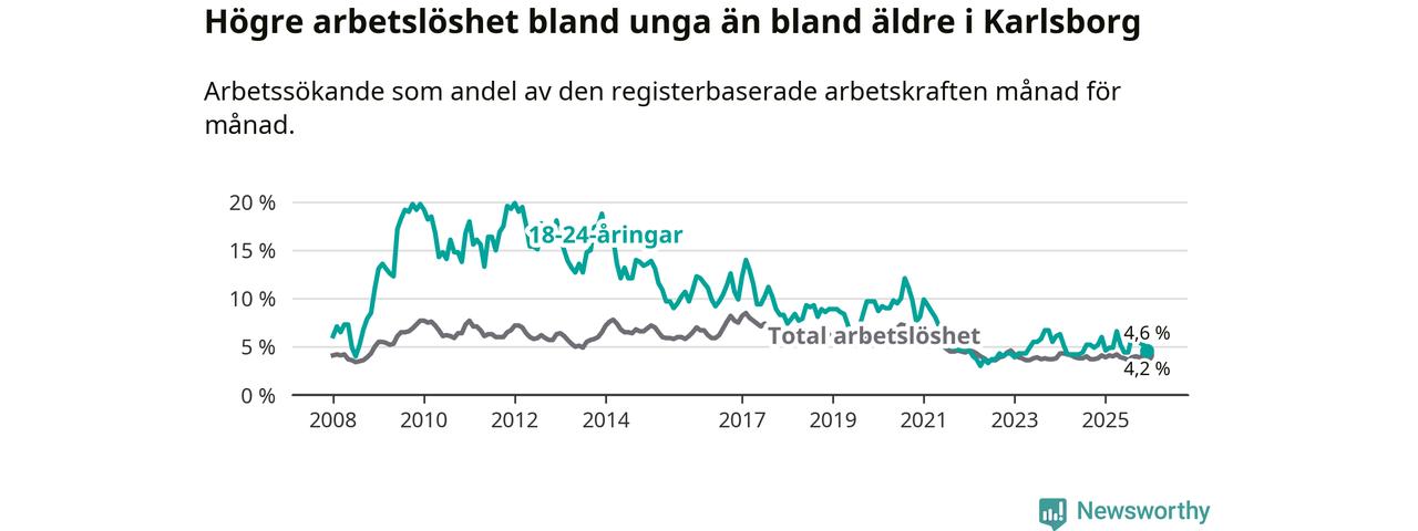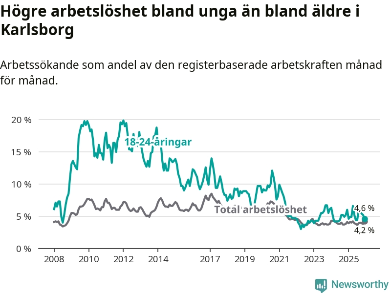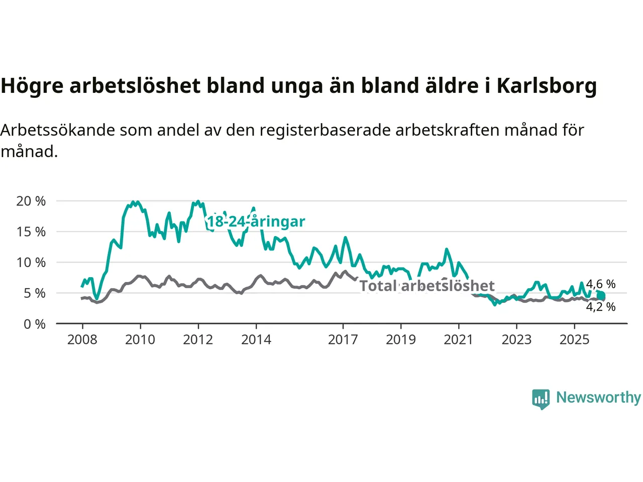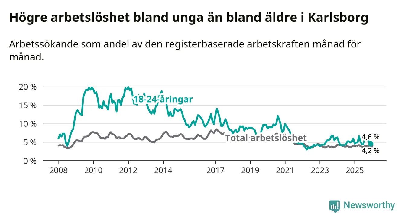 Till skillnad från den totala arbetslösheten sjunker arbetslösheten bland unga (−1,4 procentenheter). I december var 4,6 procent av 18–24-åringarna inskrivna som arbetssökande (motsvarande 17 personer). Mäter vi antalet inskrivna ser vi en minskning med fem personer på ett års sikt.