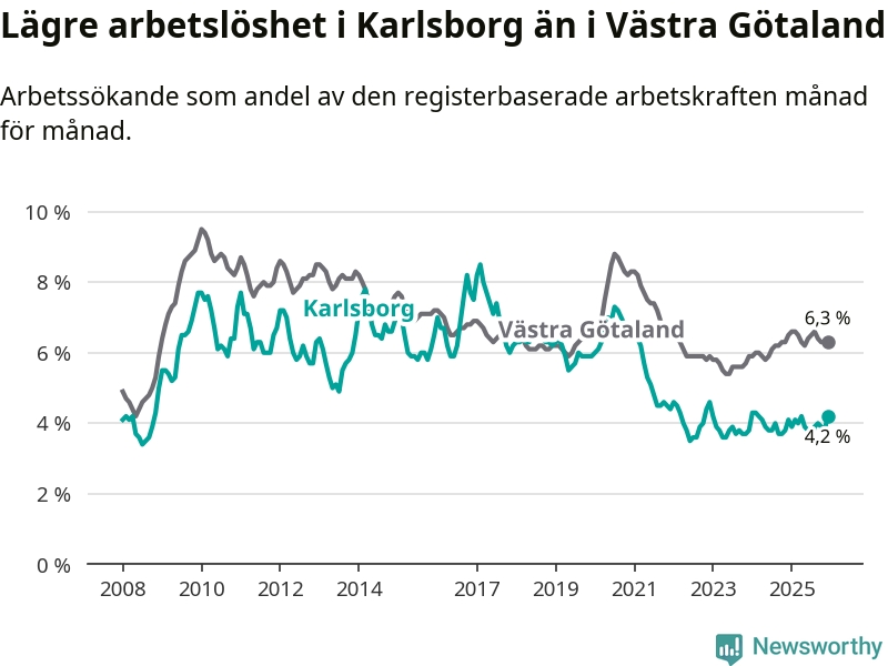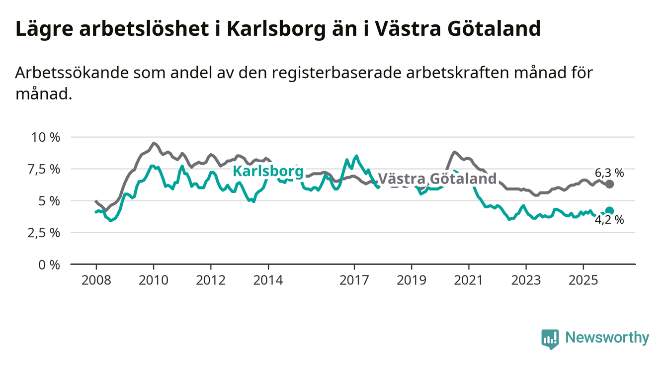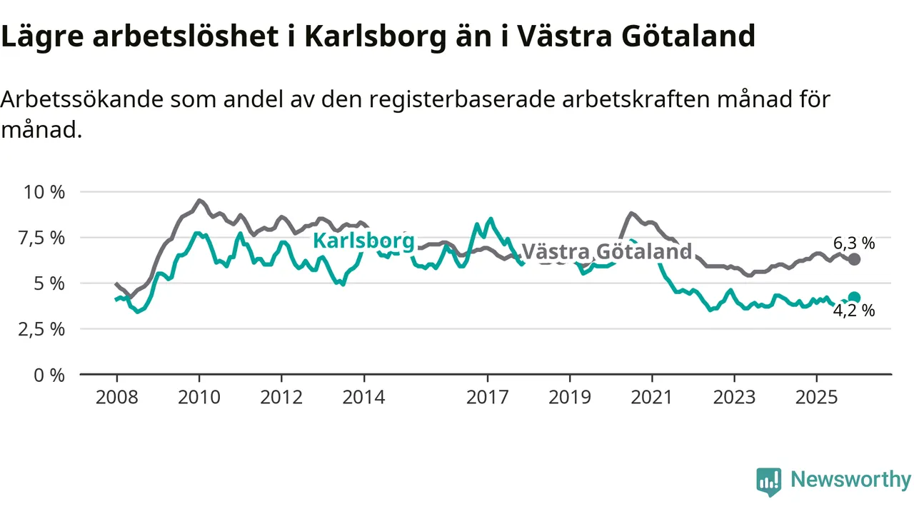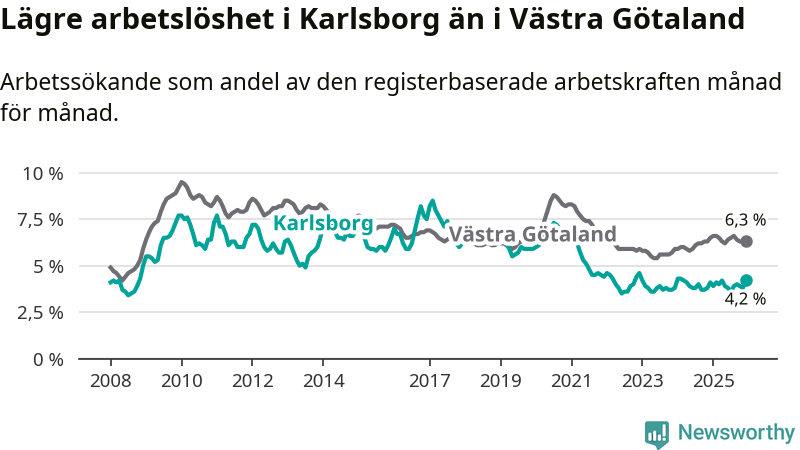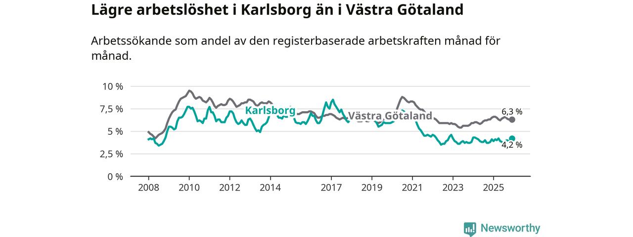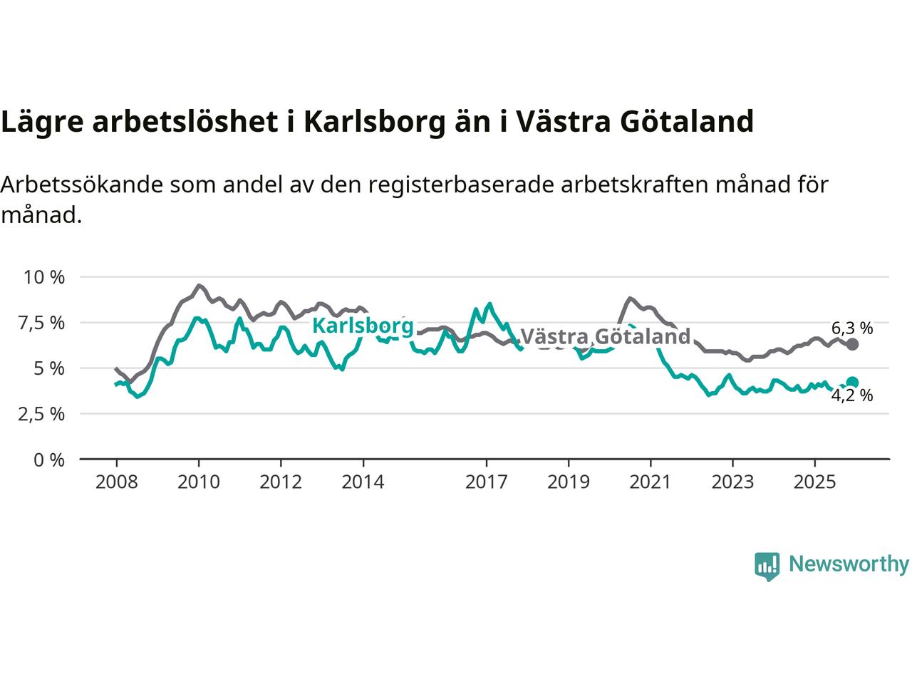 Även om arbetslösheten i Karlsborg alltså ökar, så ligger den fortfarande under snittet i hela Västra Götalands län (4,2 procent i kommunen, jämfört med 6,3 procent i hela länet). Öckerö har den lägsta arbetslösheten i länet (3,0 procent), medan Gullspång har den högsta (8,8 procent). För att Karlsborg skulle komma ner i samma arbetslöshetsnivå som Öckerö skulle 37 personer behöva sysselsättas.