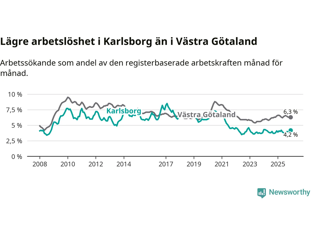 Under december månad rapporterade Karlsborgs kommun en total arbetslöshet på 4,2 procent. Det är en ökning jämfört med samma tidpunkt i fjol (+0,1 procentenheter). I Västra Götalands län däremot sjunker arbetslösheten .
