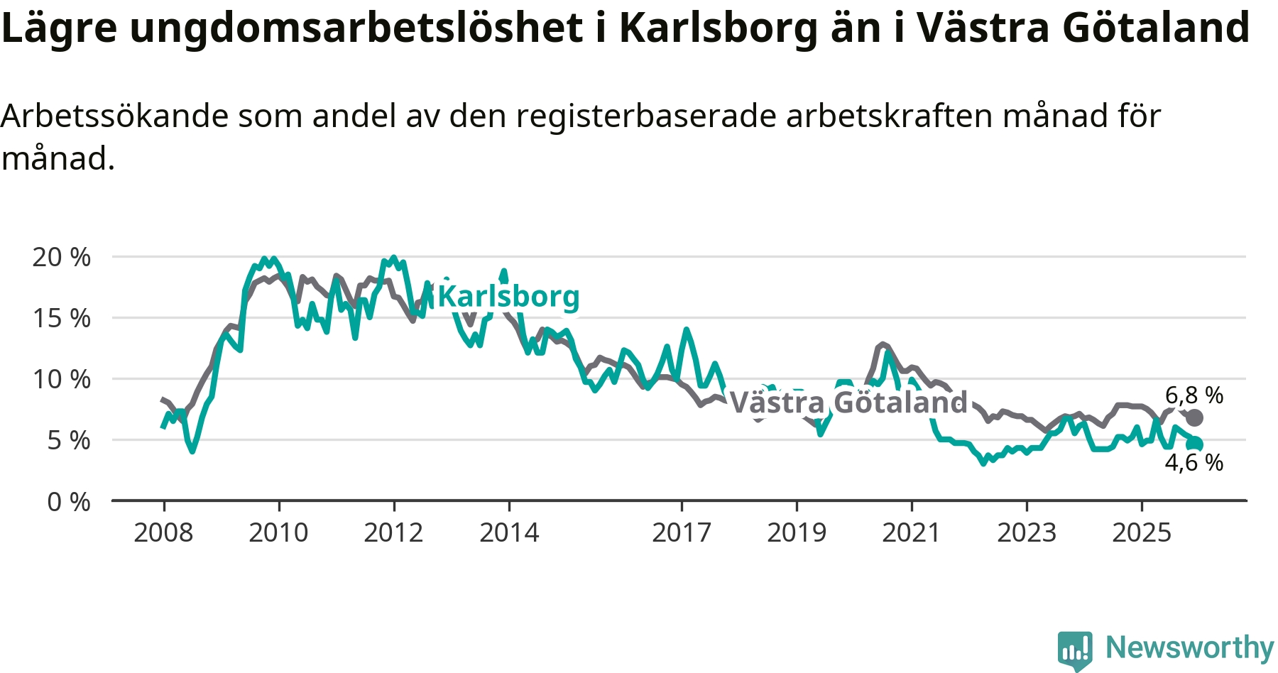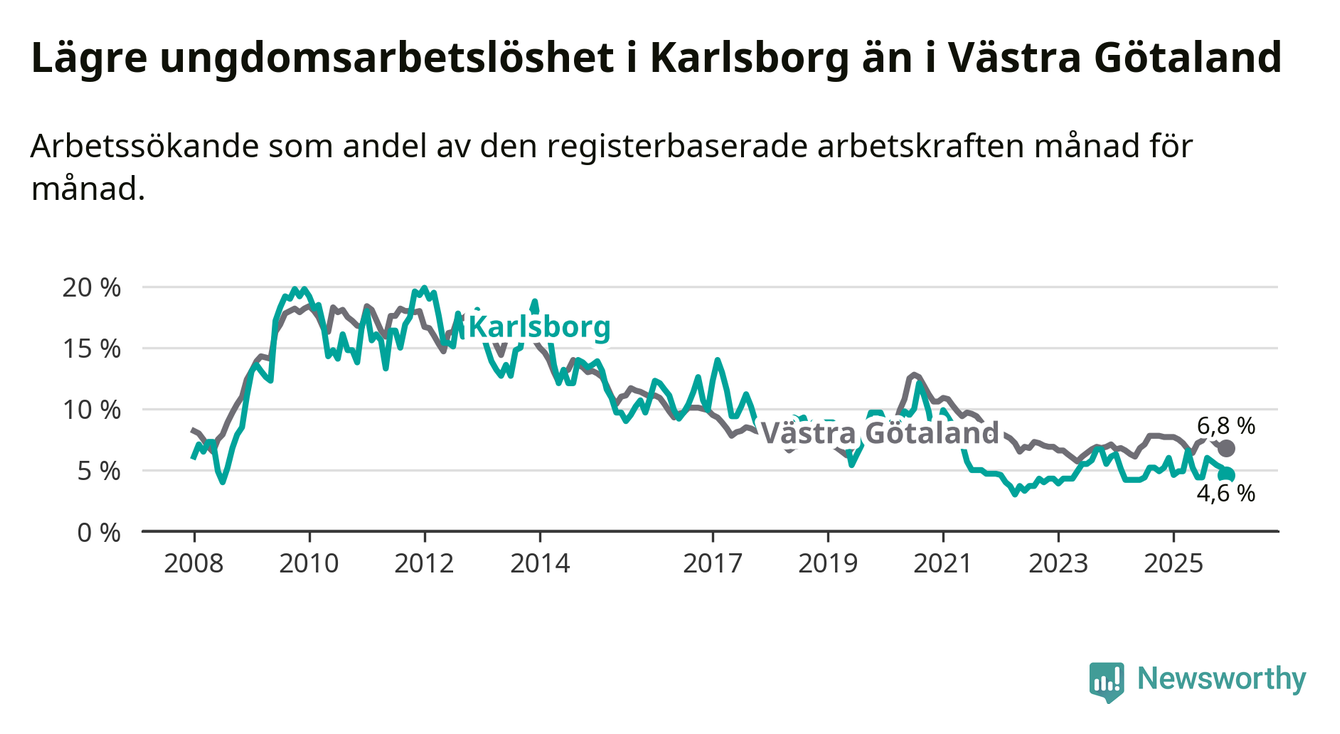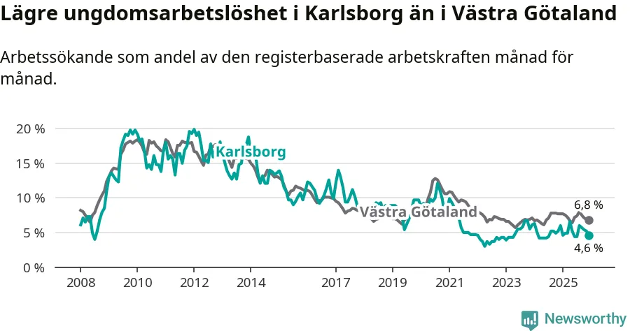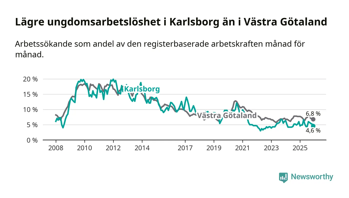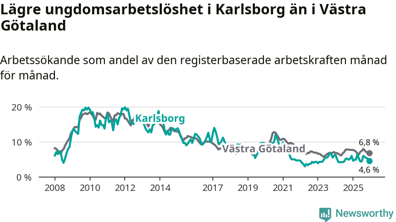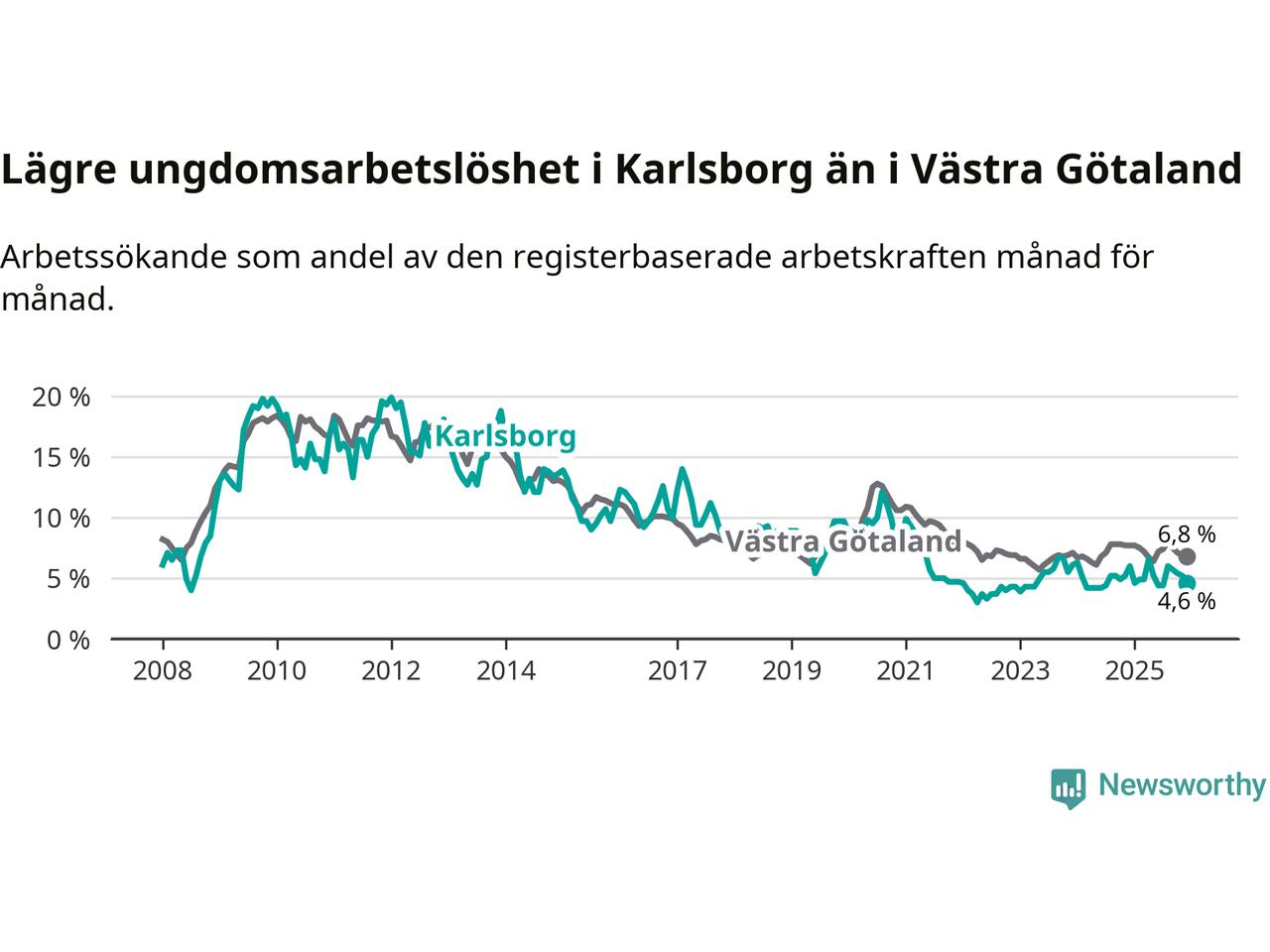 Precis som den totala arbetslösheten ligger ungdomsarbetslösheten i Karlsborg lägre än i Västra Götaland som helhet. Skillnaden mellan kommunen och länet är 2,2 procentenheter.