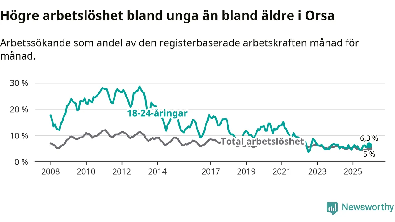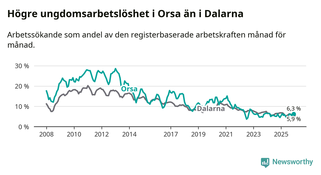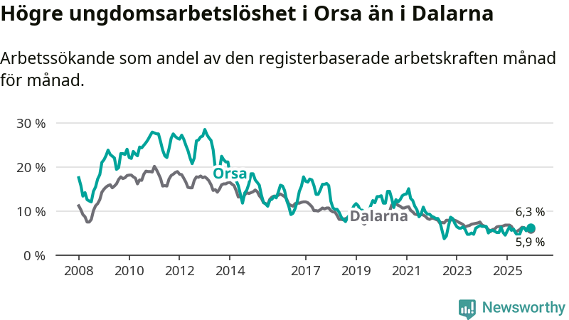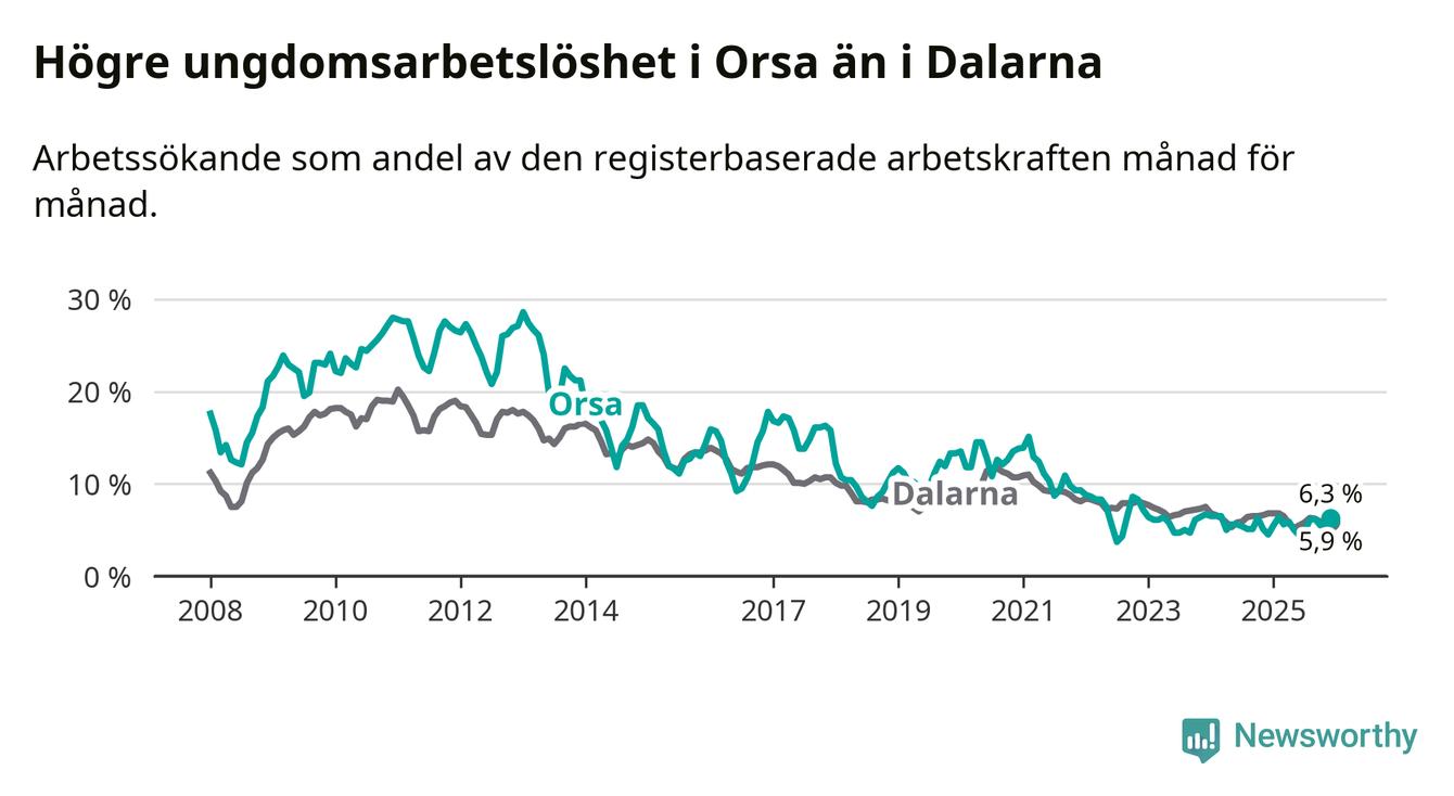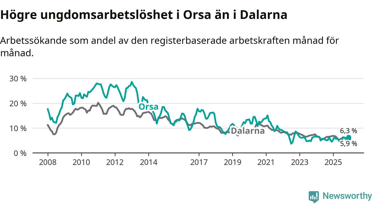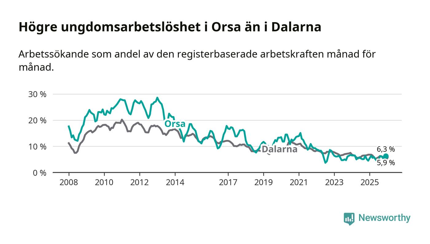 Medan Orsa har ungefär samma total arbetslöshet som Dalarna, ligger ungdomsarbetslösheten 0,4 procentenheter högre i Orsa.